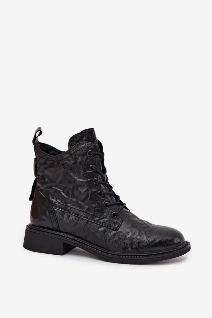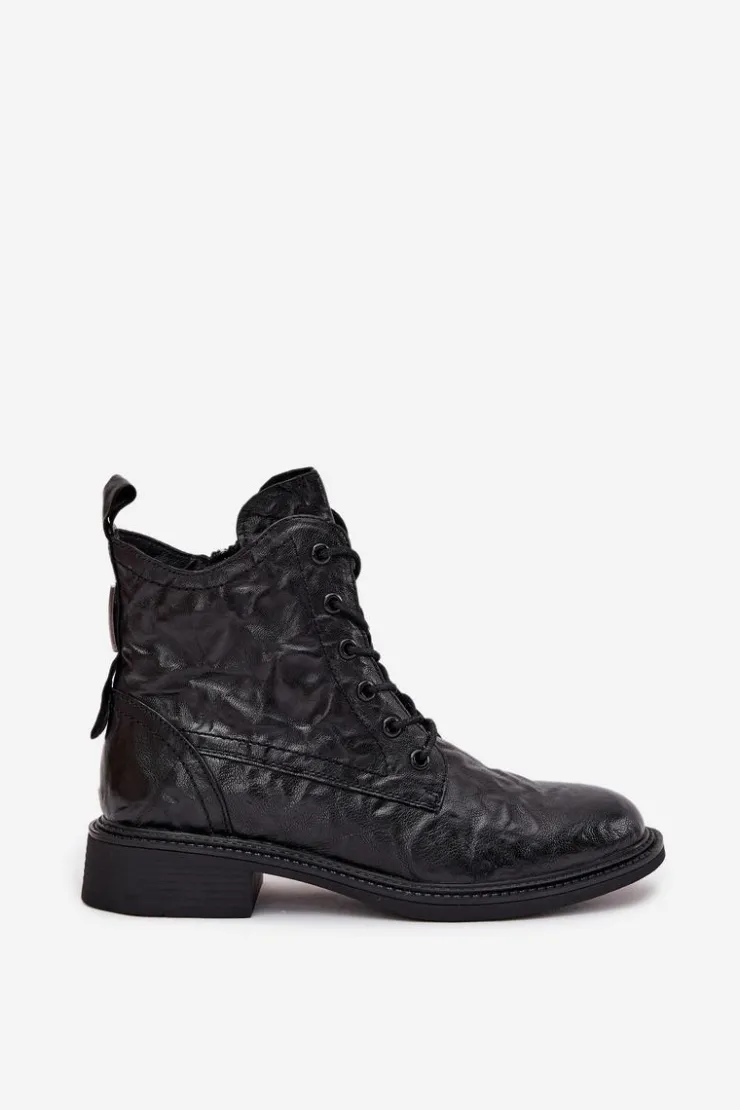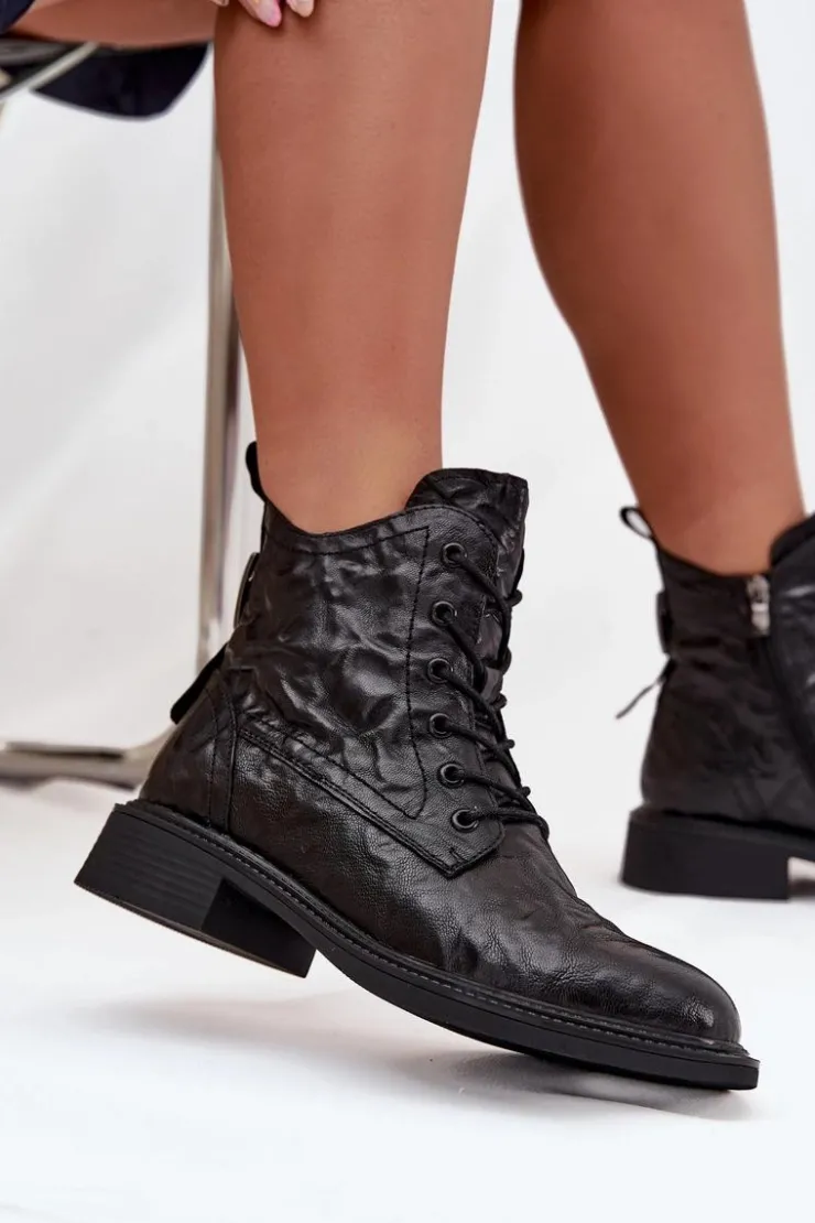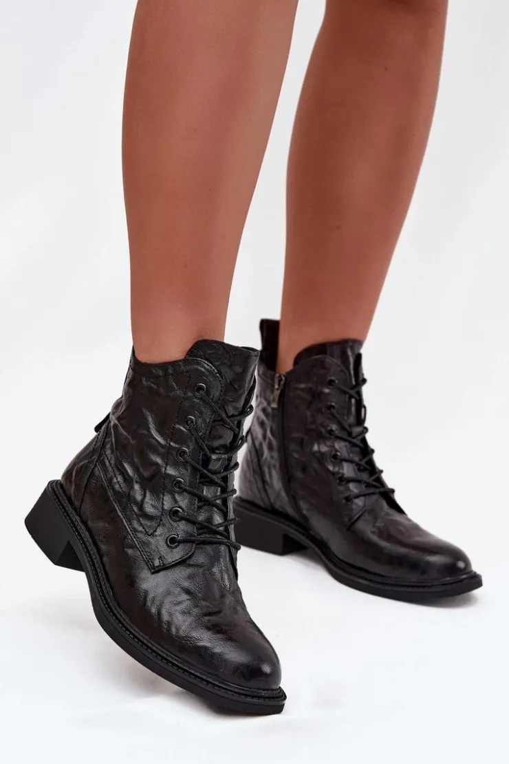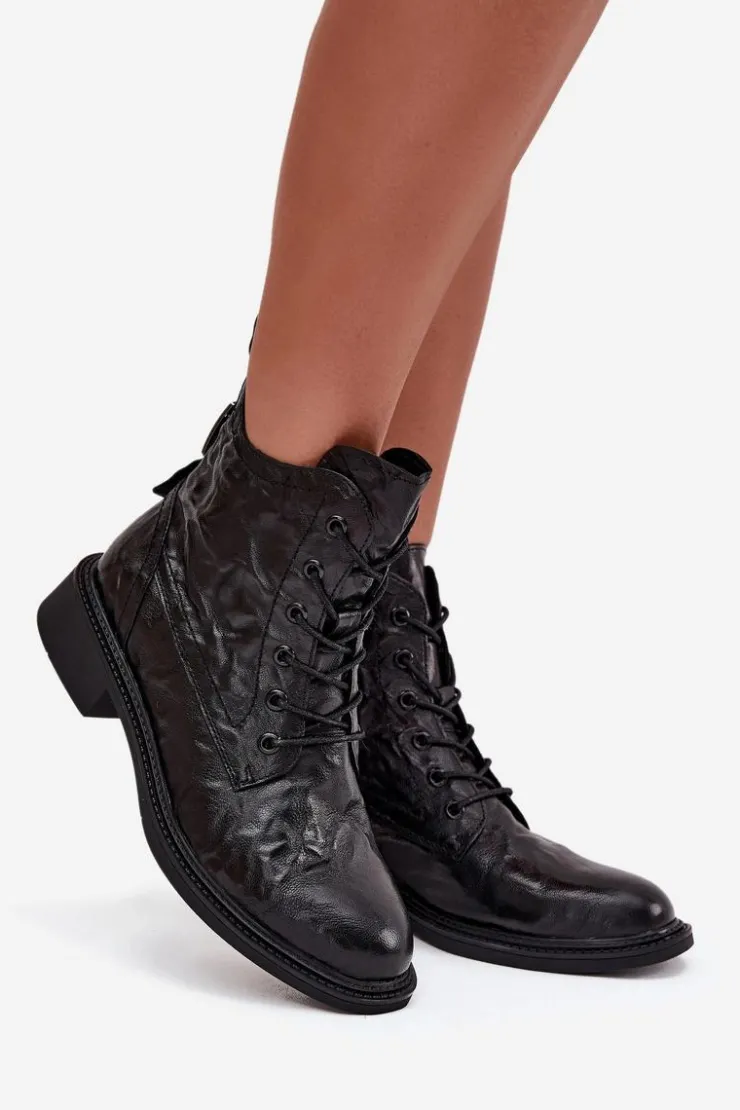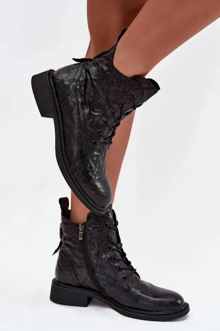 Botki damskie marki Artiker wykonane z naturalnej skóry to propozycja dla kobiet, które cenią sobie połączenie elegancji i wygody. Model posiada sznurowanie oraz boczny zamek, co sprawia, że buty łatwo dopasowują się do stopy i są wygodne w zakładaniu. Wnętrze ocieplone miękkim kocem obuwniczym zapewnia komfort termiczny w chłodniejsze dni, czyniąc je idealnym wyborem na jesień i zimę. Cholewka z efektem gniecenia nadaje całości oryginalnego, modnego charakteru, a ozdobny element z tyłu subtelnie podkreśla wyjątkowy design obuwia. Dzięki starannemu wykonaniu i dbałości o detale botki świetnie sprawdzą się zarówno w codziennych stylizacjach, jak i w bardziej eleganckich zestawach. Przy wyborze rozmiaru prosimy sugerować się tabelą rozmiarów.