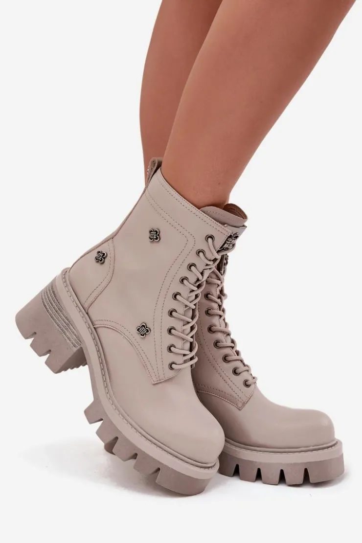 Botki damskie od marki Artiker. Wykonane z naturalnej skóry, prezentują się stylowo i są wyjątkowo trwałe. Model osadzony został na masywnym obcasie typu klocek oraz platformie, co zapewnia stabilność i wygodę podczas noszenia, jednocześnie dodając całości modnego charakteru. Buty są sznurowane i zapinane na zamek, dzięki czemu łatwo je dopasować do stopy i wygodnie zakładać. Na cholewce umieszczono ozdobne, drobne przypinki, które podkreślają unikalny styl modelu. Wnętrze zostało ocieplone, co sprawia, że botki świetnie sprawdzą się w chłodniejsze dni. To idealna propozycja dla kobiet, które cenią połączenie elegancji, komfortu i oryginalnego, miejskiego stylu. Przy wyborze rozmiaru prosimy sugerować się tabelą rozmiarów.