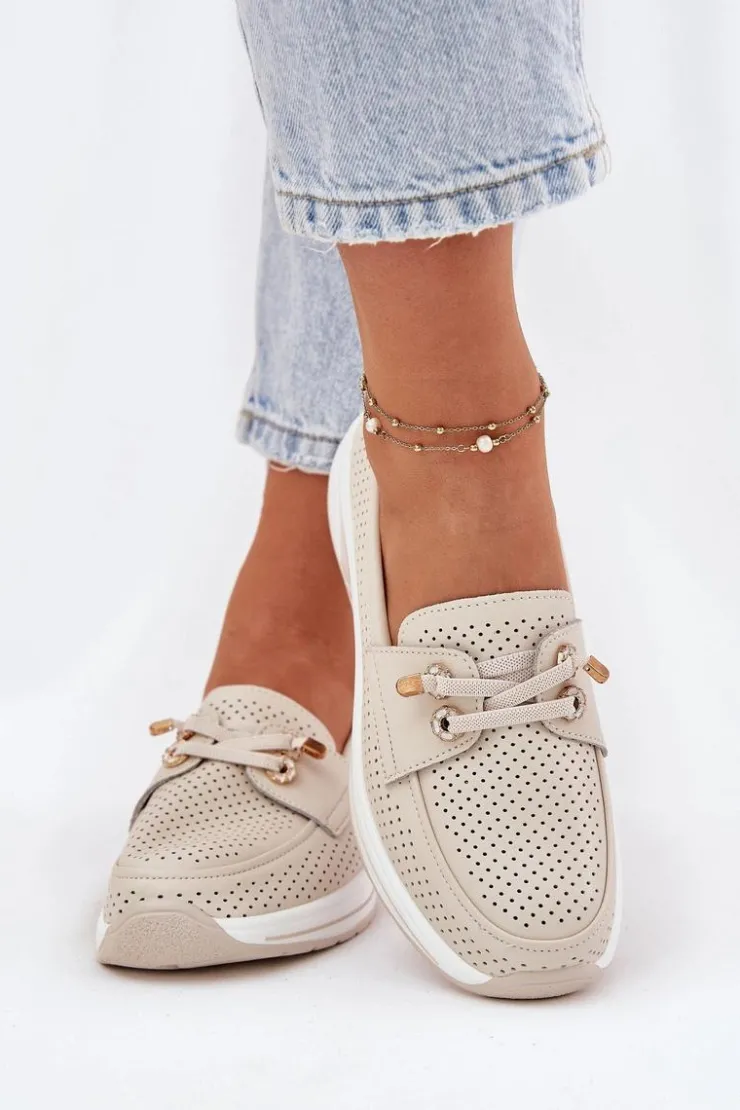 Półbuty damskie wykonane z naturalnej skóry to połączenie elegancji i wygody. Osadzone na platformie, zapewniają stabilność i komfort przez cały dzień. Model posiada gumki imitujące sznurówki z ozdobnymi przypinkami, które nadają oryginalnego charakteru. Zaokrąglone noski zapewniają wygodę, a miękka wkładka dodatkowo dba o komfort stóp. Lekkie i wygodne, te półbuty będą doskonałym wyborem do codziennych stylizacji, łącząc funkcjonalność z modnym wyglądem. Przy wyborze rozmiaru prosimy sugerować się tabelą rozmiarów.