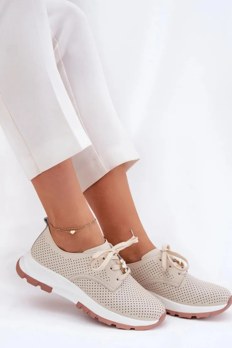 Półbuty damskie w sportowym stylu wykonane z naturalnej skóry to połączenie komfortu i modnego wyglądu. Osadzone na platformie, zapewniają lekkość i wygodę przez cały dzień. Sznurowanie ozdobione przypinką w kształcie kwiatuszków dodaje im urokliwego akcentu, a zaokrąglone noski gwarantują pełną swobodę ruchu. Skórzana wkładka dba o komfort stóp, czyniąc te półbuty doskonałym wyborem na co dzień. Przy wyborze rozmiaru prosimy sugerować się tabelą rozmiarów.