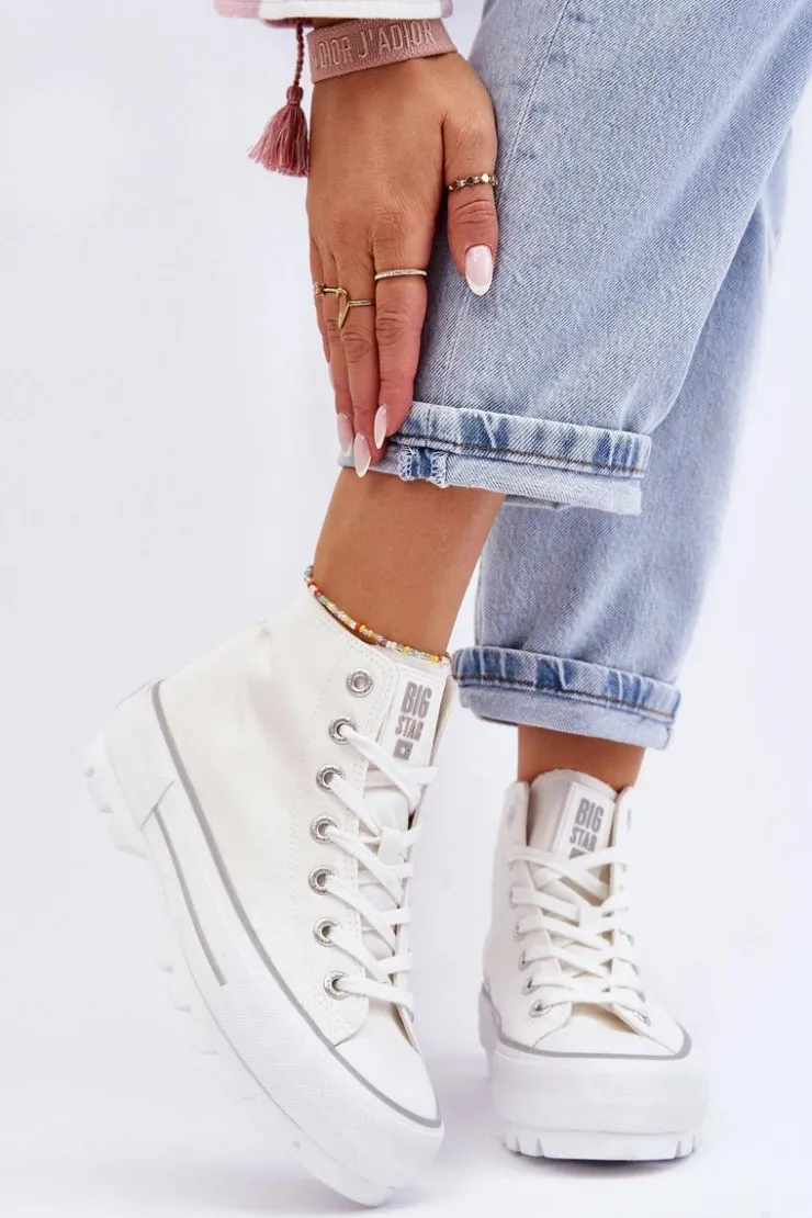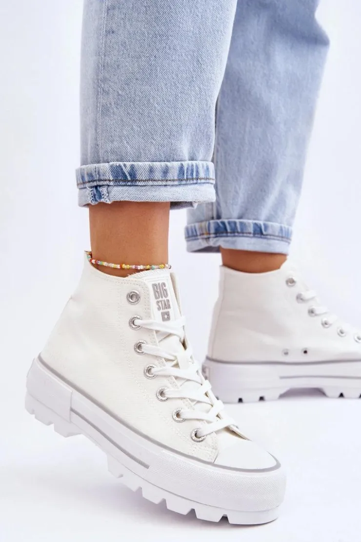Modne, wysokie trampki damskie od marki Big Star! Podeszwa z wysokim bieżnikiem oraz cholewka wykonana z materiału tekstylnego za kostkę. Trampki te dodatkowo posiadają delikatnie usztywniany zapiętek. Platforma wraz z podeszwą zostały wykonane z gumowego tworzywa. Przy wyborze rozmiaru prosimy sugerować się tabelą rozmiarów.