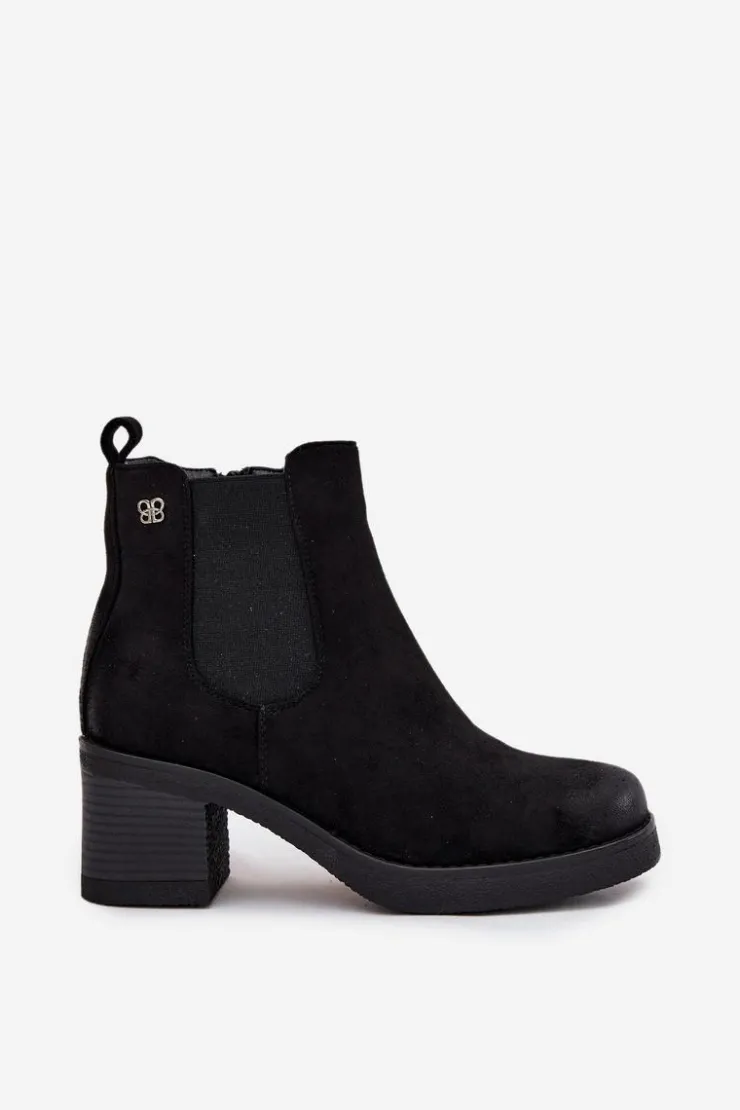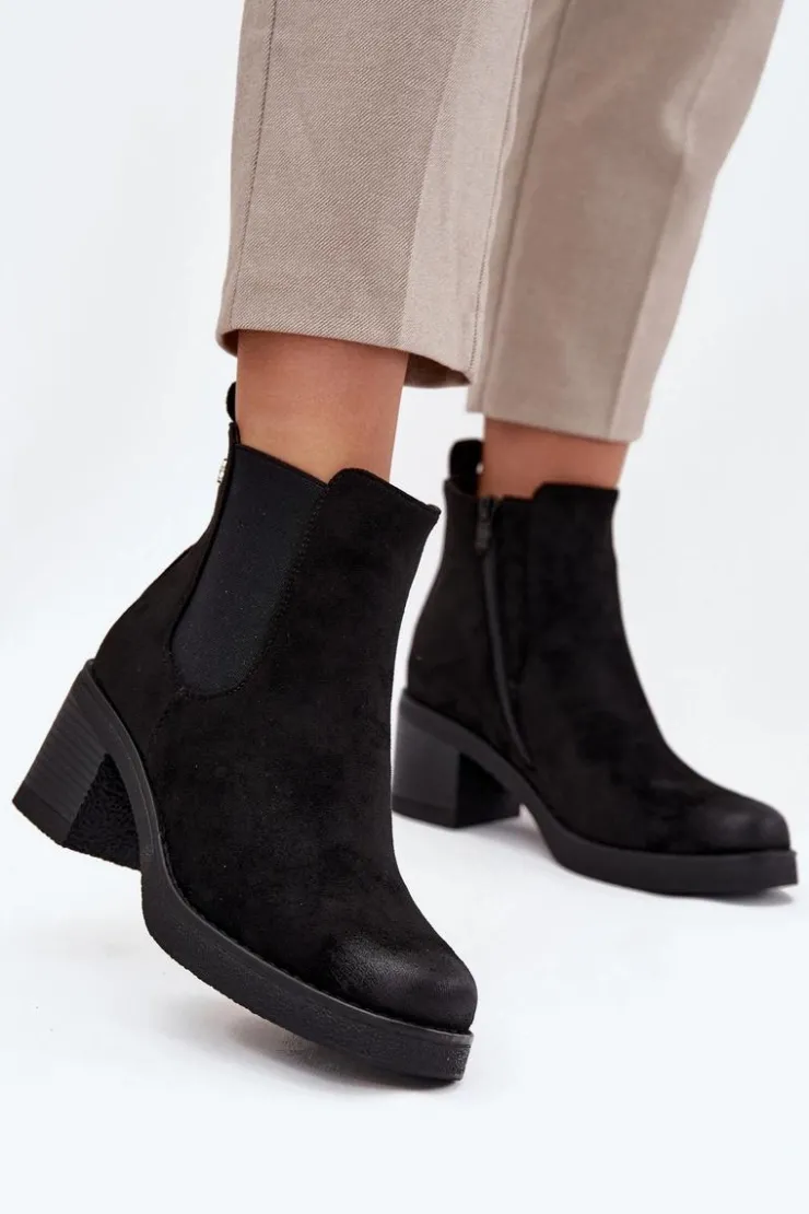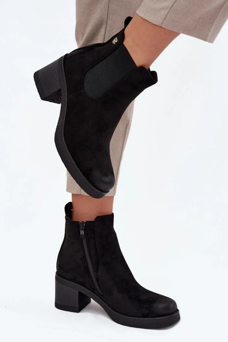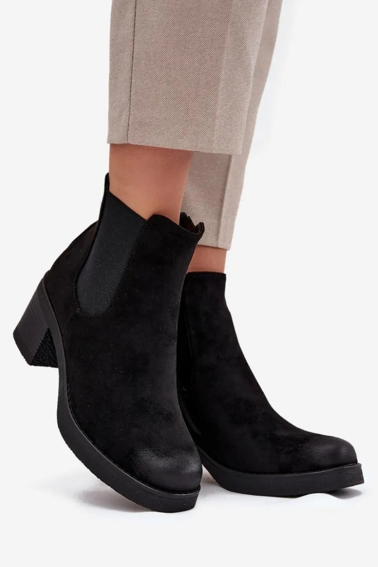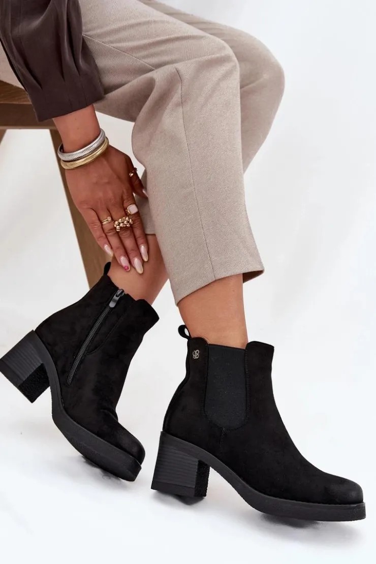 Botki damskie wykonane z eko zamszu. Osadzone na obcasie w formie słupka, który zapewnia stabilność i komfort przez cały dzień. Ocieplane, gwarantują ciepło w chłodniejsze dni, a zamek błyskawiczny ułatwia zakładanie. Z boku cholewki znajduje się subtelny, złoty detal, który dodaje im eleganckiego akcentu. Idealne do codziennych stylizacji, które wymagają zarówno wygody, jak i modnego wyglądu. Przy wyborze rozmiaru prosimy sugerować się tabelą rozmiarów.