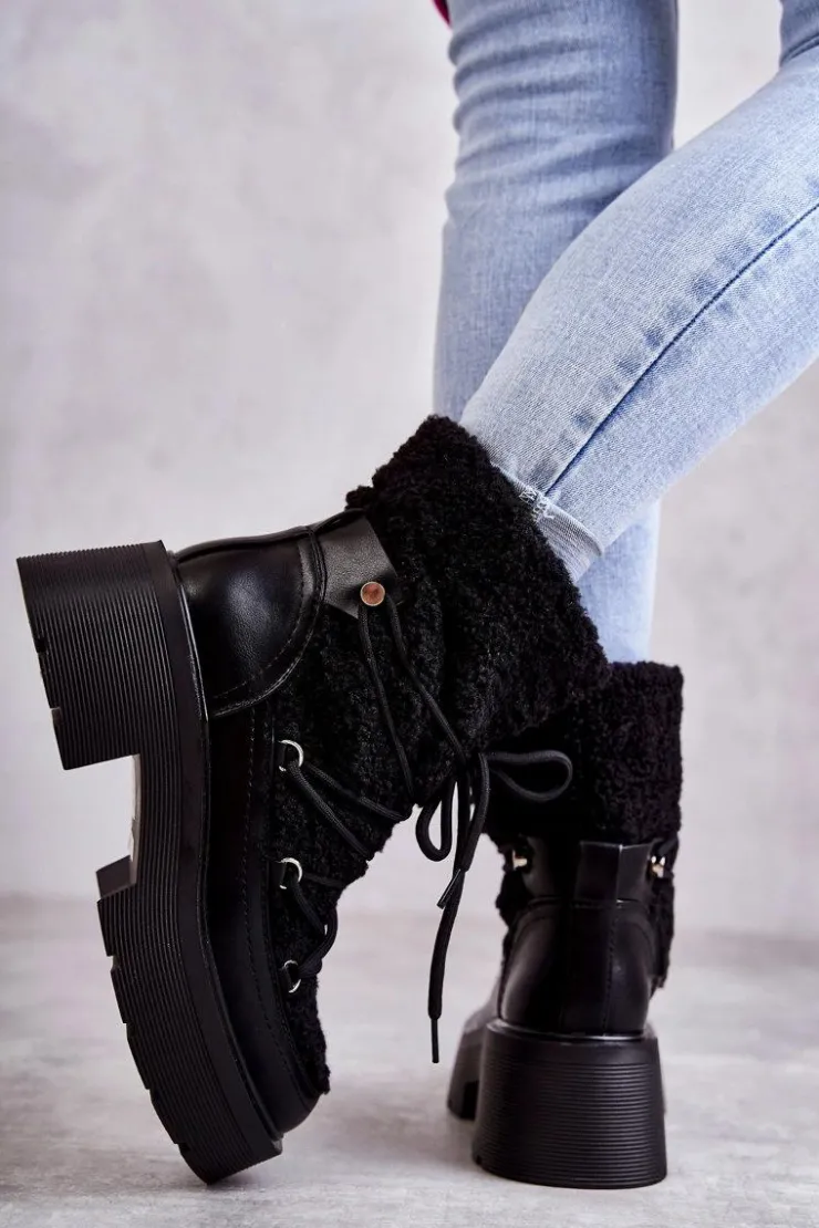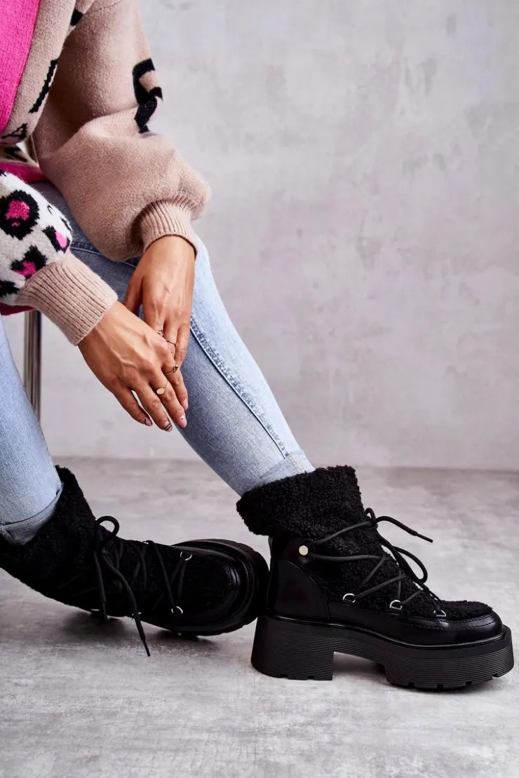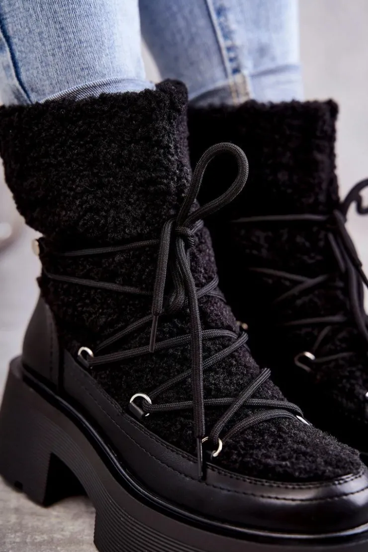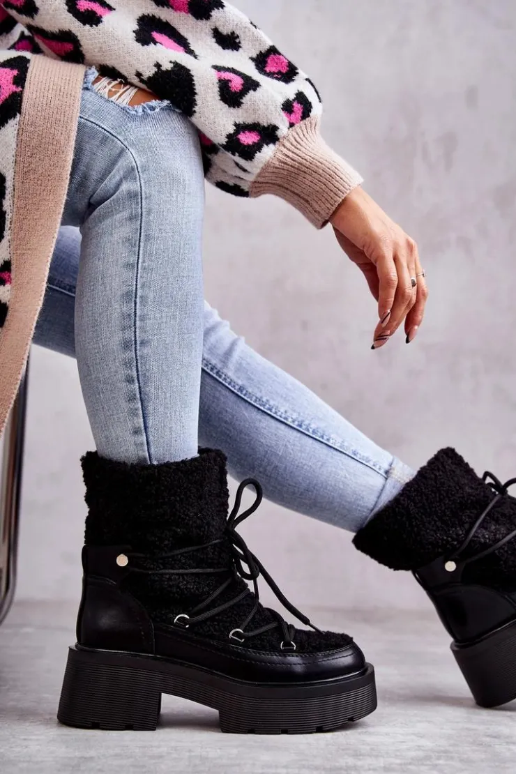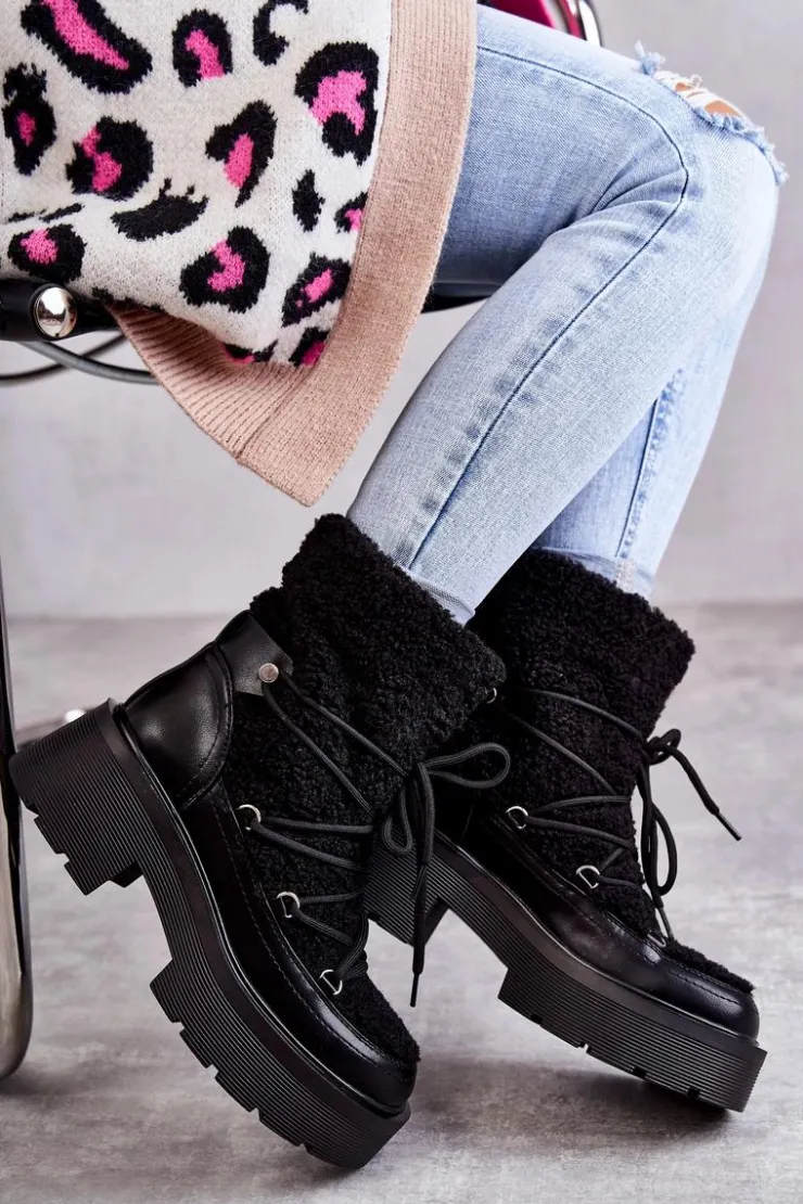 Cudowne botki w formie śniegowców zostały wykonane z materiału przypominającego kożuszek oraz eko skóry. Model klasycznie sznurowany. Botki zostały osadzone na płaskim obcasie i masywnej platformie. Posiadają w środku ocieplenie w postaci koca obuwniczego. Antypoślizgowa podeszwa zapewni stabilność na każdym kroku! Przy wyborze rozmiaru prosimy sugerować się tabelą rozmiarów.