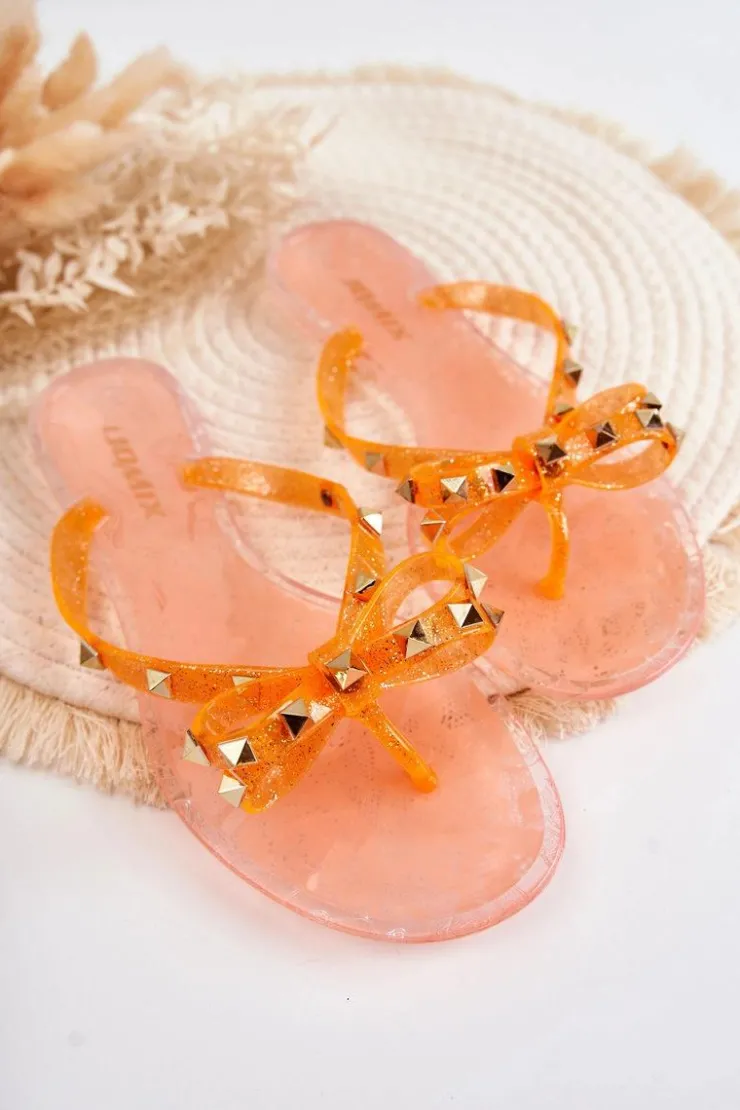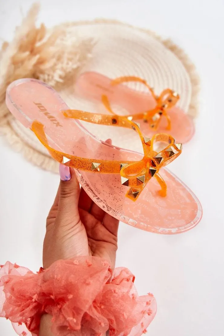 Wyjątkowe klapki o fasonie japonek zostały wykonane z gumowego tworzywa. Posiadają ozdobne elementy na paskach w postaci ćwieków. Na przodzie znajduje się urocza kokardka. Wkładka została wykonana z tworzywa sztucznego. Buty osadzone na płaskim obcasie. Ten model świetnie sprawdzi się podczas upalnych dni! Koniecznie musisz je mieć!
