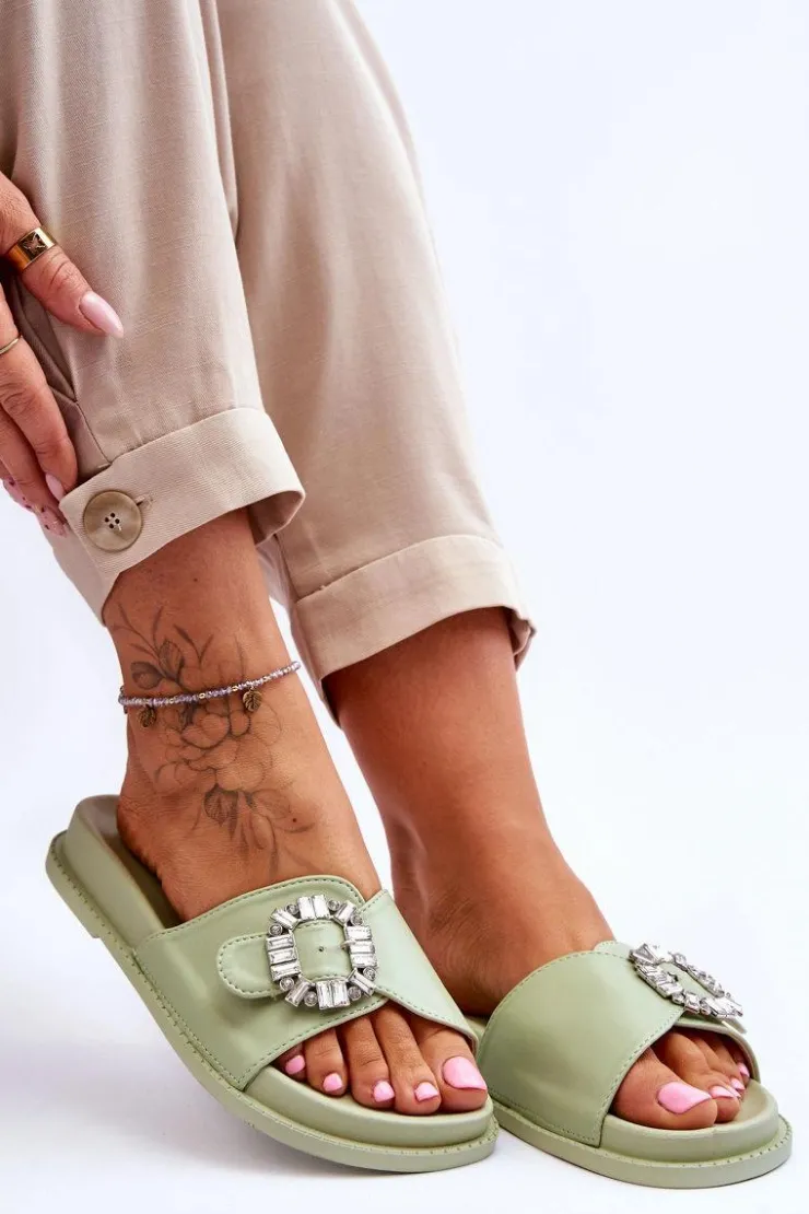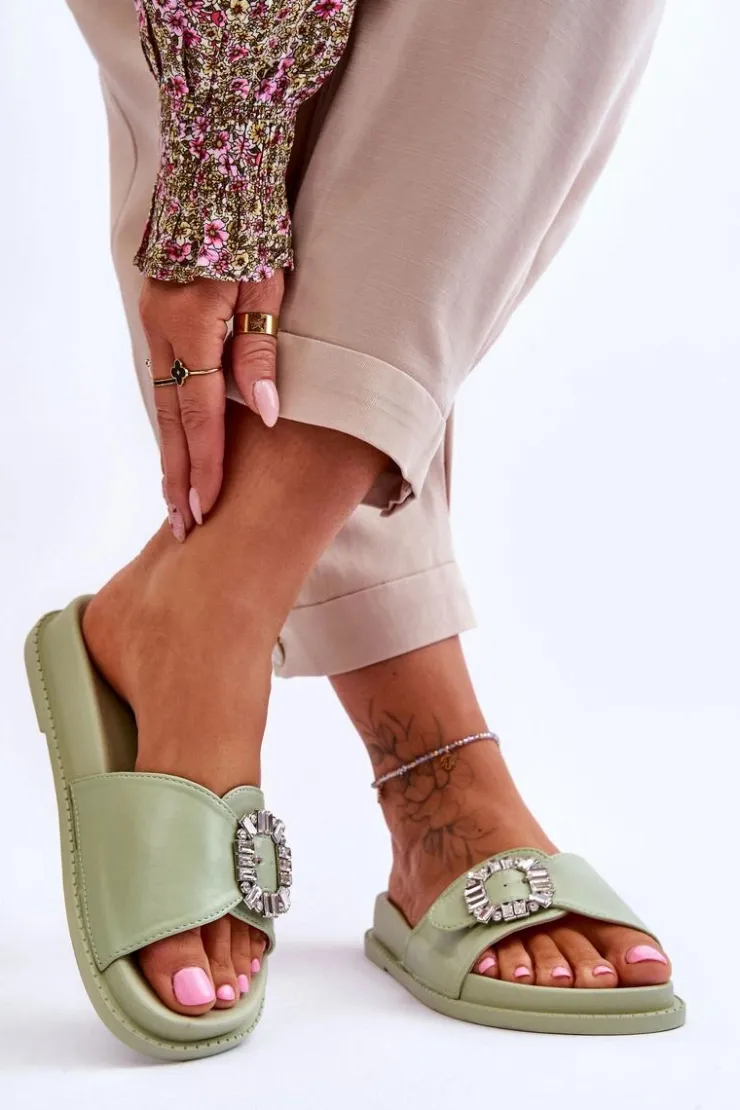 Klapki damskie zostały wykonane z eko skóry. Model ten posiada pasek zapinany na sprzączkę, który można regulować. Ozdobna klamra dodaje elegancji. Klapki są idealne na letnie spacery oraz codzienne wyjścia na zakupy. Wkładka wraz z podeszwą zostały wykonane z tworzywa sztucznego. Przy wyborze rozmiaru prosimy sugerować się tabelą rozmiarów.