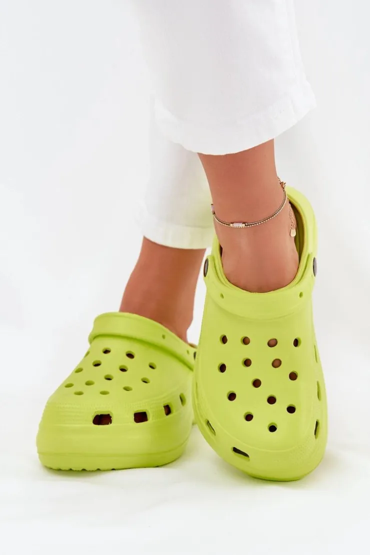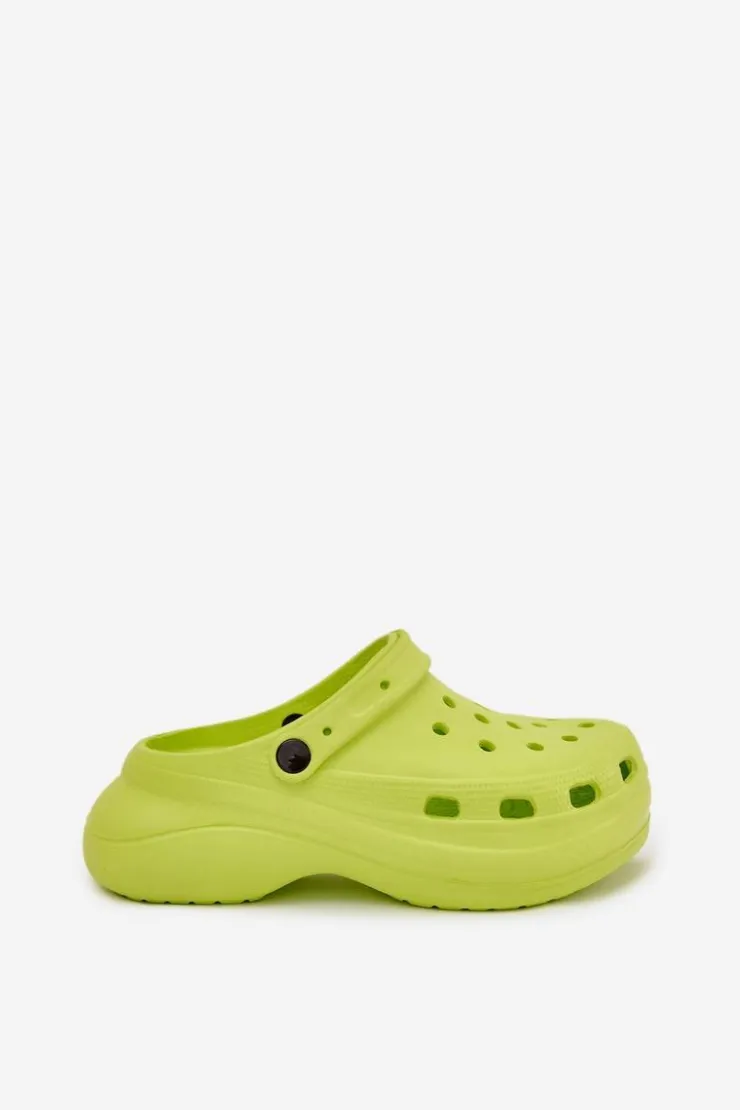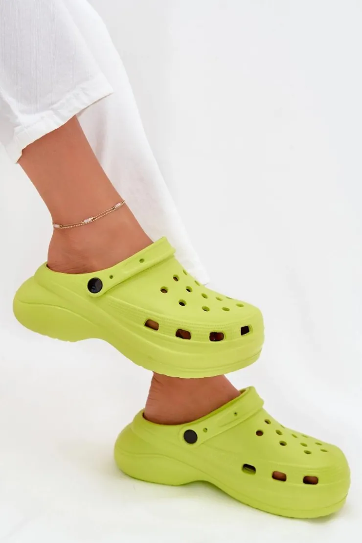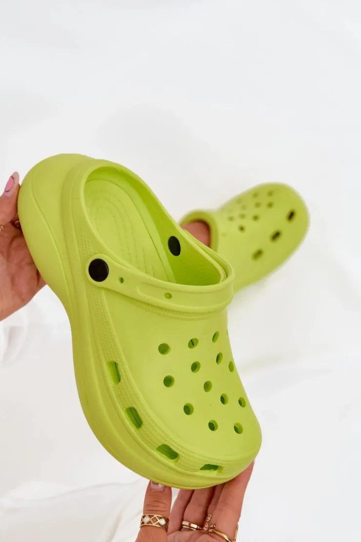 Damskie klapki wykonane z piankowego tworzywa. Wkładka z wypustkami sprawia, że stopy nie będą już takie zmęczone, nawet po całym dniu użytkowania. Ruchomy paseczek zabezpiecza przed przesuwaniem się stopy. Buty zostały osadzone na masywnym obcasie oraz platformie. Idealny model do pracy w ogrodzie czy użytkowania w domu zamiast papci. Otwory w cholewce pozwalają na odpowiednią wentylację obuwia. Przy wyborze rozmiaru prosimy sugerować się tabelą rozmiarów.