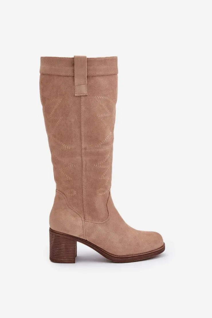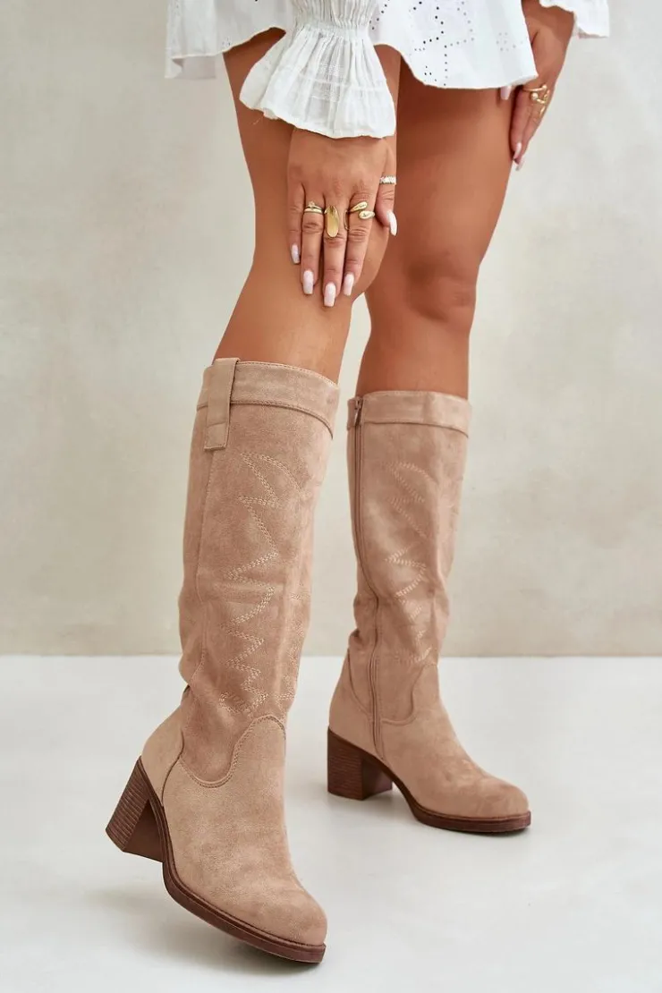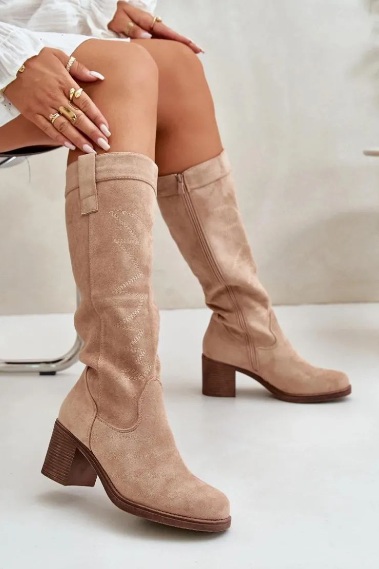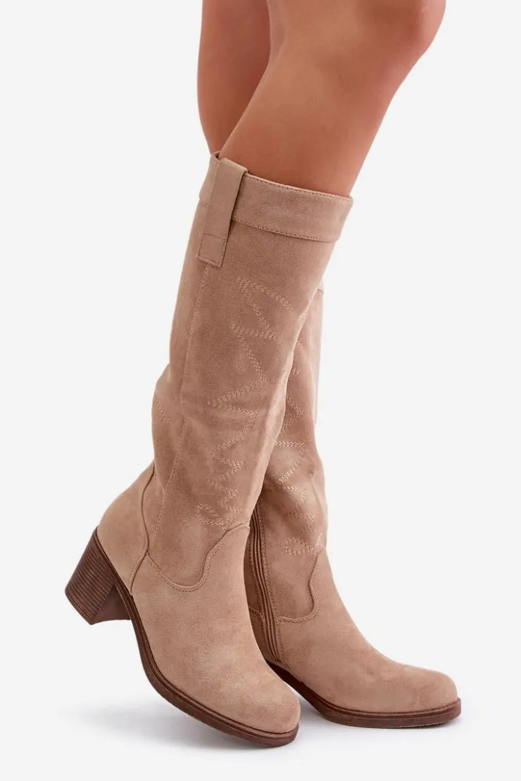 Damskie kozaki przed kolano wykonane z eko zamszu. Osadzone na obcasie w postaci niskiego słupka. Noski zaokrąglone. Cholewka ozdobiona przeszyciami. Model zapinany na zamek. Świetne do jesiennych stylizacji! Przy wyborze rozmiaru prosimy sugerować się tabelą rozmiarów.