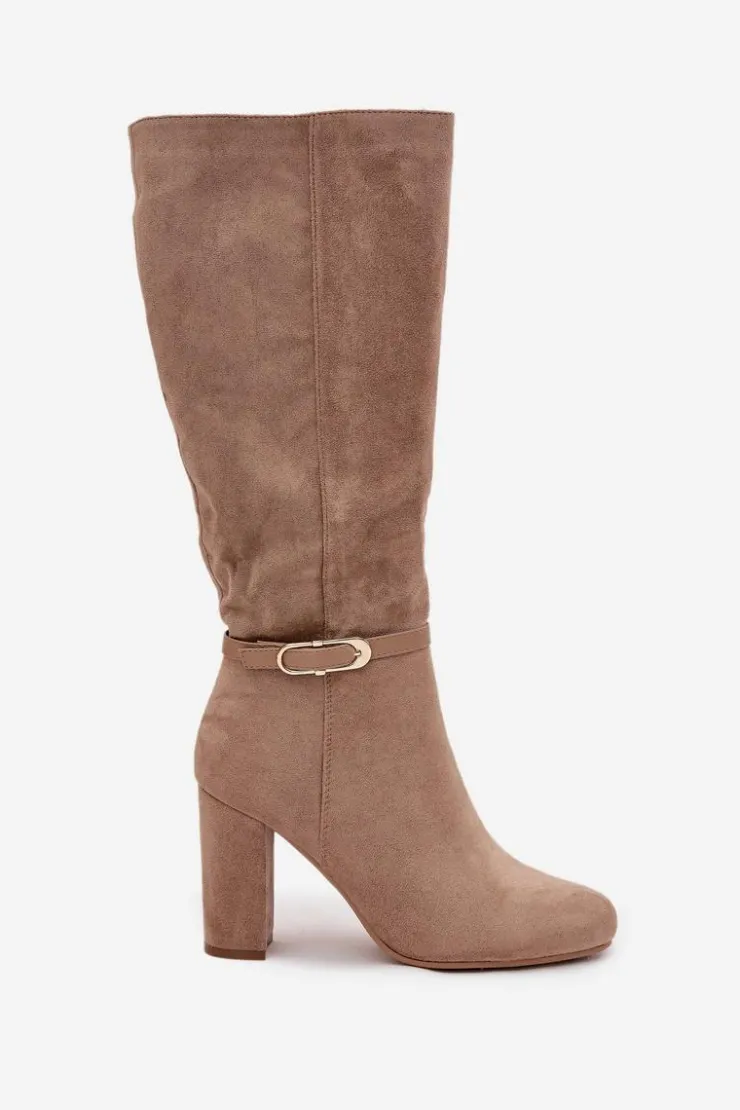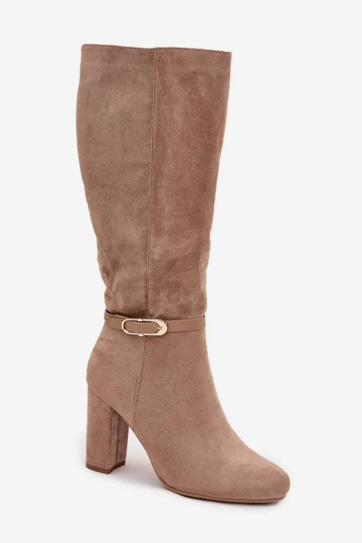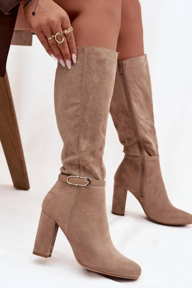 Kozaki damskie wykonane z eko zamszu to elegancka propozycja, która świetnie sprawdzi się w sezonie jesienno-zimowym. Klasyczny fason został urozmaicony subtelnym paseczkiem ze złotą klamrą umieszczonym na cholewce, co nadaje całości szyku i kobiecego charakteru. Model osadzony został na stabilnym obcasie typu słupek, który wysmukla sylwetkę, a jednocześnie zapewnia wygodę podczas noszenia. Zaokrąglone noski podkreślają ponadczasowy styl butów, a wnętrze ocieplone miękkim kocem obuwniczym gwarantuje komfort i ciepło w chłodniejsze dni. To kozaki, które doskonale dopełnią eleganckie stylizacje, ale równie dobrze sprawdzą się w codziennym wydaniu. Przy wyborze rozmiaru prosimy sugerować się tabelą rozmiarów.