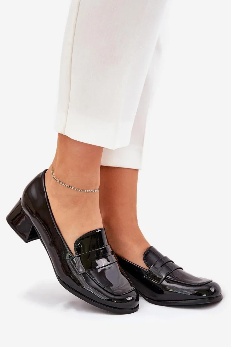 Czółenka z lakierowanej eko skóry, osadzone na niskim obcasie. Noski zaokrąglone zapewniają komfort przez cały dzień, a miękka wkładka dodaje dodatkowej wygody. Z przodu znajduje się paseczek z wycięciem. Te czółenka będą doskonałym wyborem na co dzień, pasując do eleganckich oraz casualowych stylizacji. Przy wyborze rozmiaru prosimy kierować się tabelą rozmiarów