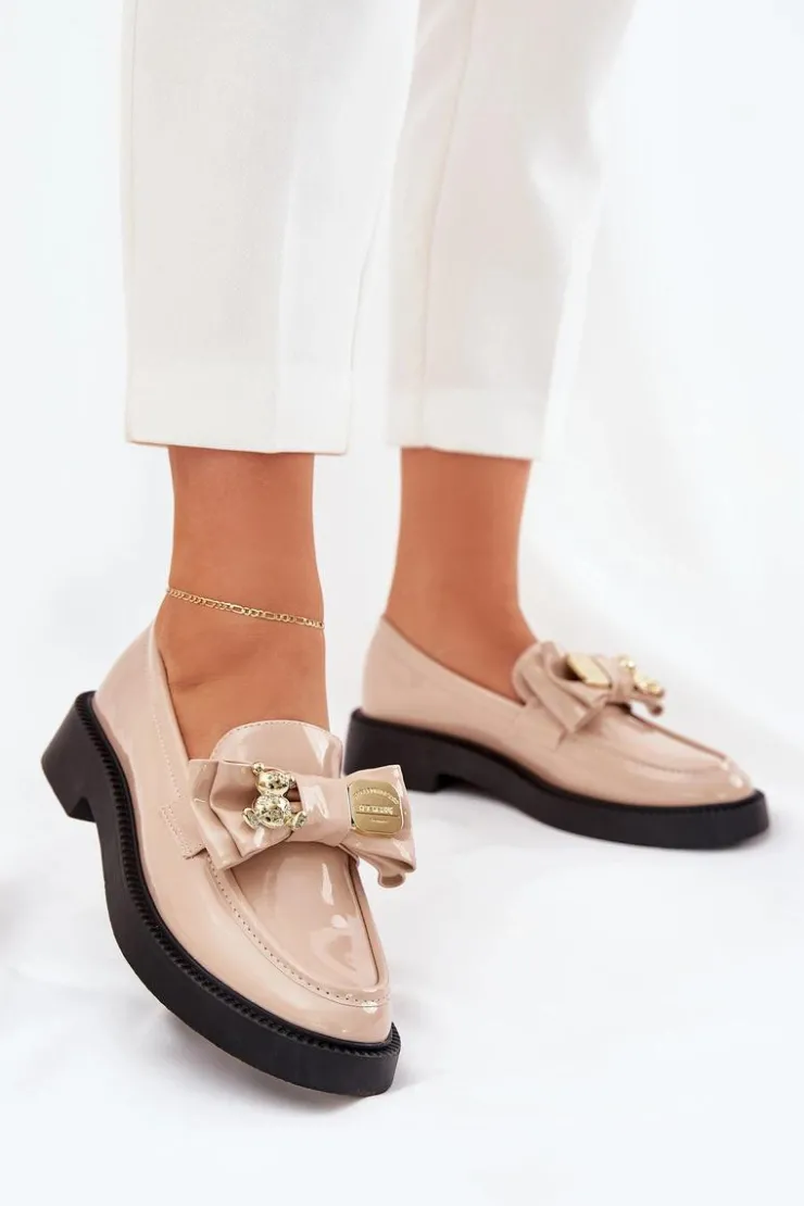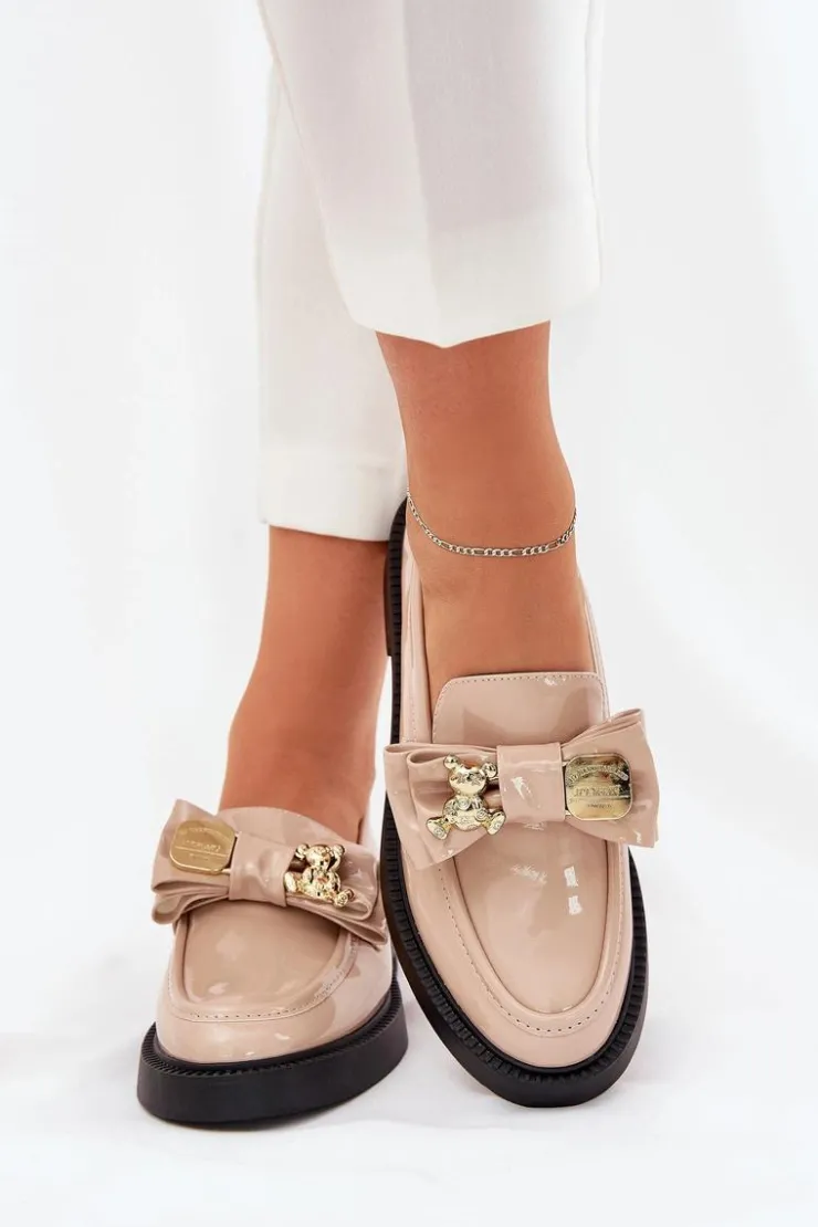 Modne mokasyny z eko skóry, które łączą elegancję z urokiem detali. Model posiada kokardkę z ozdobną broszką, która zdobi buty napisem i misiem, nadając im wyjątkowego charakteru. Zaokrąglone noski zapewniają komfort przez cały dzień, a klasyczny fason sprawia, że te mokasyny będą doskonałym wyborem do wielu stylizacji. Idealne na co dzień, łączą wygodę z modnym wyglądem. Przy wyborze rozmiaru prosimy sugerować się tabelą rozmiarów.