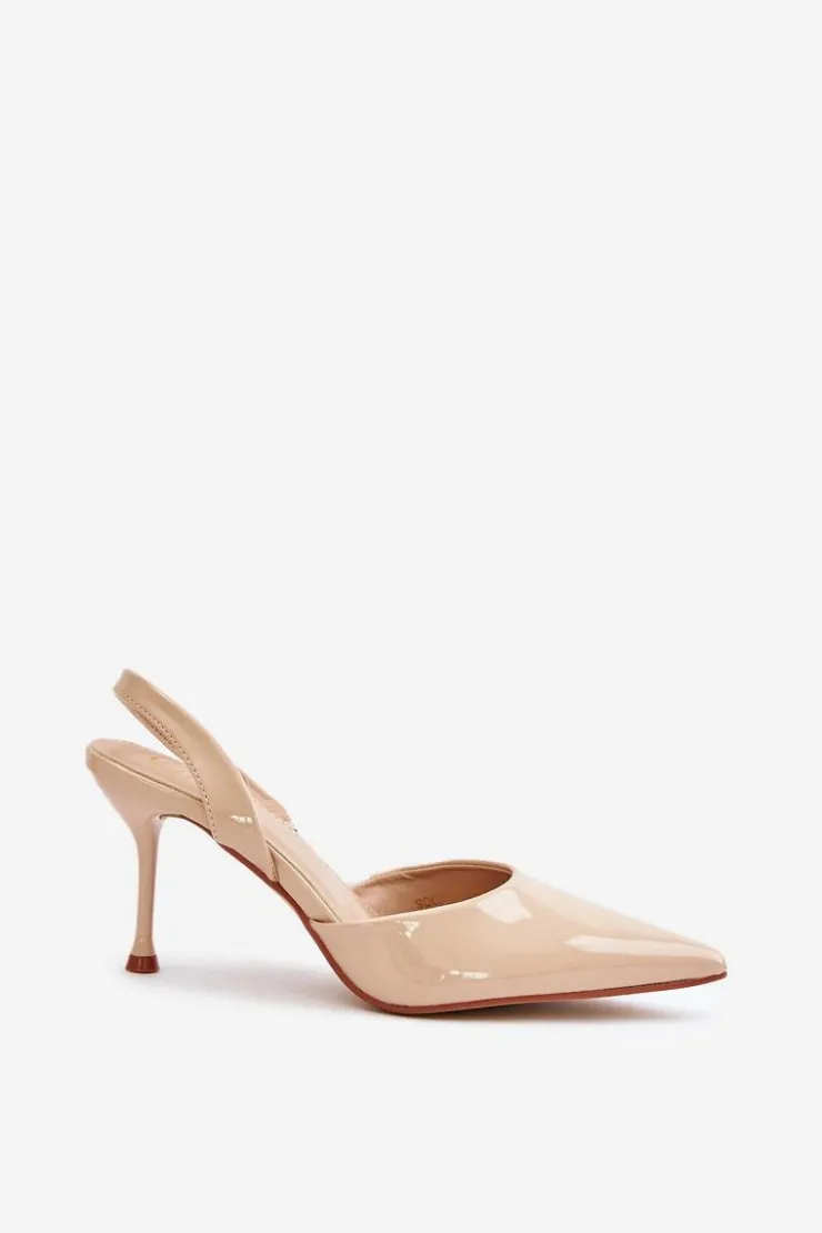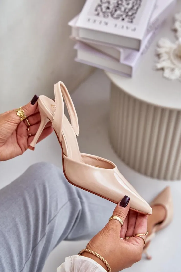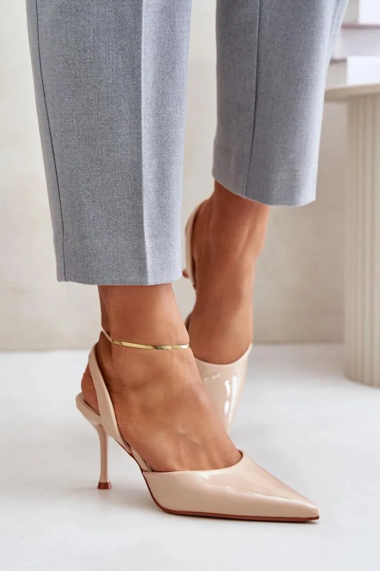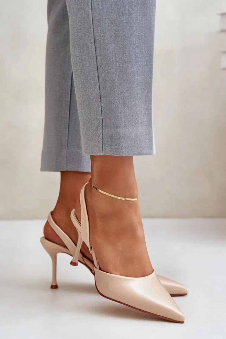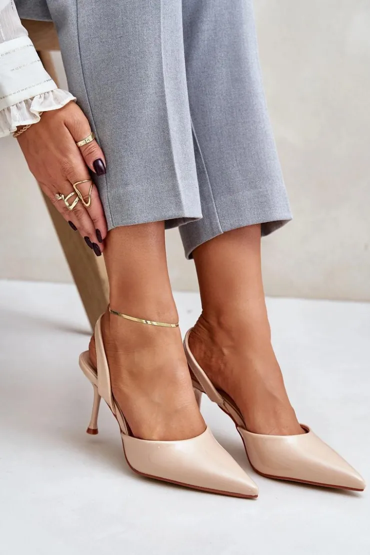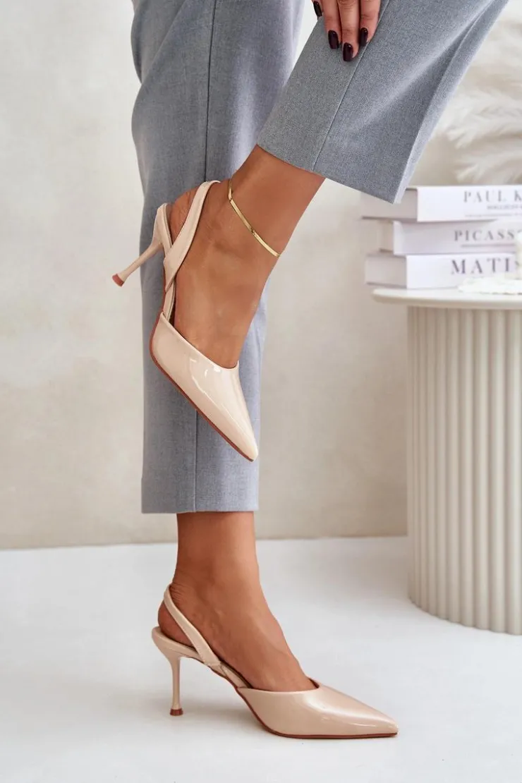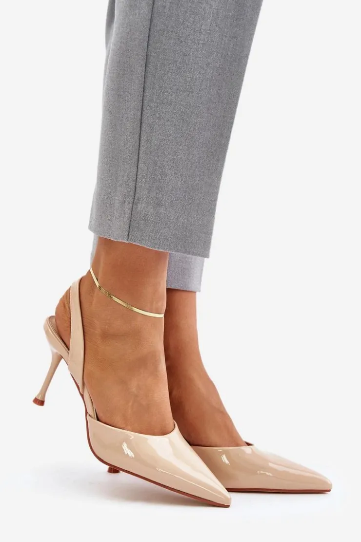 Szpilki z eko skóry to idealny wybór na specjalne okazje i wieczorne wyjścia. Klasyczne noski w szpic nadają im wyrafinowanego charakteru, optycznie wydłużając nogi. Z tyłu buta znajduje się pasek z gumką, który zapewnia lepsze dopasowanie do stopy, gwarantując komfort noszenia. Idealne do eleganckich sukienek oraz stylowych garniturów, te szpilki łączą w sobie szyk i wygodę. Przy wyborze rozmiaru prosimy sugerować się tabelą rozmiarów.