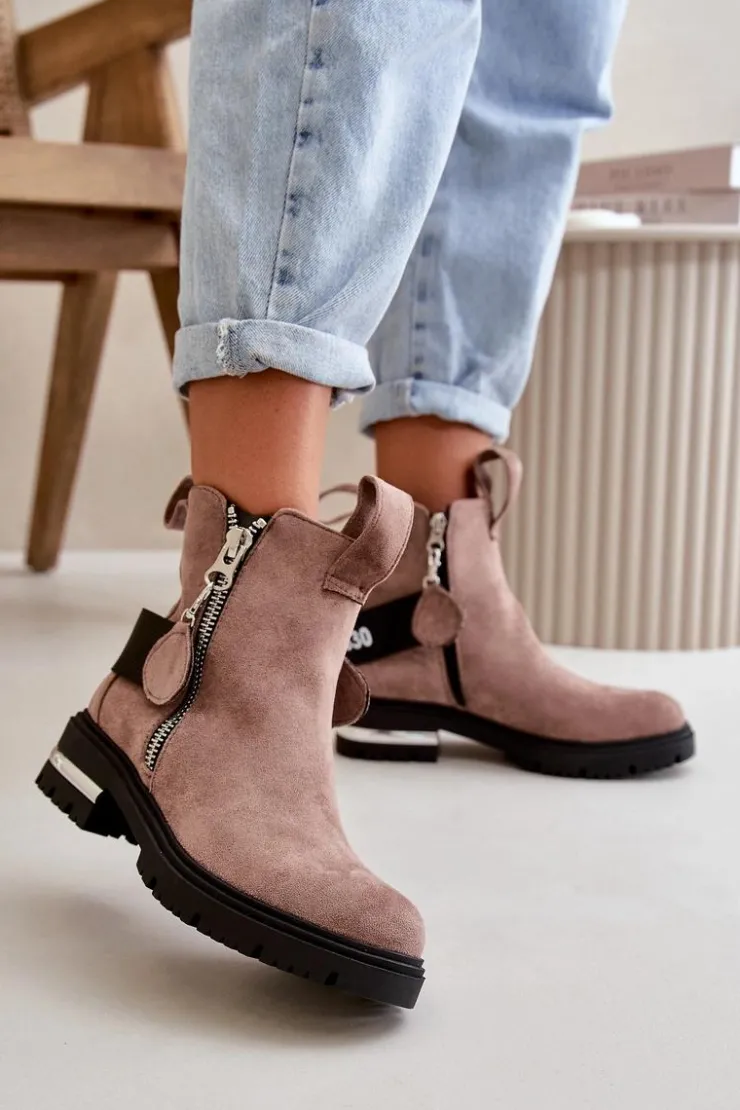 Botki damskie zostały wykonane z eko zamszu. Wnętrze ocieplone jest miłym w dotyku kocem obuwniczym. Dołączony do butów pasek jest odpinany. Botki posiadają dwa zamki, gdzie jeden z nich jest nieodpinany. Buty te osadzono na płaskim obcasie z lustrzaną wstawką i podeszwie z bieżnikiem. Świetny model do wielu jesiennych stylizacji! Przy wyborze rozmiaru prosimy sugerować się tabelą rozmiarów.