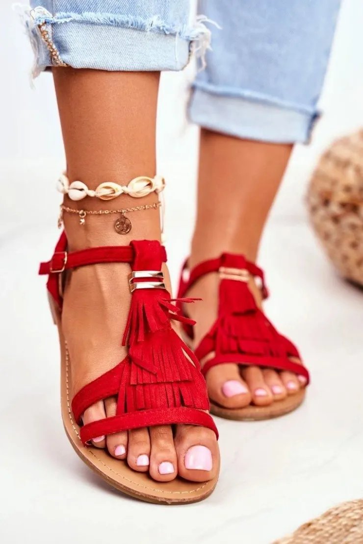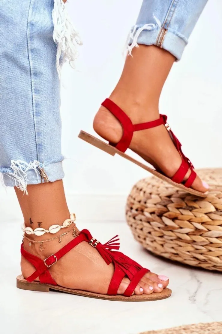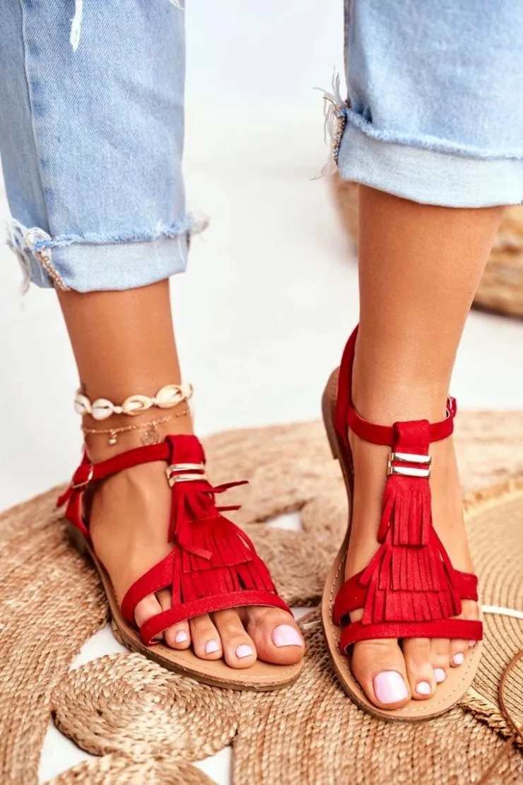 Best Boto Sandały Damskie Płaskie Zamszowe Boho Czerwone Lucami