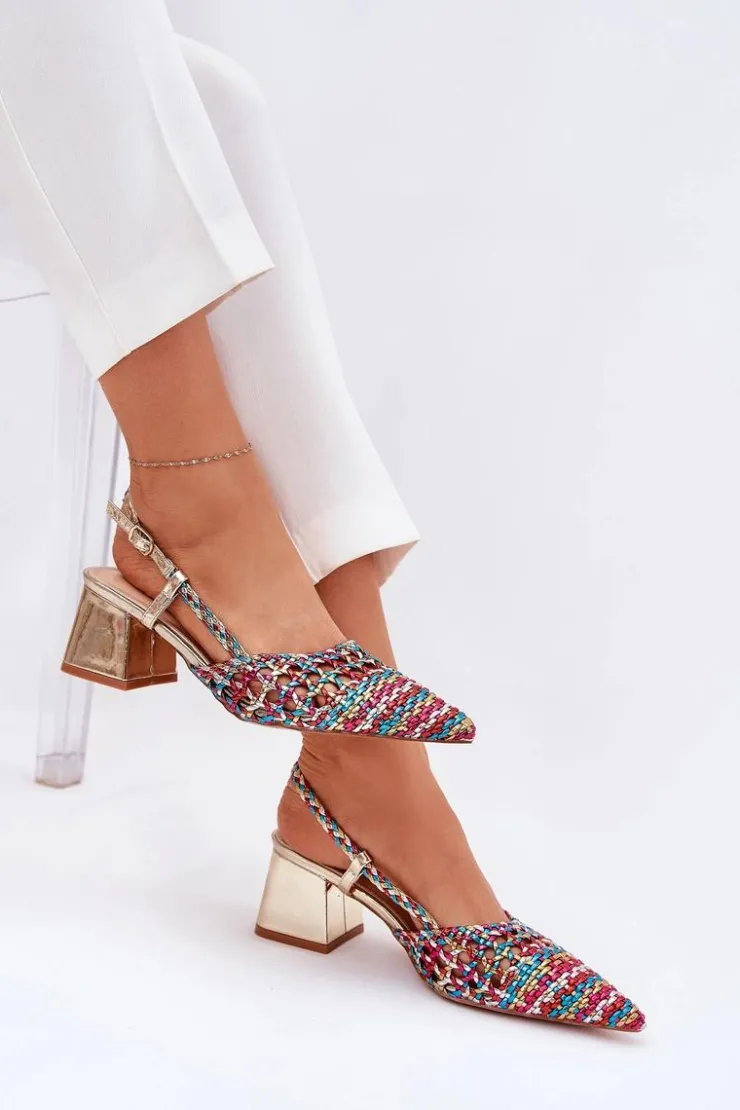 Sandały damskie z plecionki, osadzone na obcasie typu słupek. Szpiczaste noski nadają subtelnej elegancji, a zapinane na sprzączkę pozwalają na idealne dopasowanie do stopy. Miękka wkładka z eko skóry zapewnia komfort przez cały dzień. Te sandały będą doskonałym wyborem na letnie dni, świetnie komponując się z sukienkami, spódnicami czy spodniami, dodając każdej stylizacji wyjątkowego charakteru. Przy wyborze rozmiaru prosimy sugerować się tabelą rozmiarów.
