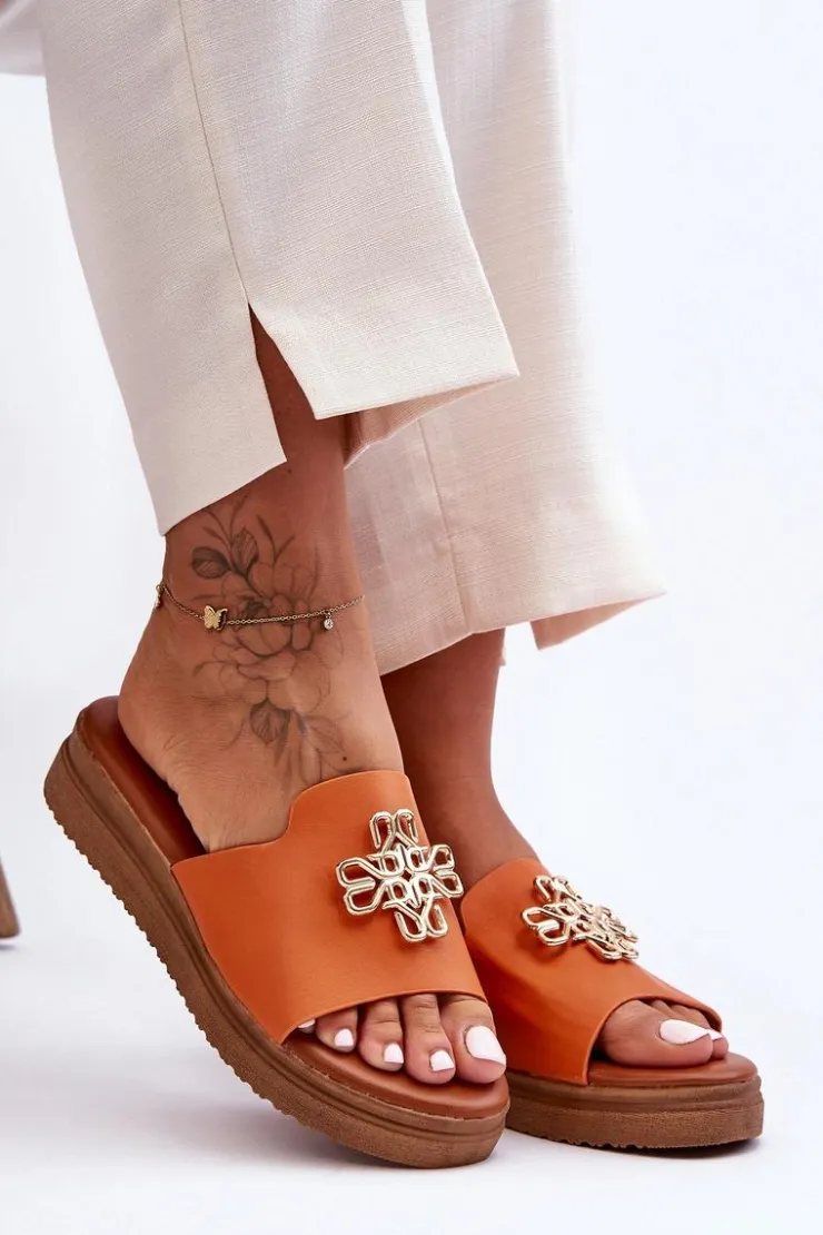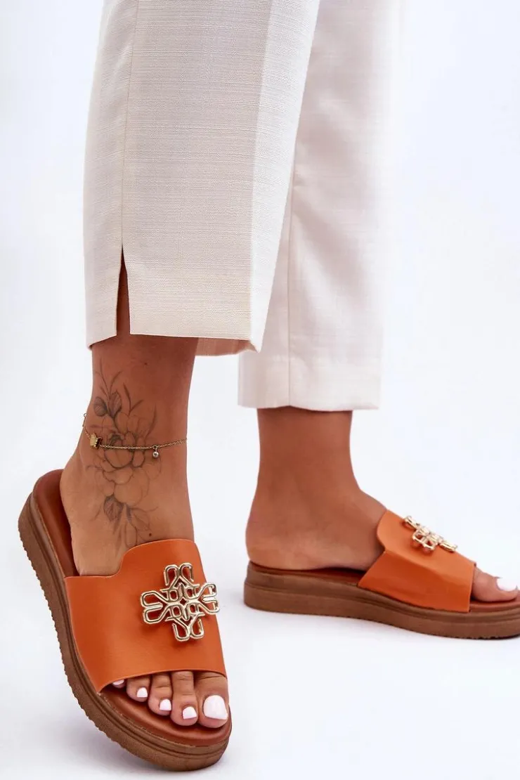 Klasyczne, damskie klapki zostały wykonane z eko skóry. Model ten posiada ozdobę wykonaną z tworzywa sztucznego. Klapki osadzono na grubej platformie. Wkładka jest bardzo miękka i wygodna w użytkowaniu. Ten model powinien znaleźć się właśnie w Twojej garderobie! Przy wyborze rozmiaru prosimy sugerować się tabelą rozmiarów.