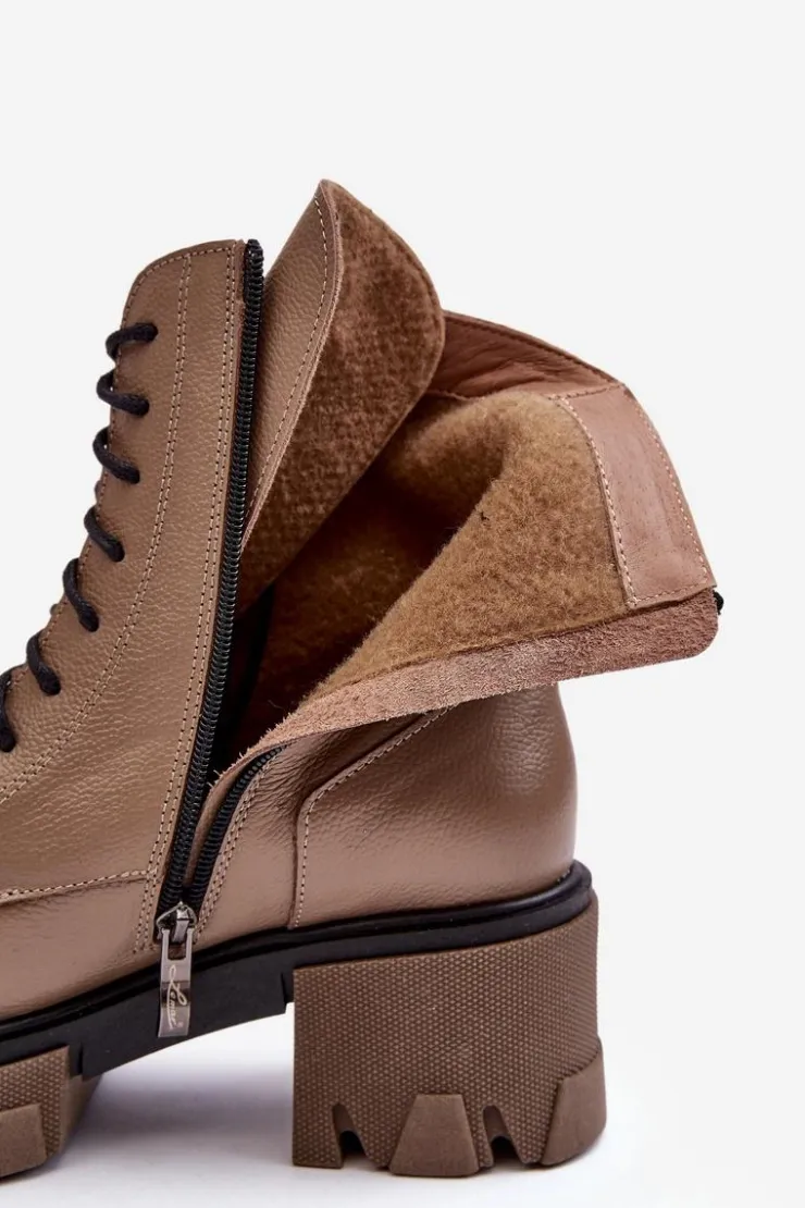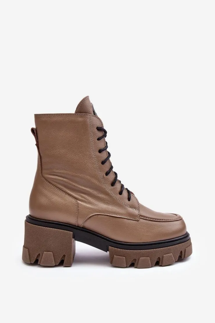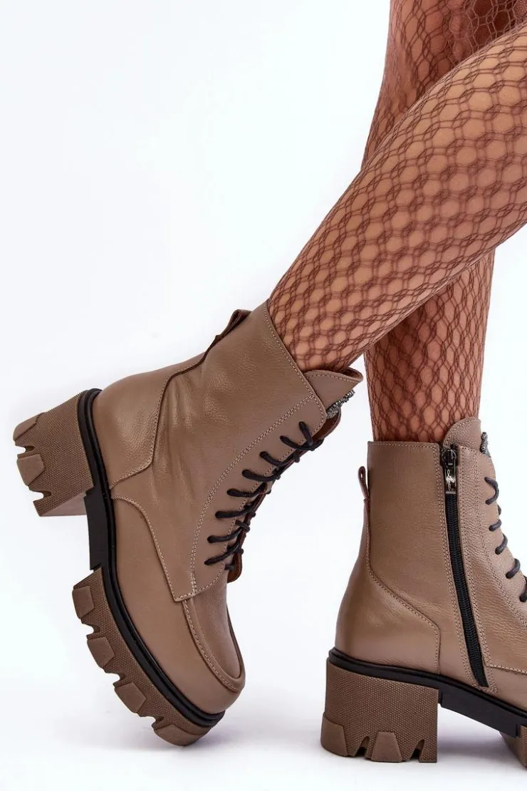 Modne, damskie botki zostały wykonane z wysokiej jakości naturalnych skór. Posiadają klasyczne sznurowanie oraz suwak z boku cholewki. Zapiętek jest usztywniany. Botki osadzono na platformie i masywnym, płaskim obcasie. Podeszwa jest antypoślizgowa. Botki wewnątrz zostały ocieplone kocem obuwniczym. Wkładka jest miękka i wygodna podczas użytkowania. Przy wyborze rozmiaru prosimy sugerować się tabelą rozmiarów.