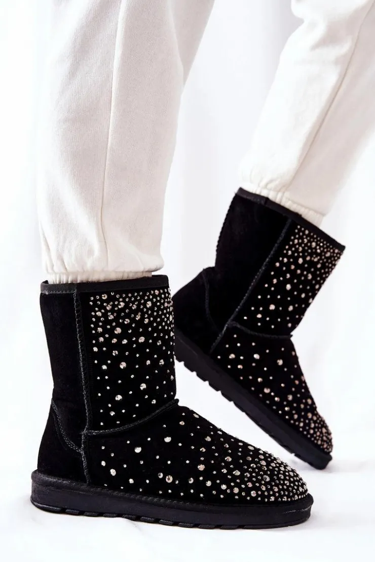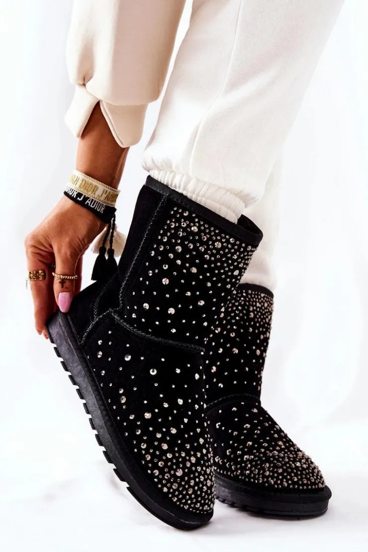 Pięknie zdobione dżetami śniegowce są idealne podczas zimnych dni! W środku posiadają ocieplenie w postaci przyjemnego w dotyku futerka. Zostały wykonane z naturalnego zamszu. Gruba podeszwa ochroni stopy przed zimnem. Koniecznie musisz je mieć, nie czekaj dłużej aż znikną! Przy wyborze rozmiaru, prosimy sugerować się tabelą rozmiarów.