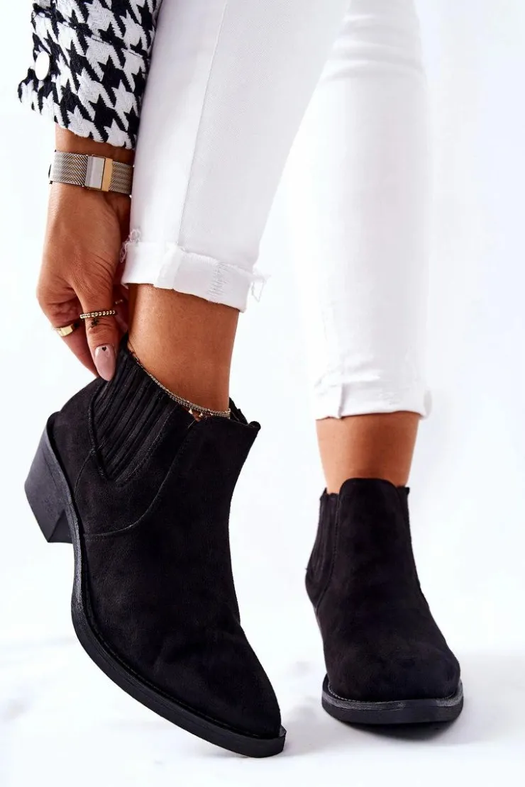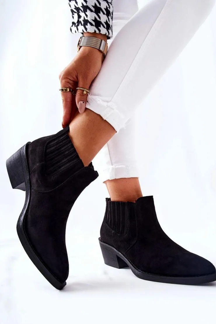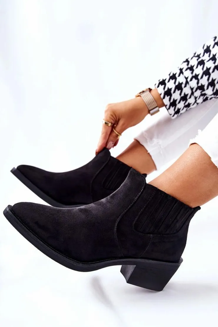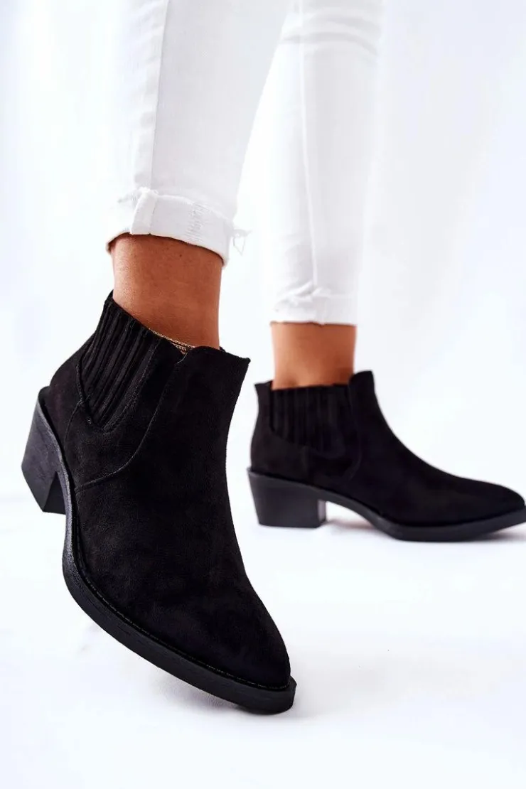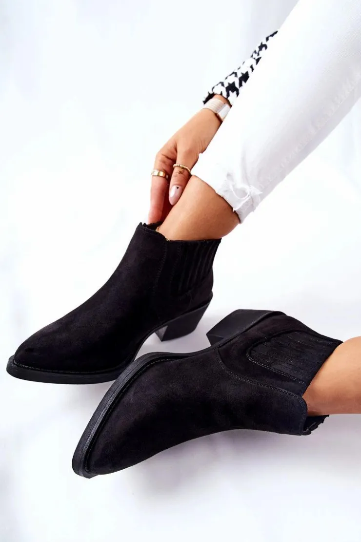 Wygodne oraz stylowe botki na masywnym słupku. Wykonane z ekologicznego zamszu. Posiadają nosek w szpic. Z boku cholewki znajduje się ściągacz po obu stronach. Botki posiadają delikatne ocieplenie w postaci koca obuwniczego. Kup je już dziś! Przy wyborze rozmiaru prosimy sugerować się tabelą rozmiarów.