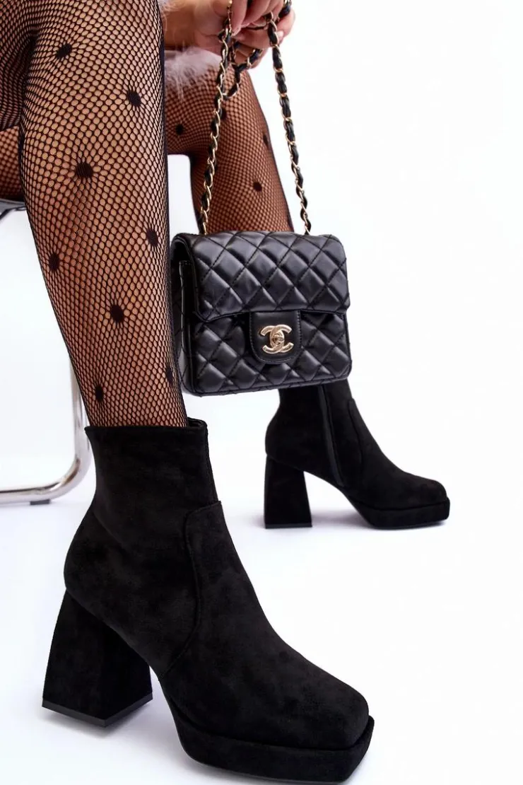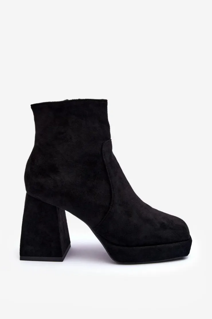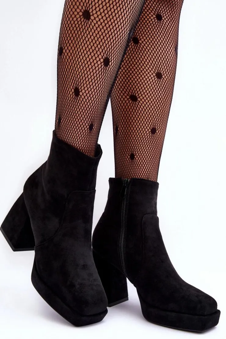 Botki Damskie osadzone na masywnym, wysokim klocku i platformie. Wykonane z eko zamszu. Zapinane na suwak po wewnętrznej stronie cholewki. Środek ocieplony kocem obuwniczym. Noski w kwadrat. Zapiętek jest usztywniony. Przy wyborze rozmiaru prosimy sugerować się tabelą rozmiarów.
