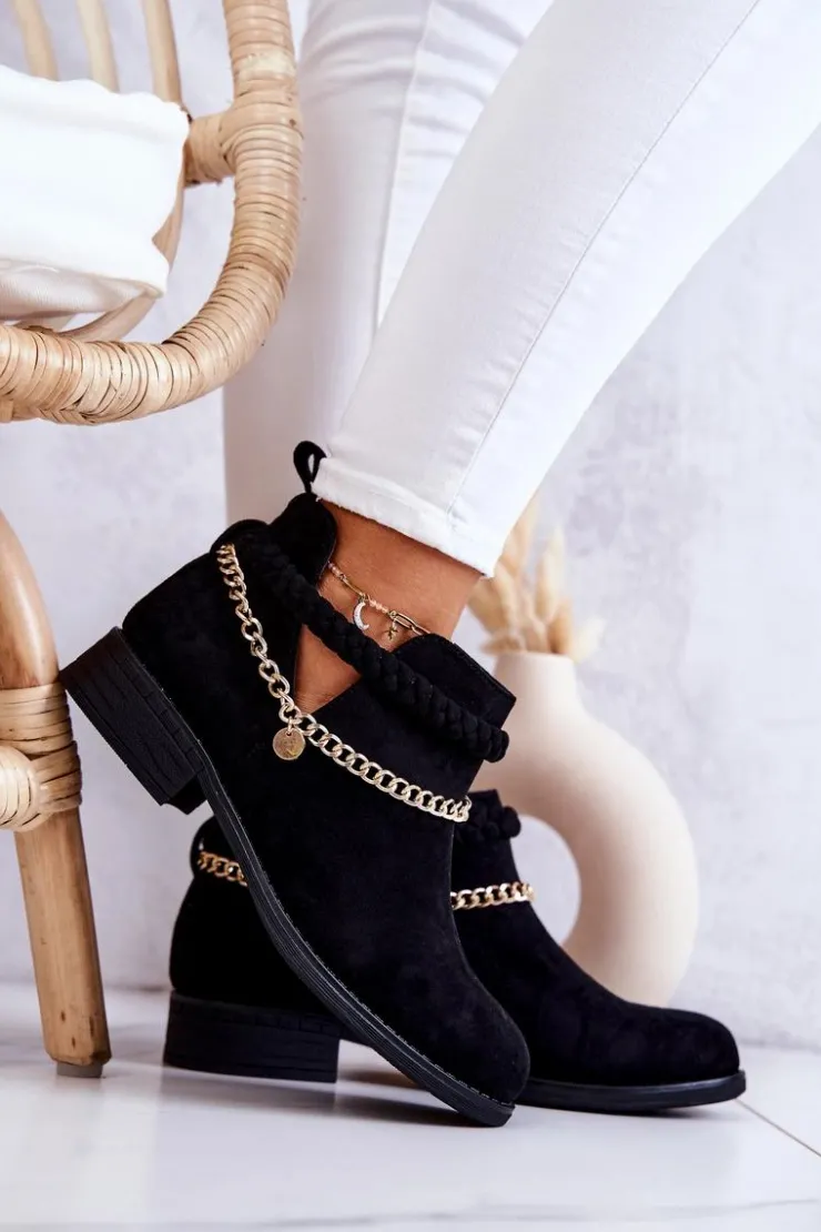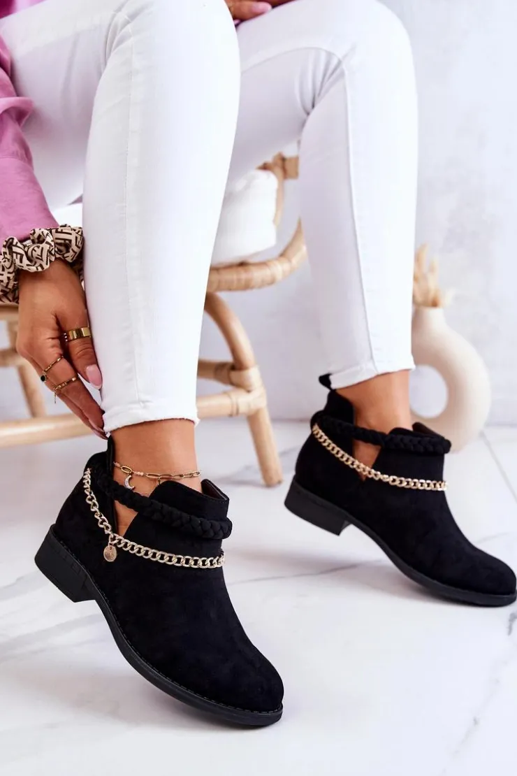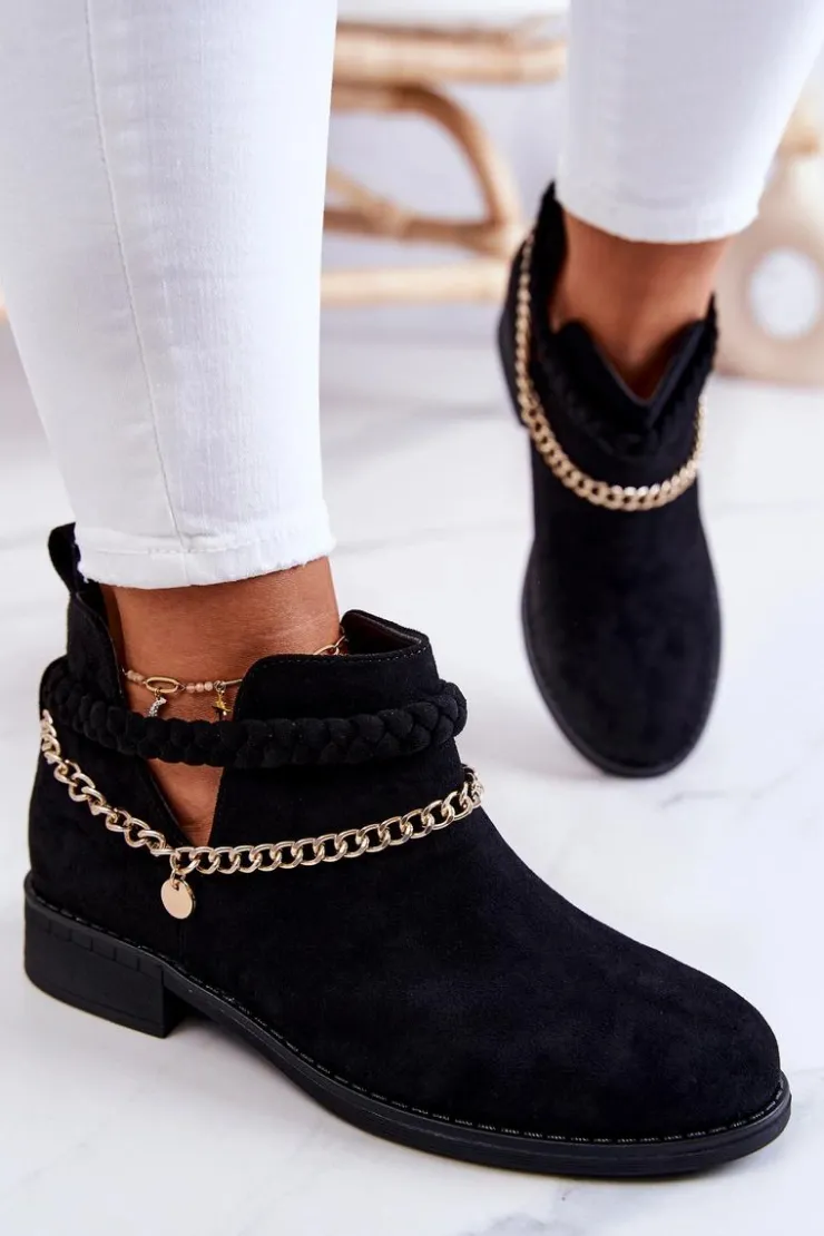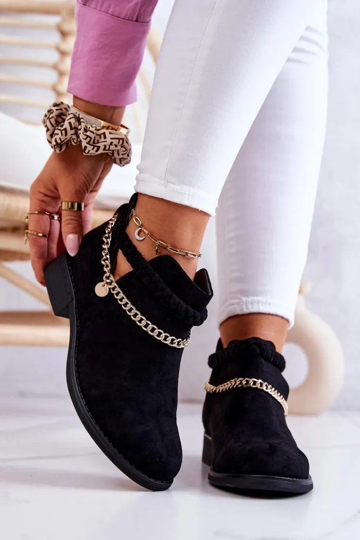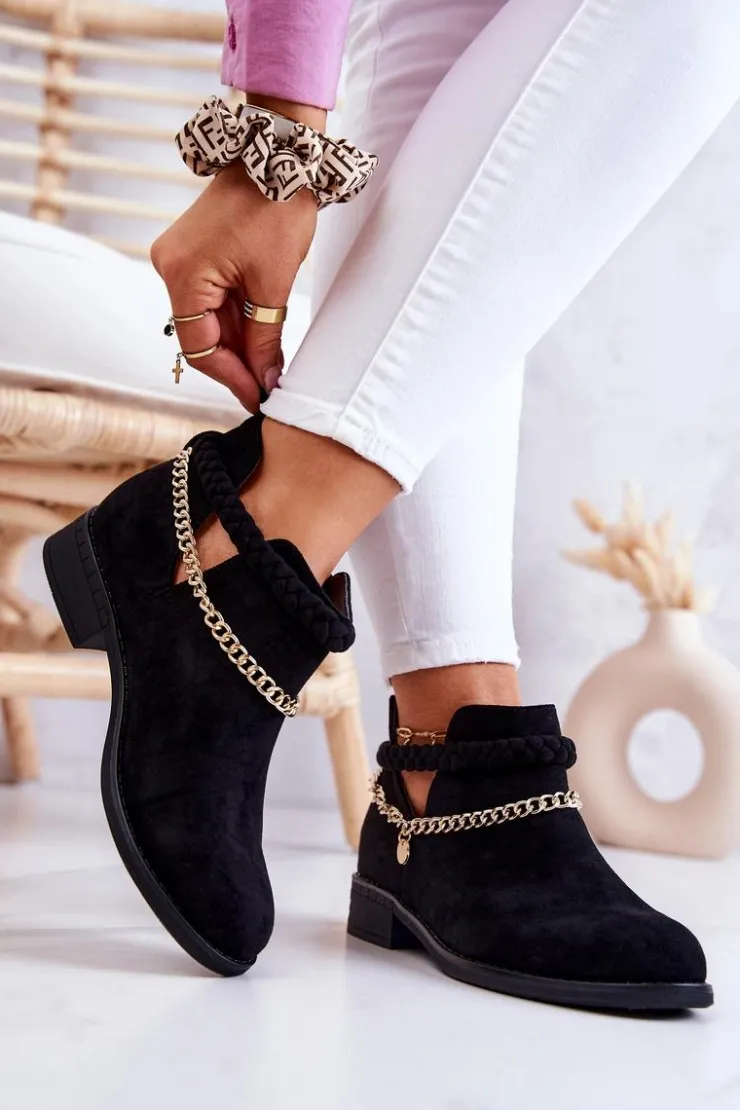 Botki damskie wykonane z eko zamszu ozdobione łańcuszkiem oraz plecionym paseczkiem w postaci warkoczyka. Posiadają płaski obcas. W środku znajduje się materiałowa wkładka. Z boku cholewki posiadają wycięcia. Idealne na wiosenno-letnią porę! Tego modelu nie powinno zabraknąć w Twojej szafie! Koniecznie musisz je mieć! Przy wyborze rozmiaru prosimy sugerować się tabelą rozmiarów.