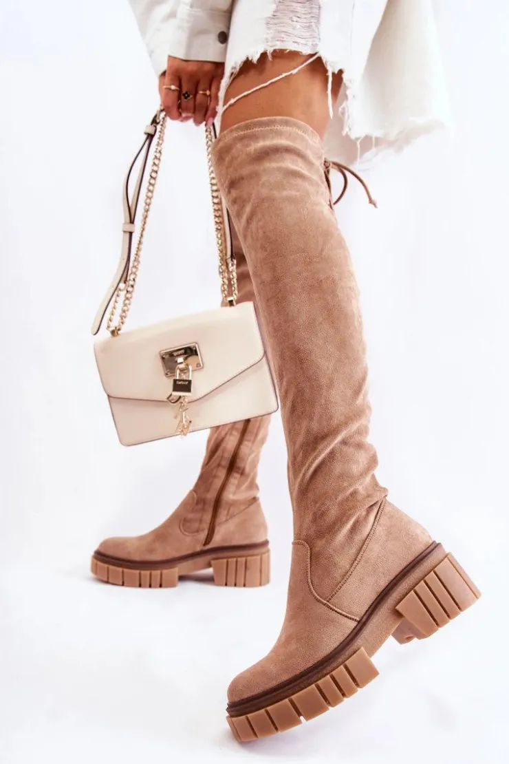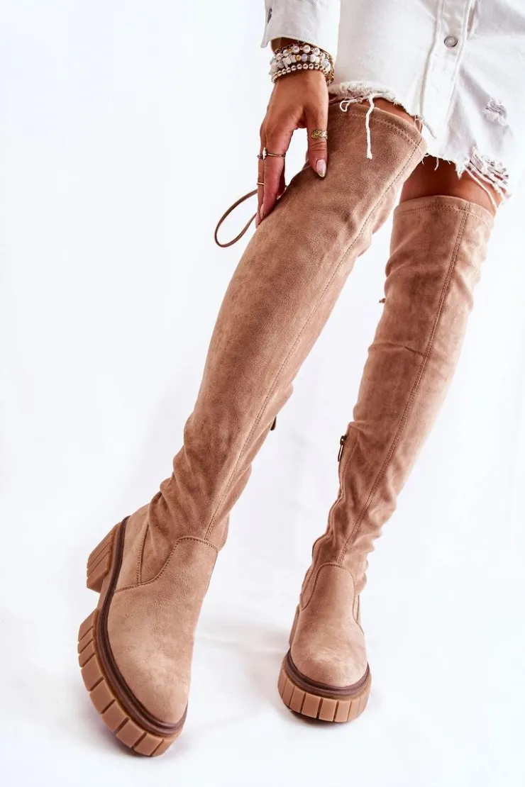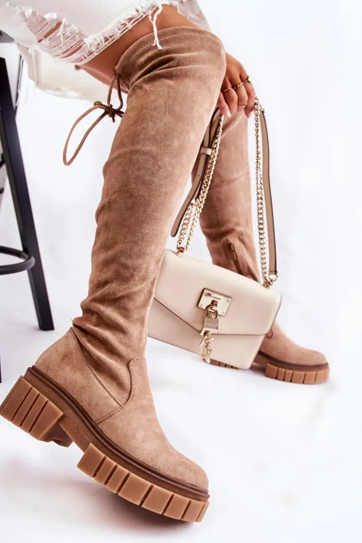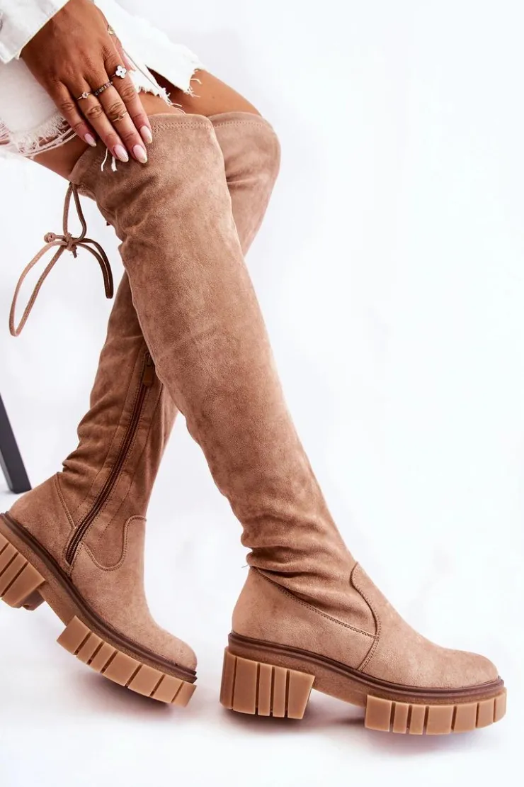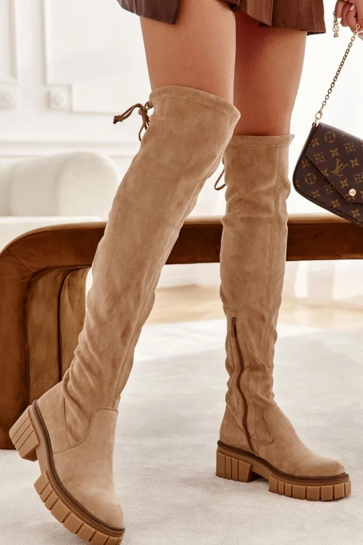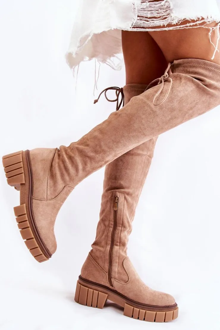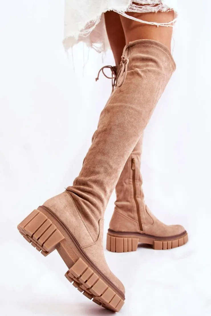 Piękne kozaki damskie z cholewką za kolano. Model został wykonany z przyjemnego w dotyku eko zamszu. Zapinane na suwak z boku cholewki. Dodatkowo kozaki posiadają wiązanie, dzięki któremu można je odpowiednio dopasować. Model osadzony na masywnym płaskim obcasie i platformie. Kozaki posiadają ocieplenie w postaci koca obuwniczego tylko na wysokości stopy. Zapiętek usztywniany. Przy wyborze rozmiaru prosimy kierować tabelą rozmiarów.