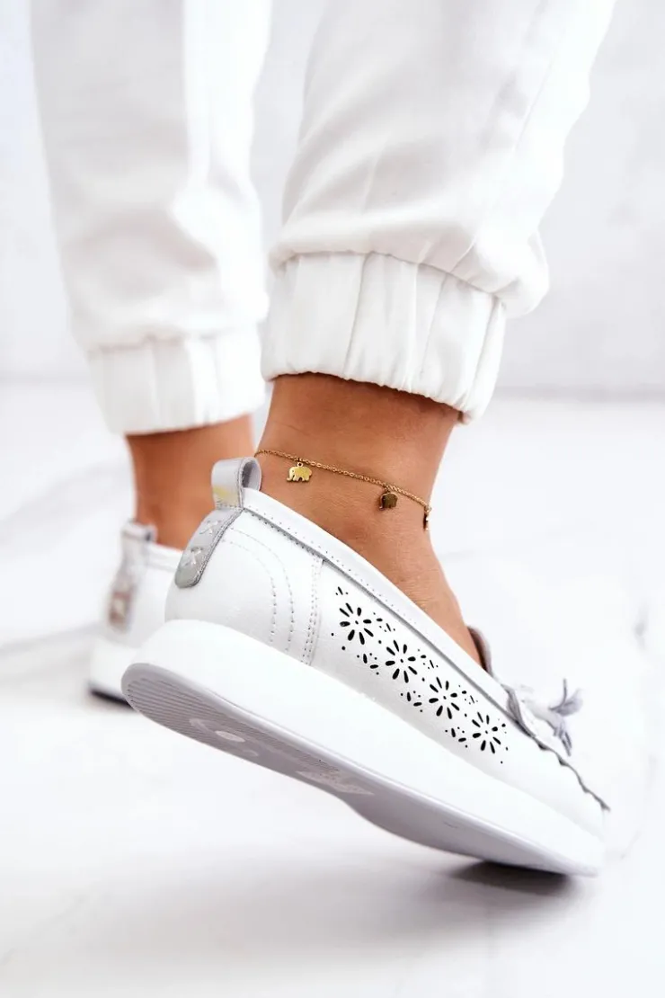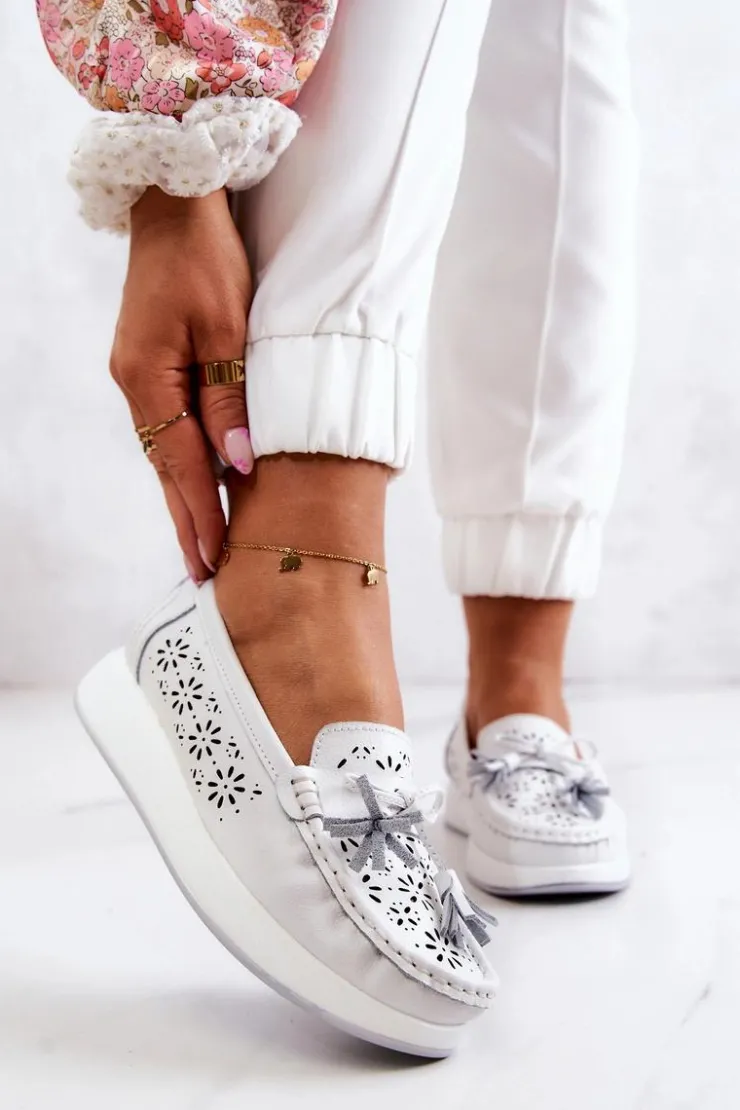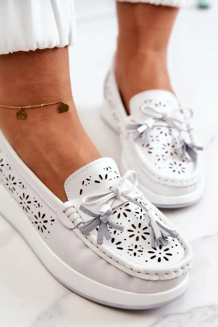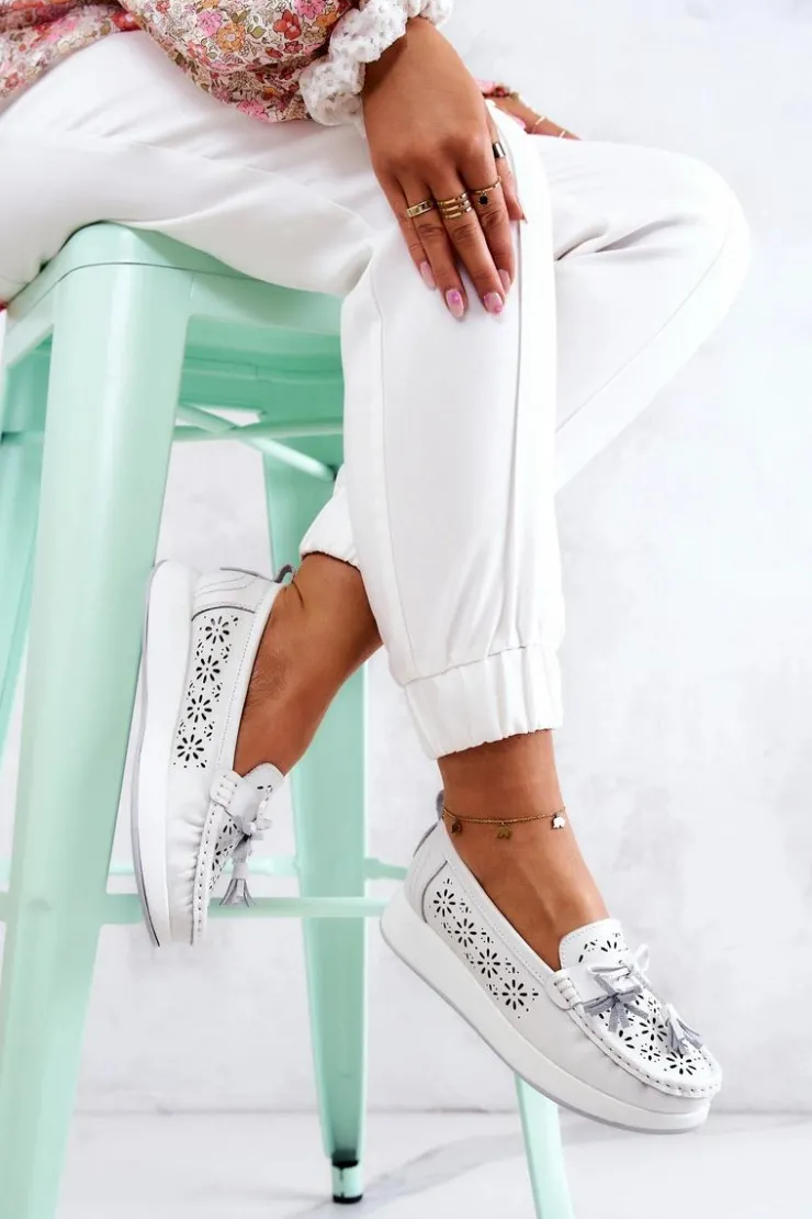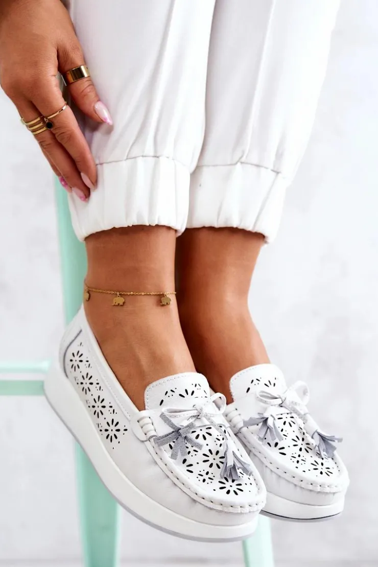 Piękne ażurowe mokasyny, które idealnie sprawdzą się jako dodatek do oryginalnych i nietuzinkowych stylizacji! Buty te idealnie sprawdzają się zarówno w wiosennych, jak i w letnich stylizacjach. Wykonane z naturalnej skóry. Lekkie oraz przewiewne. O komfort zadba skórzana, profilowana wkładka typu Comfort Line. Mokasyny posiadają platformę wykonaną z tworzywa sztucznego oraz frędzelki na przodzie obuwia. Świetny model, który powinnaś mieć! Przy wyborze rozmiaru prosimy sugerować się tabelą rozmiarów.