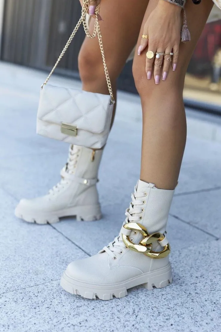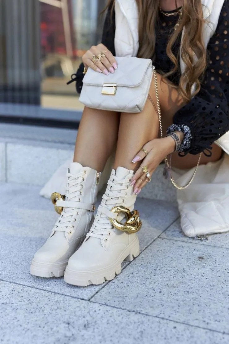 Szukasz mocniejszego stylu? Dobrze trafiłaś, bo te botki spełniają Twoje wymagania! Noś na różne sposoby, ozdobę – łańcuch możesz dowolnie odpiąć. Wysoka cholewka oraz masywna podeszwa – co tu więcej dodawać? Klasyczny fason ze sznurowaniem. Odporna na zabrudzenia skóra ekologiczna, to najlepszy wybór na jesienno-zimowe spacery. Przy wyborze rozmiaru prosimy sugerować się tabelą rozmiarów.