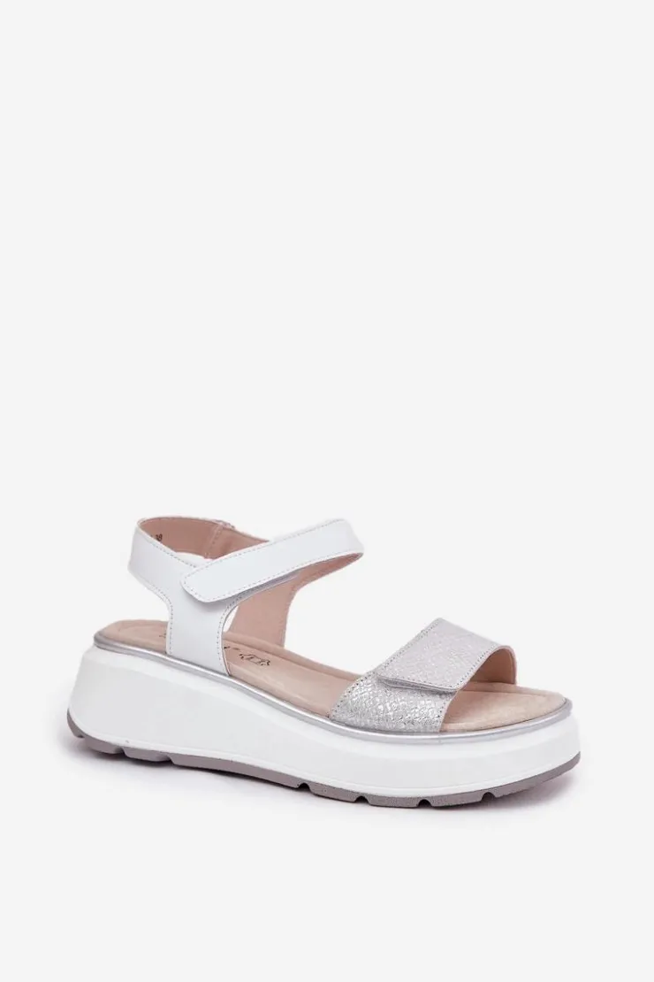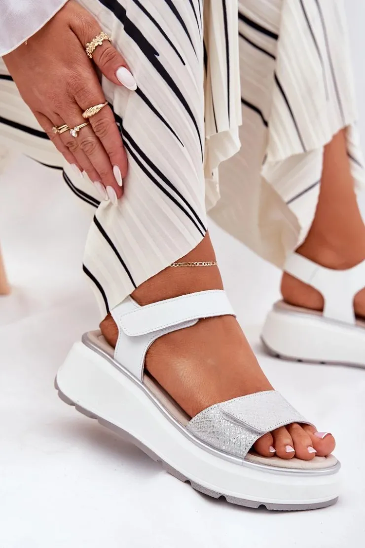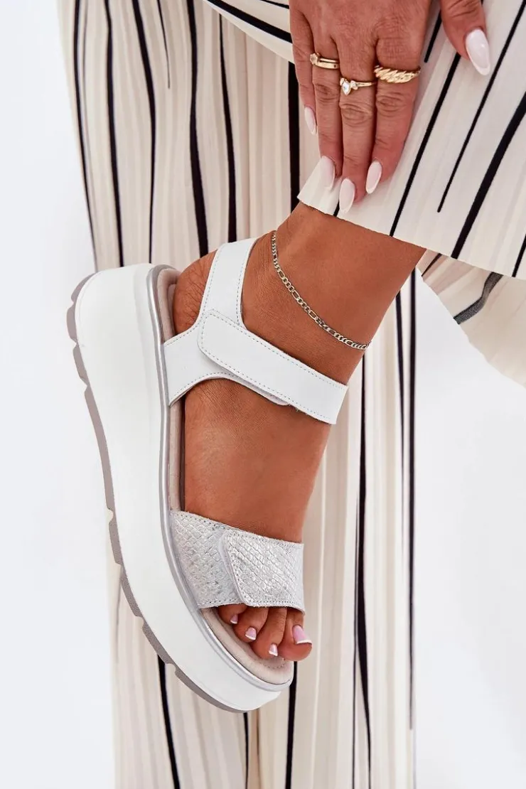 Sandały damskie z naturalnej skóry, osadzone na platformie i koturnie, które łączą wygodę z eleganckim wyglądem. Zapinane na dwa rzepy, co zapewnia łatwe dopasowanie do stopy. Skórzana wkładka gwarantuje komfort przez cały dzień, dbając o odpowiednią amortyzację. Doskonałe na letnie dni, te sandały będą idealnym wyborem do sukienek, spódnic czy spodni. Przy wyborze rozmiaru prosimy kierować się tabelą rozmiarów.
