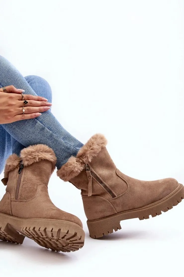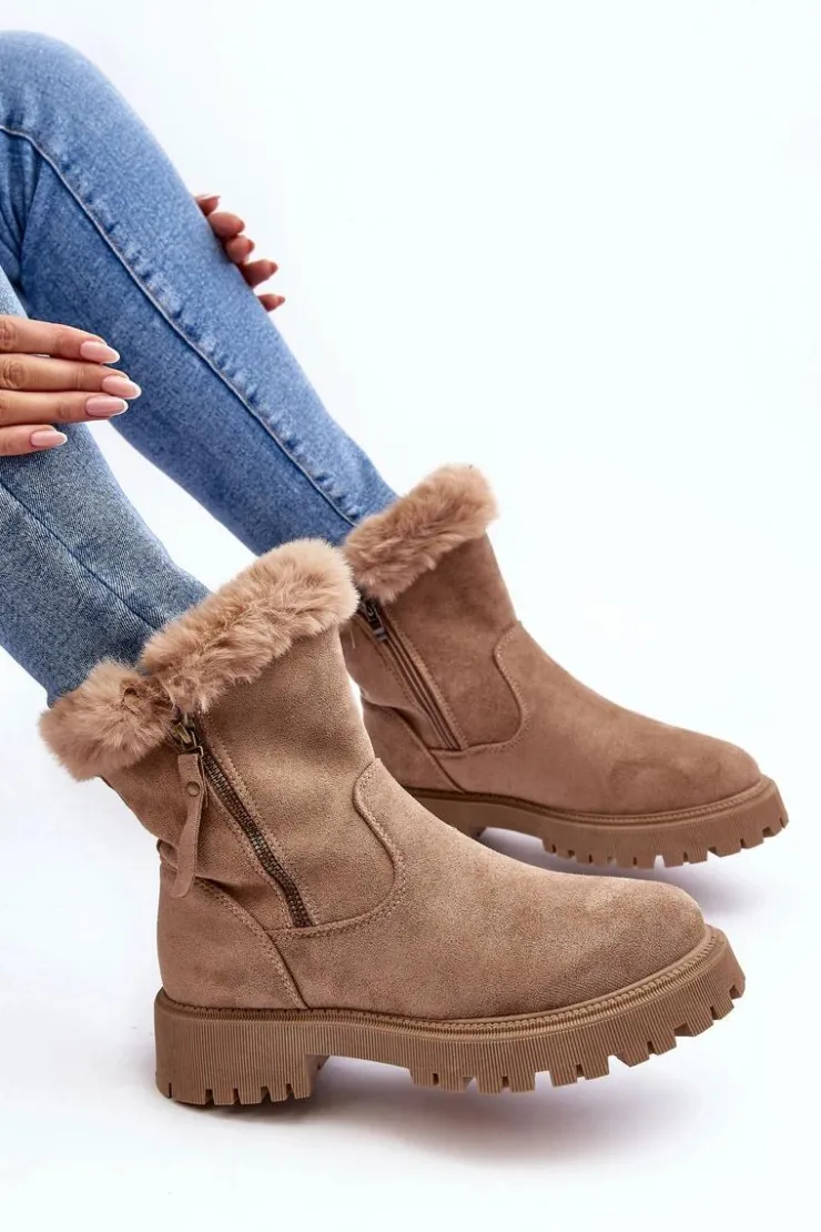 Botki z cholewką zakończoną miękkim futerkiem. Model ten posiada suwak z boku cholewki — jeden ozdobny, drugi ułatwiający zakładanie obuwia. Osadzone na płaskim obcasie i platformie. Ocieplone wewnątrz grubym futerkiem. Zapiętek jest usztywniany. Idealny model na chłodne dni! Przy wyborze rozmiaru prosimy sugerować się tabelą rozmiarów.