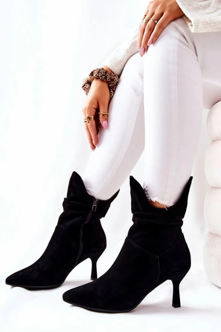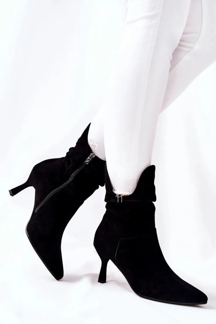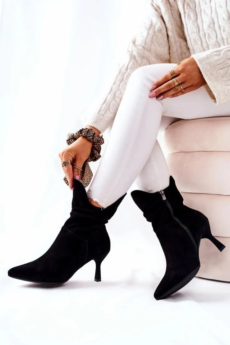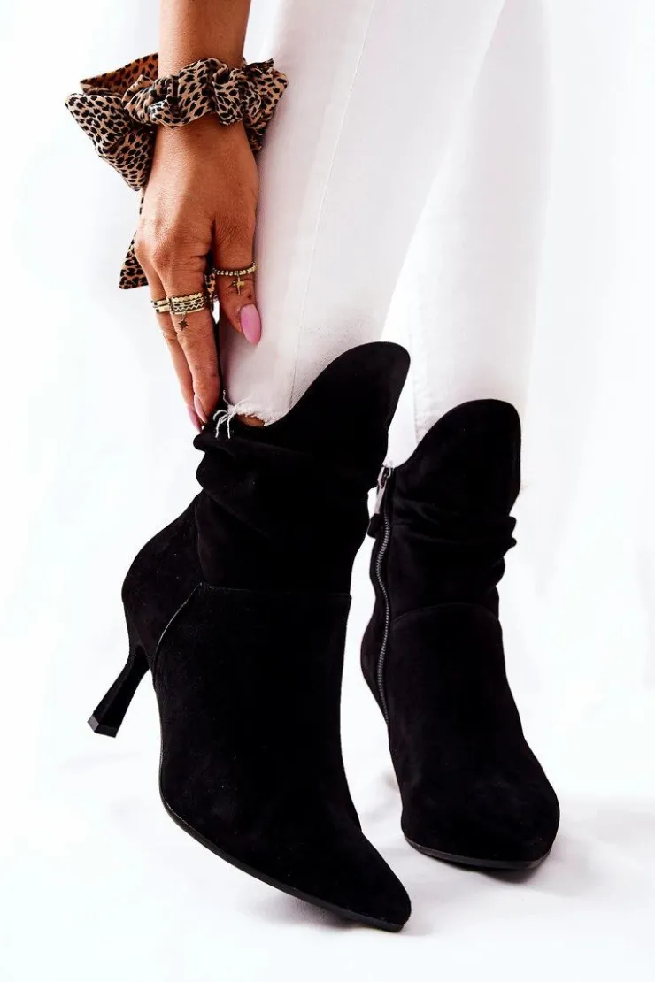 Botki świetnie sprawdzą się podczas tworzenia stylizacji w chłodniejsze dni. Botki na boku posiadają suwak ułatwiający zakładanie. W całości wykonane ze skóry zamszowej. Komfort noszenia oraz wysoka jakość wykonania są atutem tych botków. Posiadają w środku delikatny koc obuwniczy. Marszczona cholewka sprawia, że wyglądają wyjątkowo! Przy wyborze rozmiaru prosimy sugerować się tabelą rozmiarów.