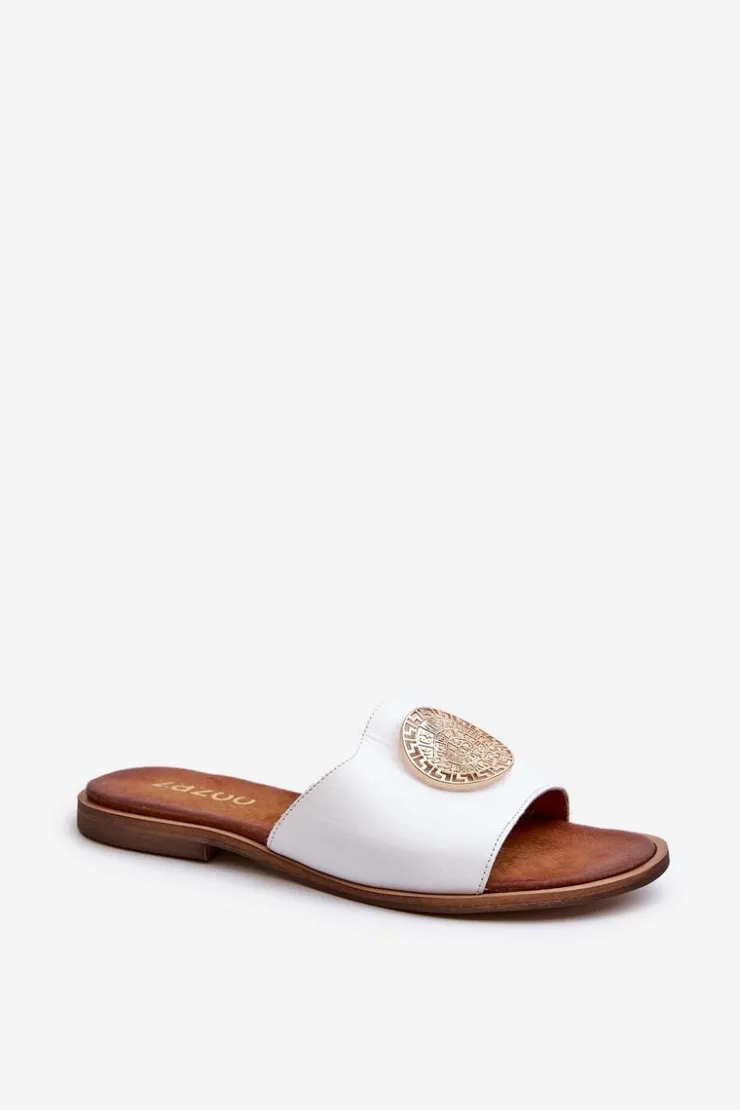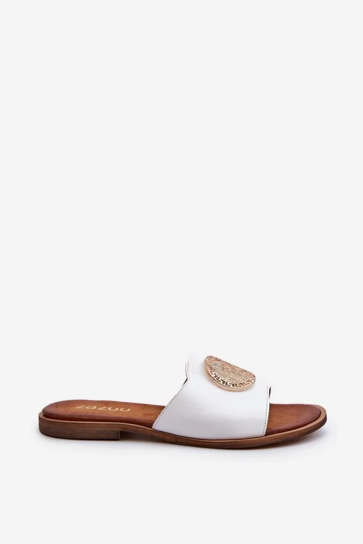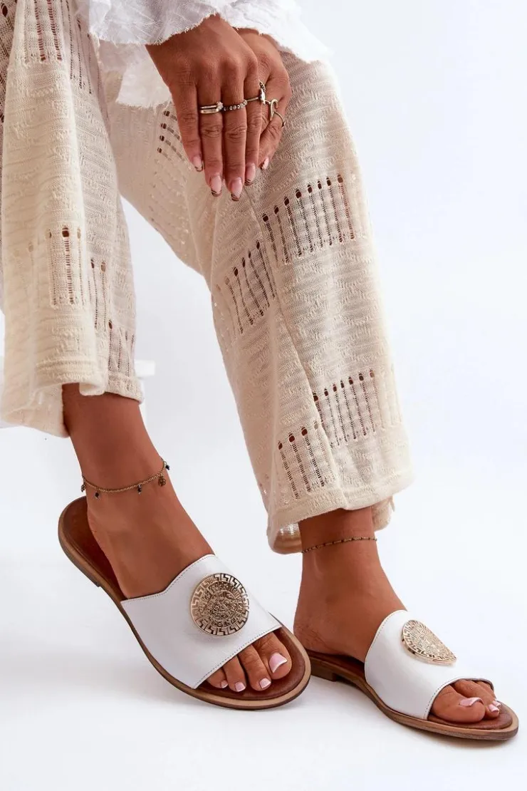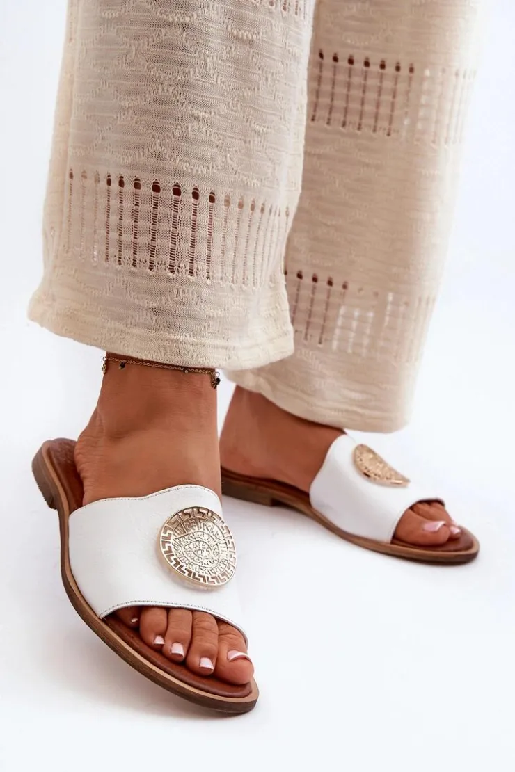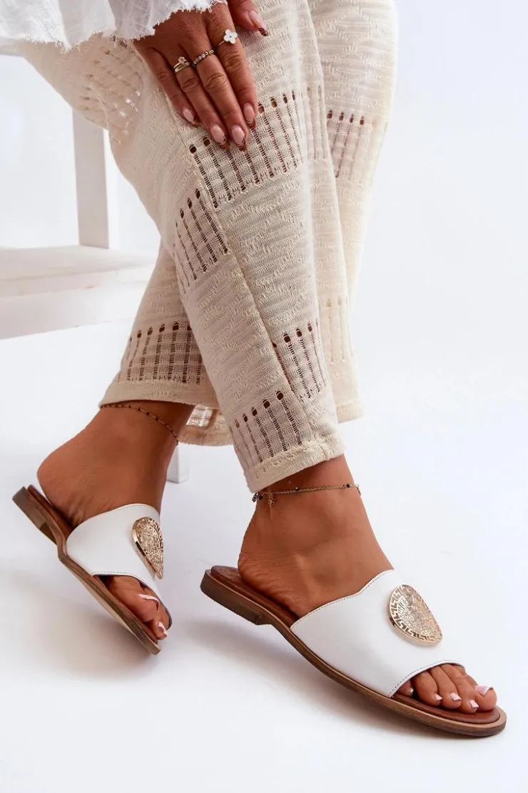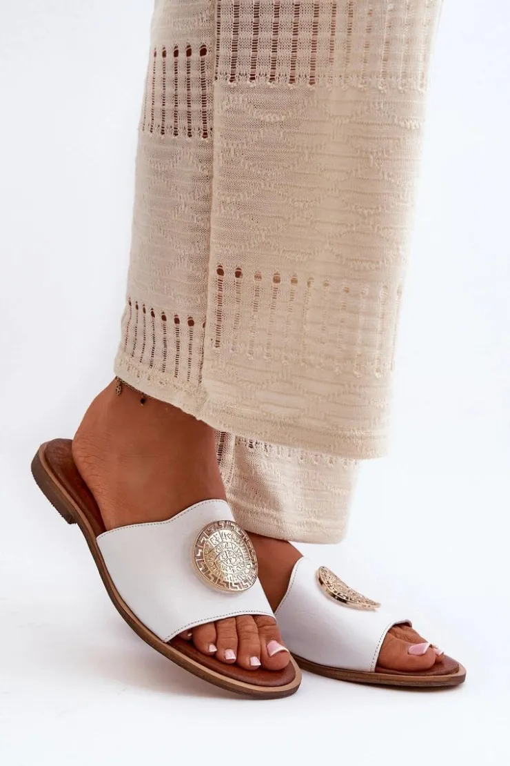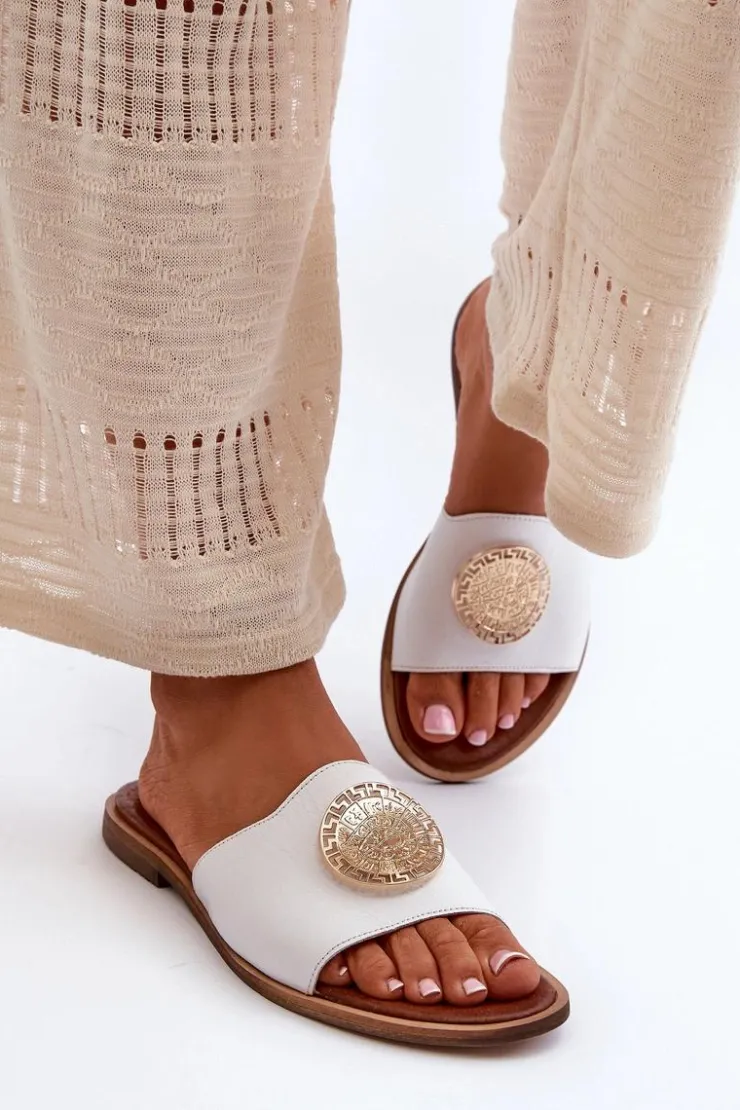 Damskie klapki wykonane ze skóry naturalnej to doskonały wybór dla kobiet, które cenią sobie elegancję i wygodę. Osadzone na płaskim obcasie, zapewniają komfort noszenia przez cały dzień, co sprawia, że są idealne zarówno do codziennych stylizacji, jak i na bardziej formalne okazje. Wzbogacone złotą ozdobą, która dodaje im wyjątkowego uroku i klasy. Dzięki starannemu wykonaniu te klapki są trwałe i stylowe, stanowiąc niezbędny element w każdej kobiecej garderobie. Przy wyborze rozmiaru prosimy sugerować się tabelą rozmiarów.