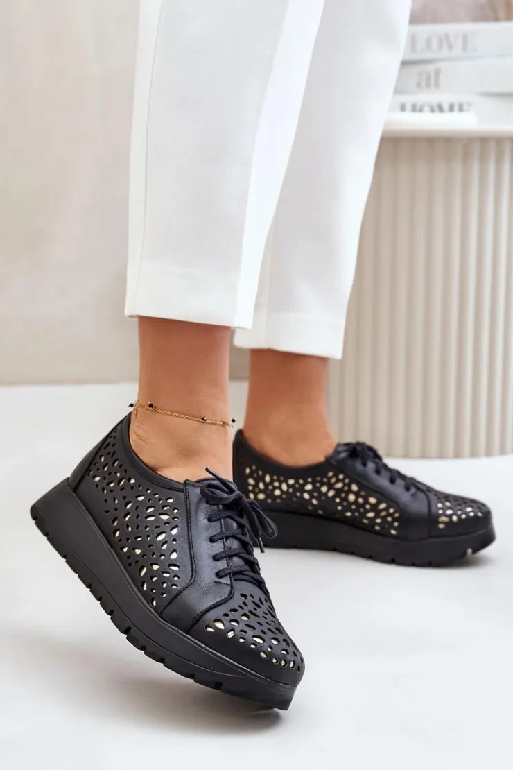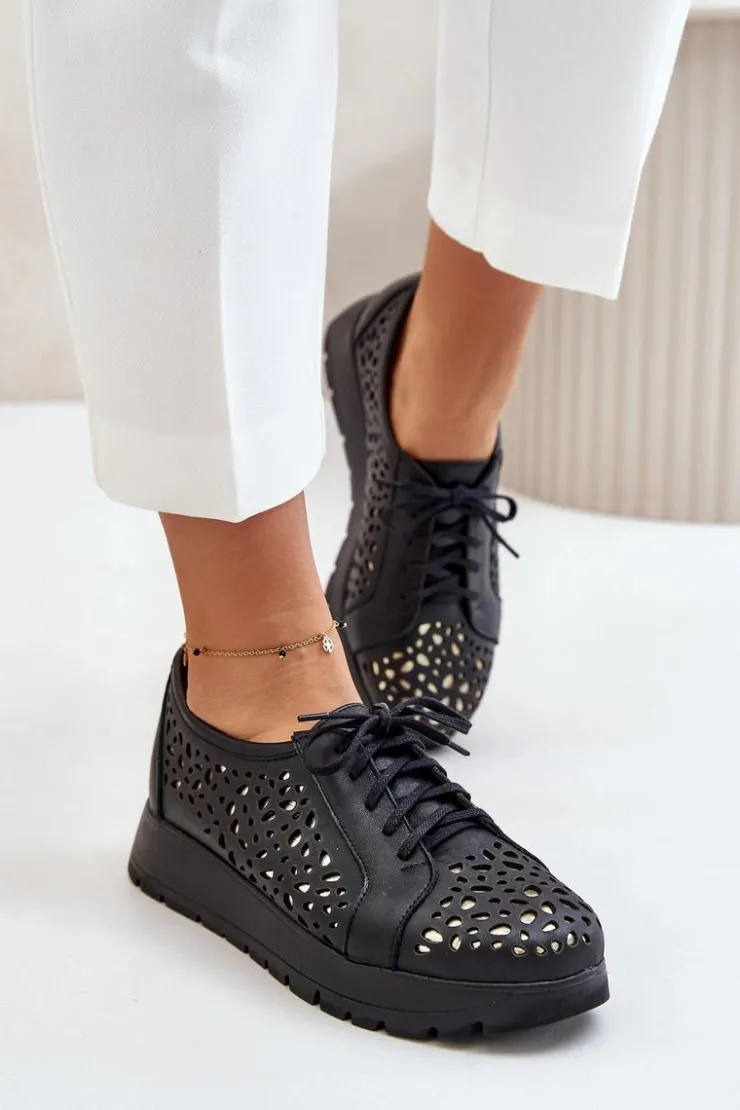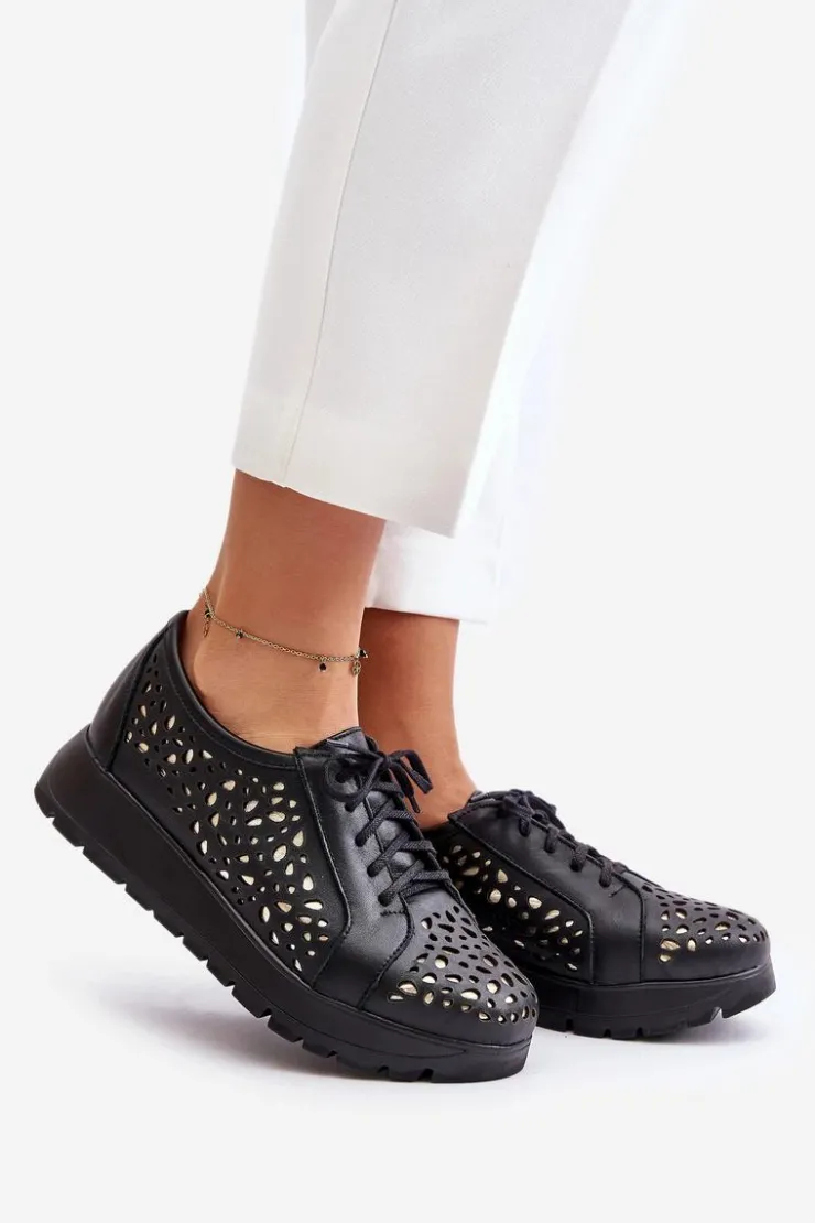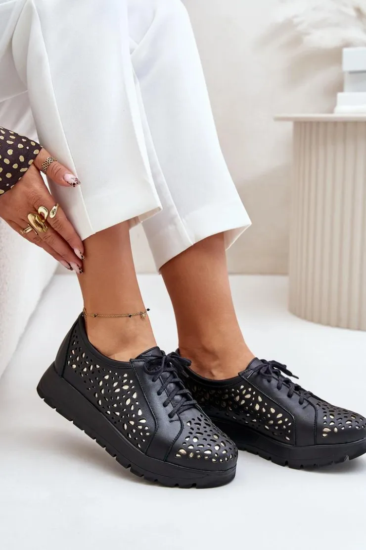 Damskie półbuty wykonane ze skóry naturalnej, osadzone na platformie dla dodatkowego komfortu. Noski są zaokrąglone. Cholewka ozdobiona ażurowym wzorem, który dodaje im lekkości i stylu. Idealne do różnych stylizacji, te buty doskonale uzupełnią każdą garderobę, zapewniając modny i wygodny look na co dzień. Przy wyborze rozmiaru prosimy sugerować się tabelą rozmiarów.