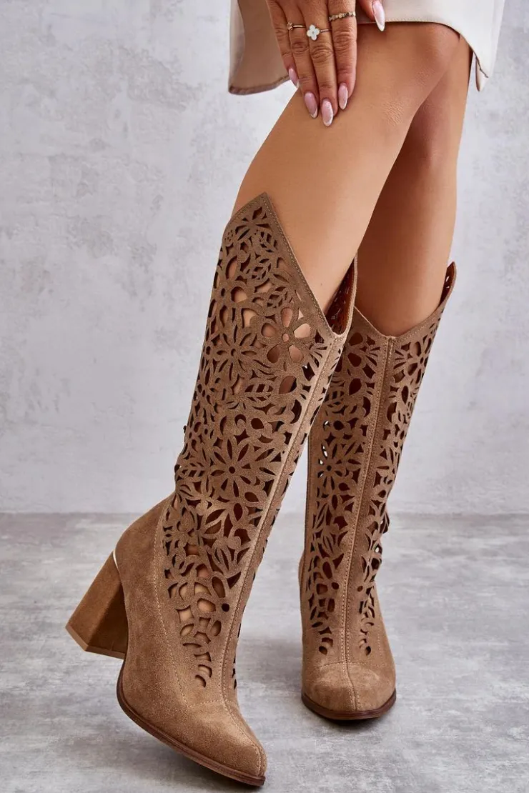 Kozaki z ażurową cholewką do kolana oraz noskiem w szpic. Zapinane na zamek błyskawiczny oraz wsuwane. Posiadają usztywniany zapiętek. Wykonane z wysokiej jakości skór naturalnych. Z tymi kozakami stworzysz wiele ciekawych stylizacji na co dzień. Miękka, skórzana wkładka oraz stabilny obcas w postaci słupka zapewnią wygodę podczas użytkowania. Przy wyborze rozmiaru prosimy sugerować się tabelą rozmiarów.