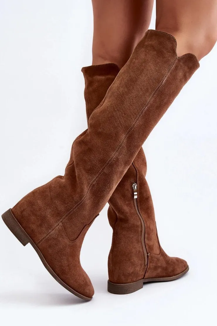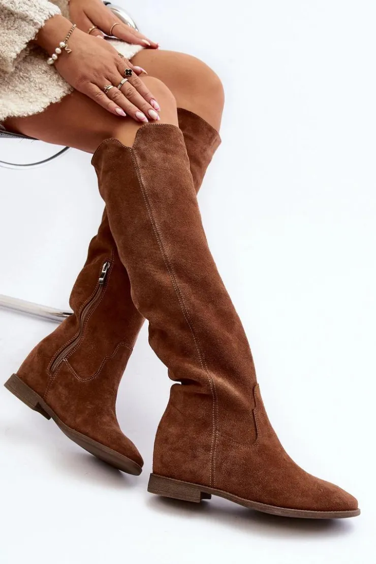 Kozaki damskie zostały wykonane z wysokiej jakości naturalnego zamszu. Osadzone na płaskim obcasie oraz ukrytym koturnie. Cholewka do kolana z wycięciami na bokach. Noski zaokrąglone. Środek lekko ocieplony kocem obuwniczym. Ten modny fason świetnie sprawdzi się w wielu wiosenno-jesiennych stylizacjach! Przy wyborze rozmiaru prosimy sugerować się tabelą rozmiarów.