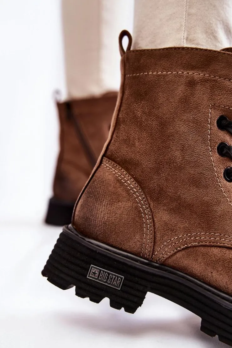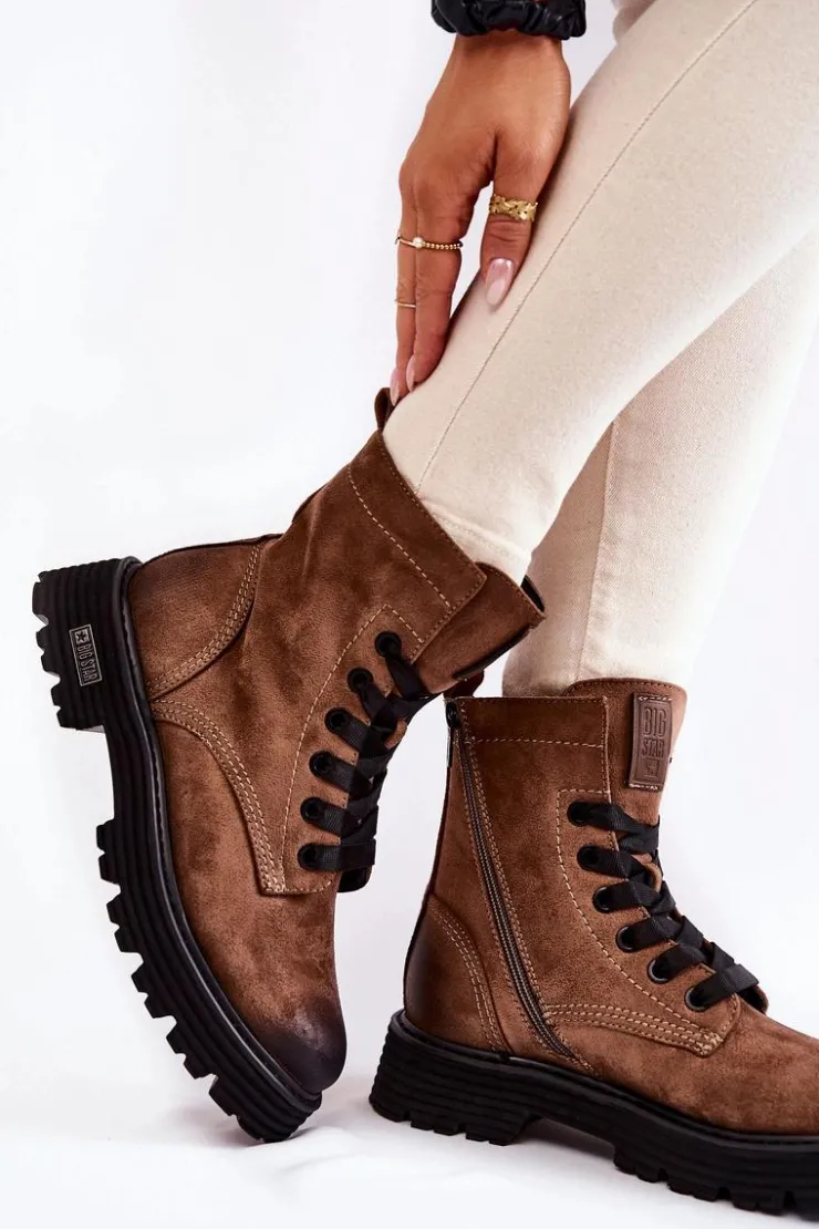 Wyjątkowe botki marki Big Star zostały wykonane z eko zamszu. Posiadają modne przetarcia przy nosku i z tyłu cholewki. Dodatkowo zapiętek jest usztywniany. Zapinane z boku cholewki na suwak oraz klasycznie sznurowane. Botki posiadają ocieplenie w postaci miłego w dotyku koca obuwniczego. Osadzone na delikatnej platformie i płaskim obcasie. Przy wyborze rozmiaru prosimy sugerować się tabelą rozmiarów.