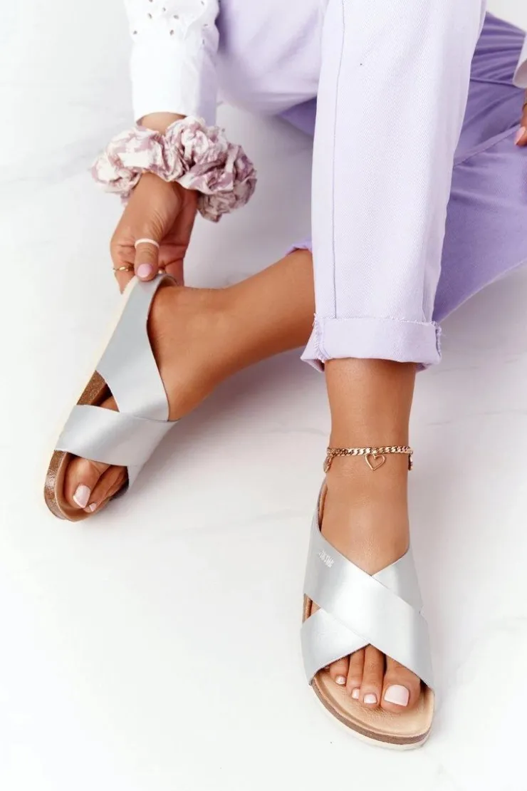 Big Star Shoes Klapki Damskie Klasyczne*Skórzane Profilowane Klapki Big Star HH274650 Srebrne