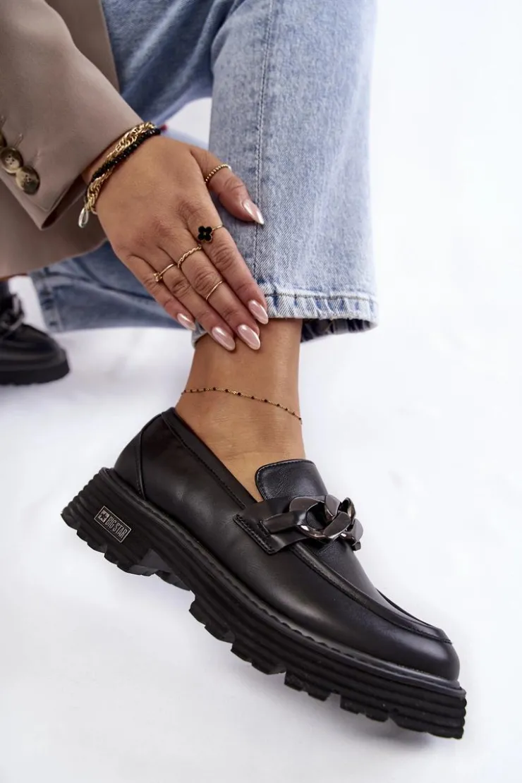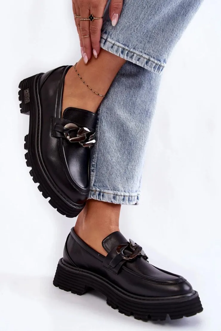 Modne półbuty damskie zostały wykonane z wysokiej jakości skóry ekologicznej. Na przodzie posiadają charakterystyczną ozdobę w postaci łańcucha. Buty te osadzono na platformie oraz płaskim obcasie. Podeszwa ze żłobieniami świetnie odizoluje od nierównego podłoża. Półbuty posiadają usztywniany zapiętek. Model idealny do wielu stylizacji! Wygodne, a zarazem modne. Koniecznie musisz je mieć! Przy wyborze rozmiaru prosimy sugerować się tabelą rozmiarów.