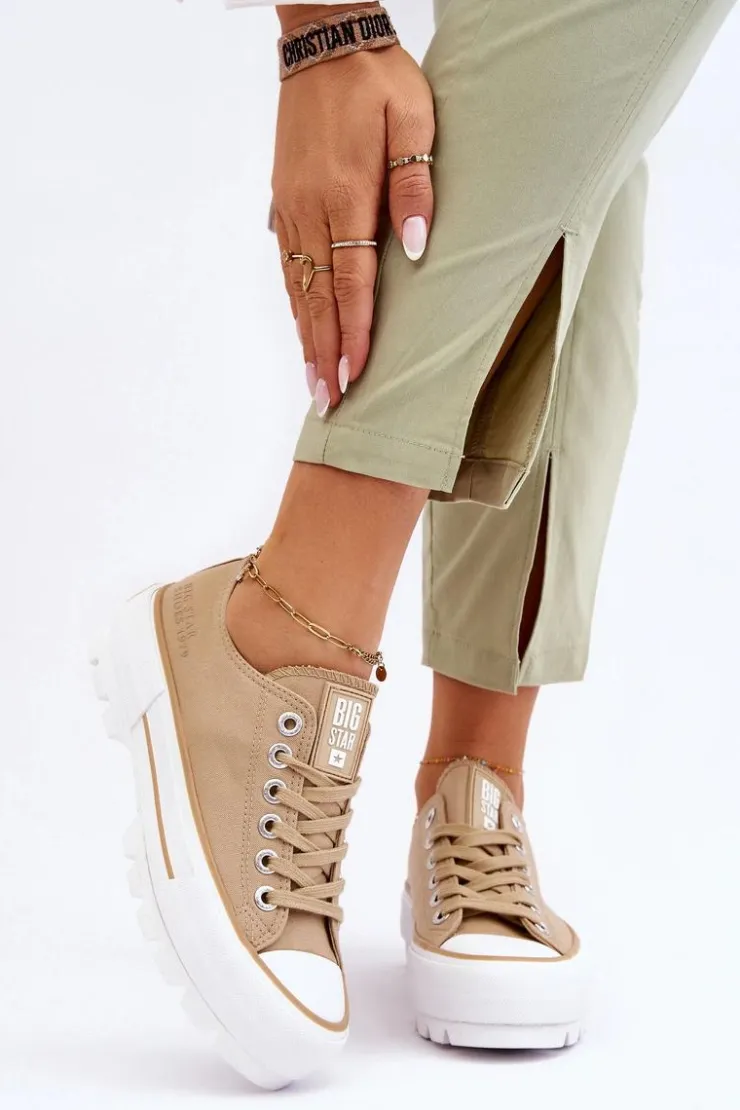 Modne trampki damskie od marki Big Star! Nowoczesny design oraz podeszwa z wysokim bieżnikiem wyróżnia ten model spośród innych! Cholewka wykonana z materiału tekstylnego. Trampki te dodatkowo posiadają delikatnie usztywniany zapiętek. Platforma wraz z podeszwą zostały wykonane z gumowego tworzywa. Przy wyborze rozmiaru prosimy sugerować się tabelą rozmiarów.