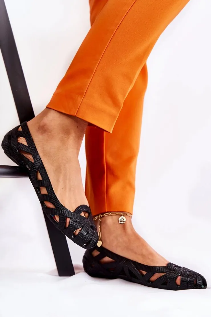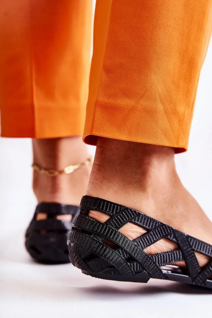 Cudowne baleriny zostały wykonane z gumowego tworzywa. Ozdobny fason z przeplatających się pasków. Baleriny osadzone są na płaskim obcasie z antypoślizgową podeszwą. Nosek w kształcie migdała. Wkładka jest miękka, dzięki której komfort użytkowania jest wysoki. Te baleriny świetnie sprawdzą się w upalne dni! Przy wyborze rozmiaru prosimy sugerować się tabelą rozmiarów.