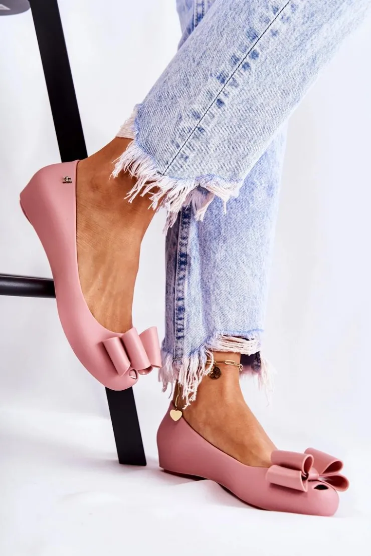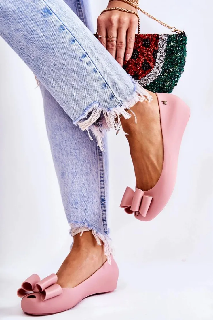 Wyjątkowe baleriny z ozdobną kokardą na przodzie. Dodatkowo na zaokrąglonym nosku znajduje się delikatne wycięcie. Buty zostały wykonane z gumowego tworzywa. Baleriny osadzone są na płaskim obcasie z antypoślizgową podeszwą. Miękka wkładka zapewni komfort podczas użytkowania. Z boku cholewki znajduje się ozdobny element. Te baleriny świetnie sprawdzą się na różnego rodzaju uroczystościach. Przy wyborze rozmiaru prosimy sugerować się tabelą rozmiarów.