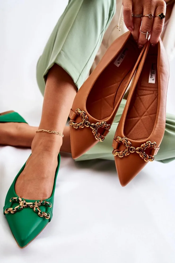 Damskie baleriny z ozdobnym elementem z tworzywa sztucznego na przodzie. Buty wykonane są w całości z eko skóry. Baleriny są niezwykle wygodne, dzięki eko skórzanej wkładce. Posiadają nosek w szpic. Ten model balerin dopełni wiele Twoich stylizacji. Osadzone na płaskim obcasie z antypoślizgową podeszwą. Koniecznie powinnaś sprawdzić także pozostałą kolekcję balerinek! Przy wyborze rozmiaru prosimy sugerować się tabelą rozmiarów.