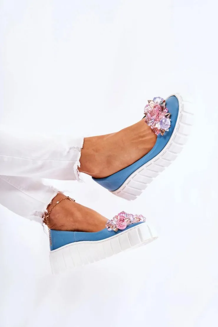 Damskie baleriny wykonane z naturalnej skóry z dbałością o każdy detal. O komfort zadba miękka, skórzana wkładka. Podeszwa wykonana z gumowego tworzywa ze żłobieniami po bokach. Dodatkowo jest antypoślizgowa. Zapiętek jest usztywniany. Z przodu elegancka ozdoba w postaci imitacji kryształków doda tym butom uroku. Nosek zaokrąglony. Baleriny dopełnią wiele Twoich stylizacji. Przy wyborze rozmiaru prosimy sugerować się tabelą rozmiarów.