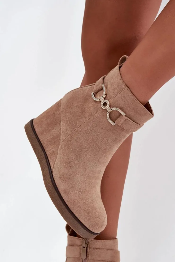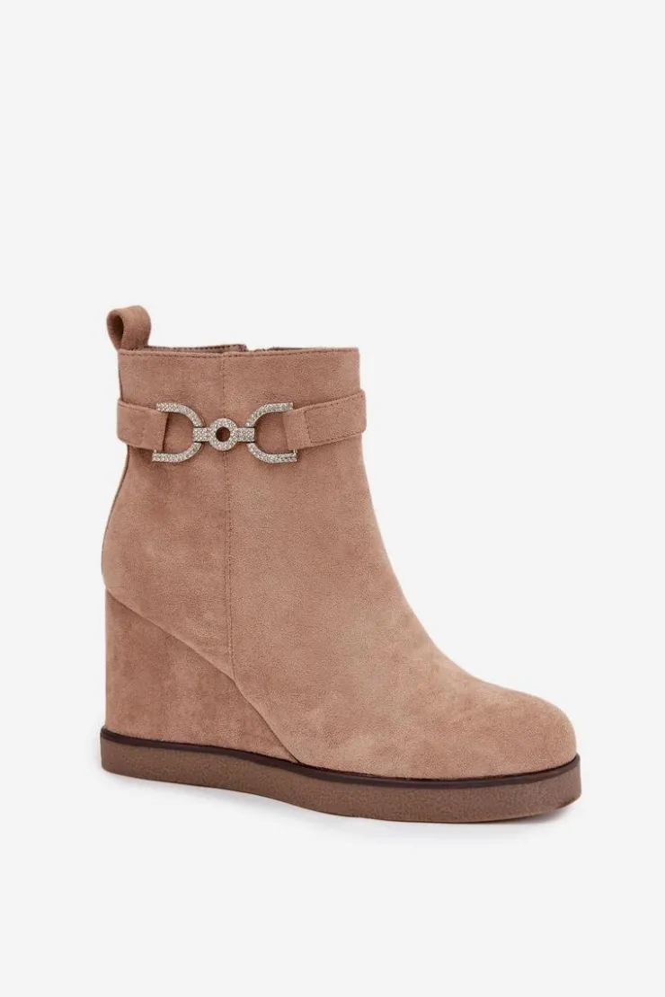 Botki damskie z eko zamszu to stylowa propozycja dla kobiet ceniących wygodę i modny wygląd. Osadzone na koturnie zapewniają komfort noszenia i subtelnie podkreślają sylwetkę, a zaokrąglone noski nadają im klasycznego charakteru. Model wyróżnia się paskiem z ozdobnym detalem umieszczonym na górze cholewki, który dodaje całości eleganckiego akcentu. Zamek po boku ułatwia zakładanie i zdejmowanie, czyniąc buty praktycznym wyborem na co dzień. Przy wyborze rozmiaru prosimy sugerować się tabelą rozmiarów.