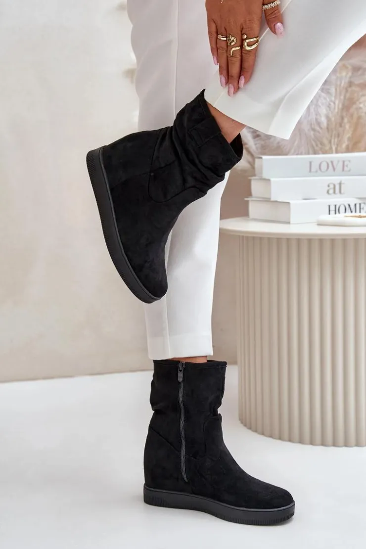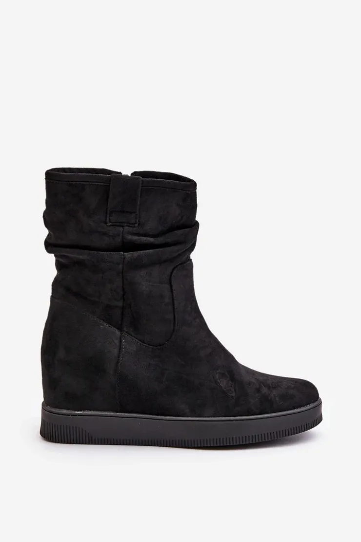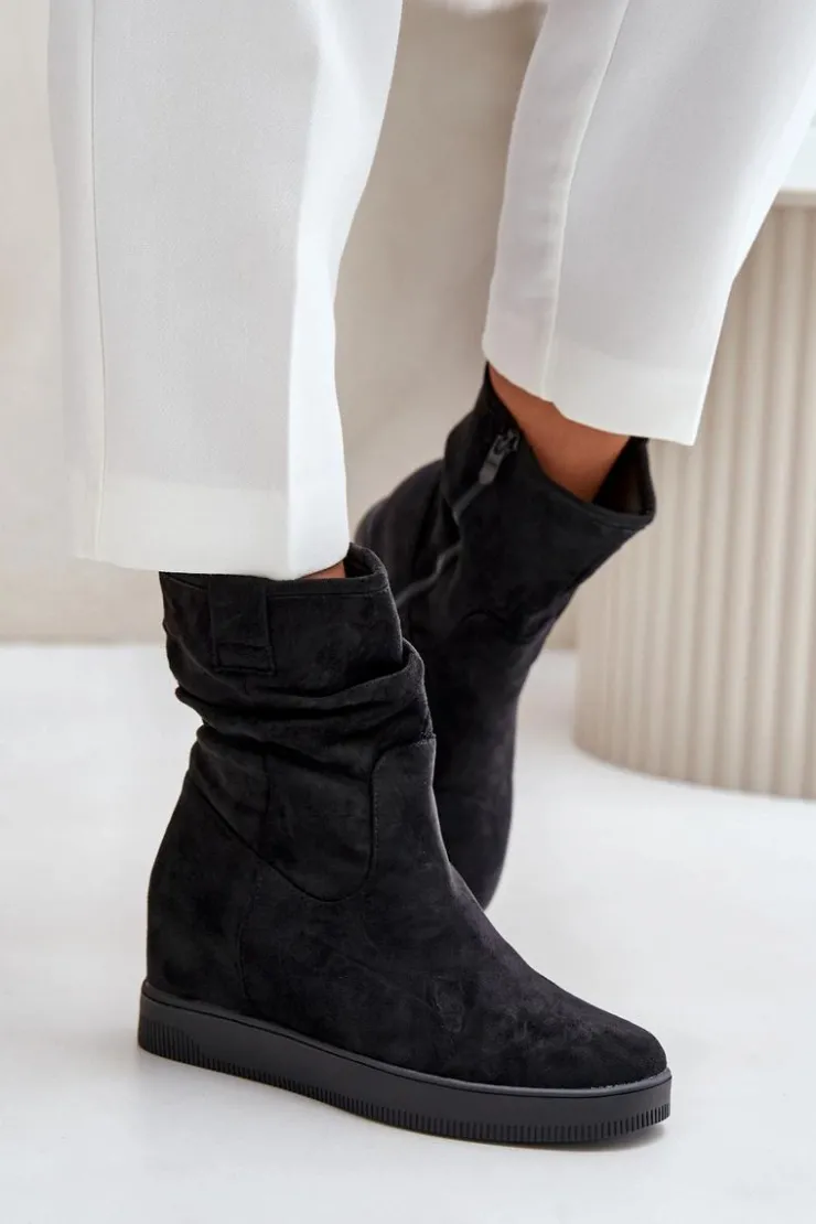 Damskie botki wykonane z eko zamszu. Osadzone na ukrytym koturnie, co subtelnie dodaje centymetrów, nie rezygnując z komfortu. Cholewka ozdobiona marszczeniem, które nadaje całości modnego charakteru. Model zapinany na zamek, co ułatwia zakładanie i zapewnia idealne dopasowanie do nogi. Przy wyborze rozmiaru prosimy sugerować się tabelą rozmiarów.