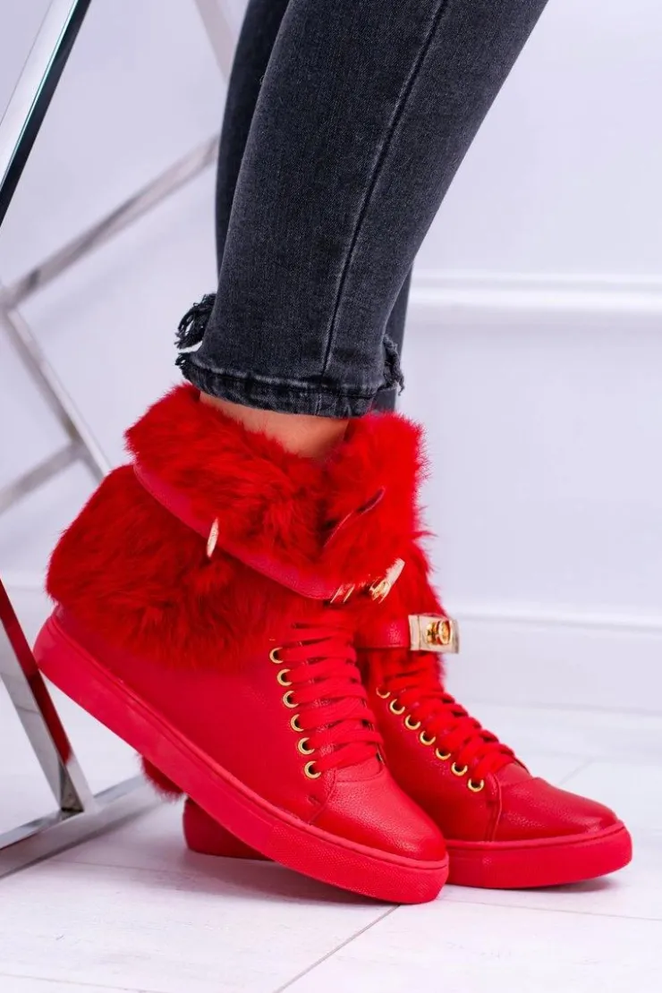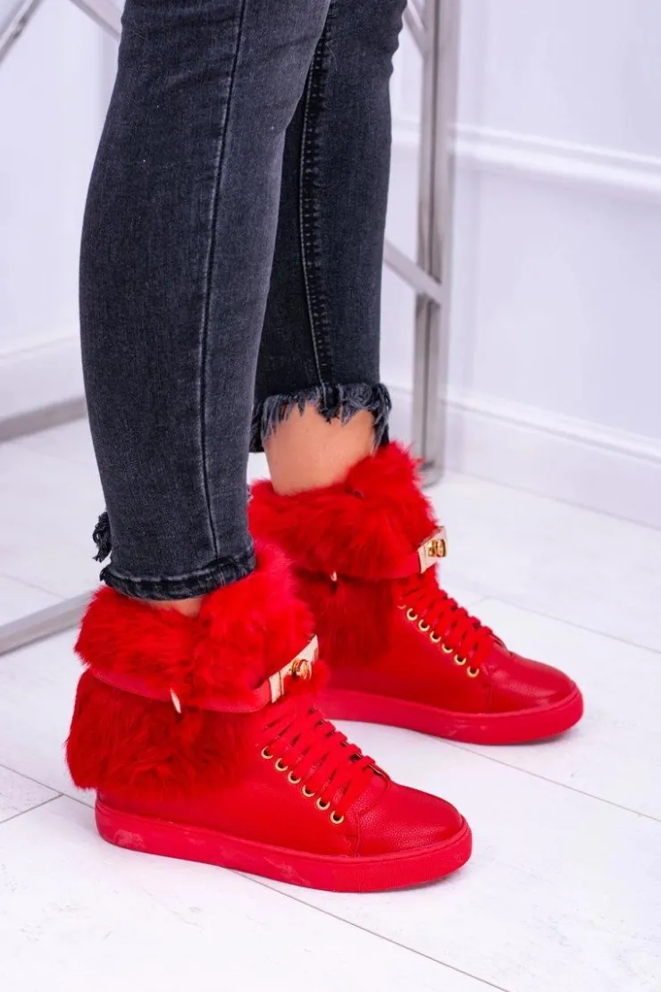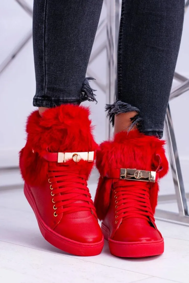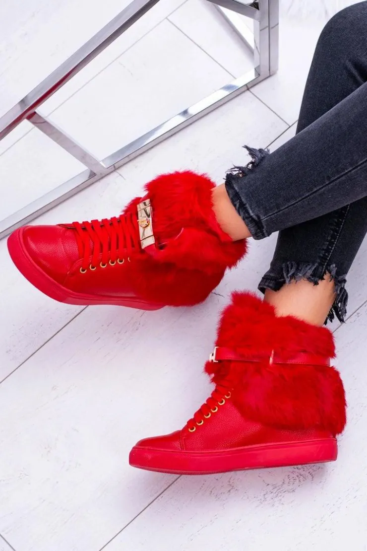 Boto Botki Na Koturnie|Botki Sznurowane*Lu Boo Czerwone Botki z Naturalnym Futrem Gisele