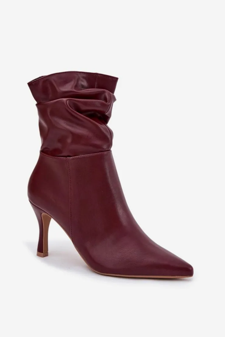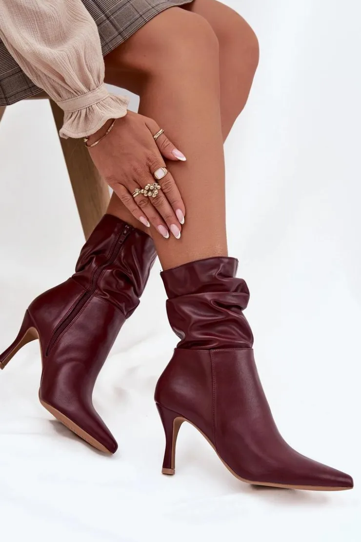 Eleganckie botki damskie z marszczoną cholewką to propozycja pełna kobiecego charakteru. Model ze szpiczastymi noskami i smukłą szpilką podkreśla nogi i dodaje stylu każdej stylizacji. Zamek z boku ułatwia szybkie zakładanie i idealne dopasowanie do stopy, czyniąc botki świetnym wyborem na wieczorne wyjścia i eleganckie okazje. Przy wyborze rozmiaru prosimy sugerować się tabelą rozmiarów.