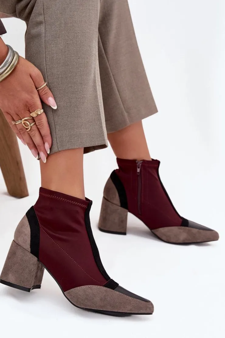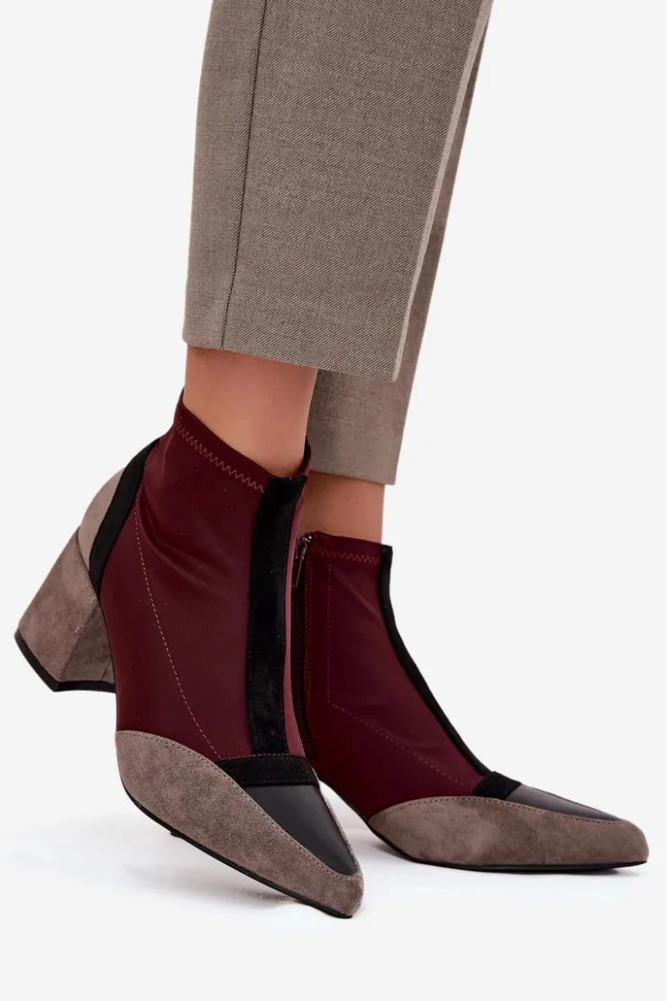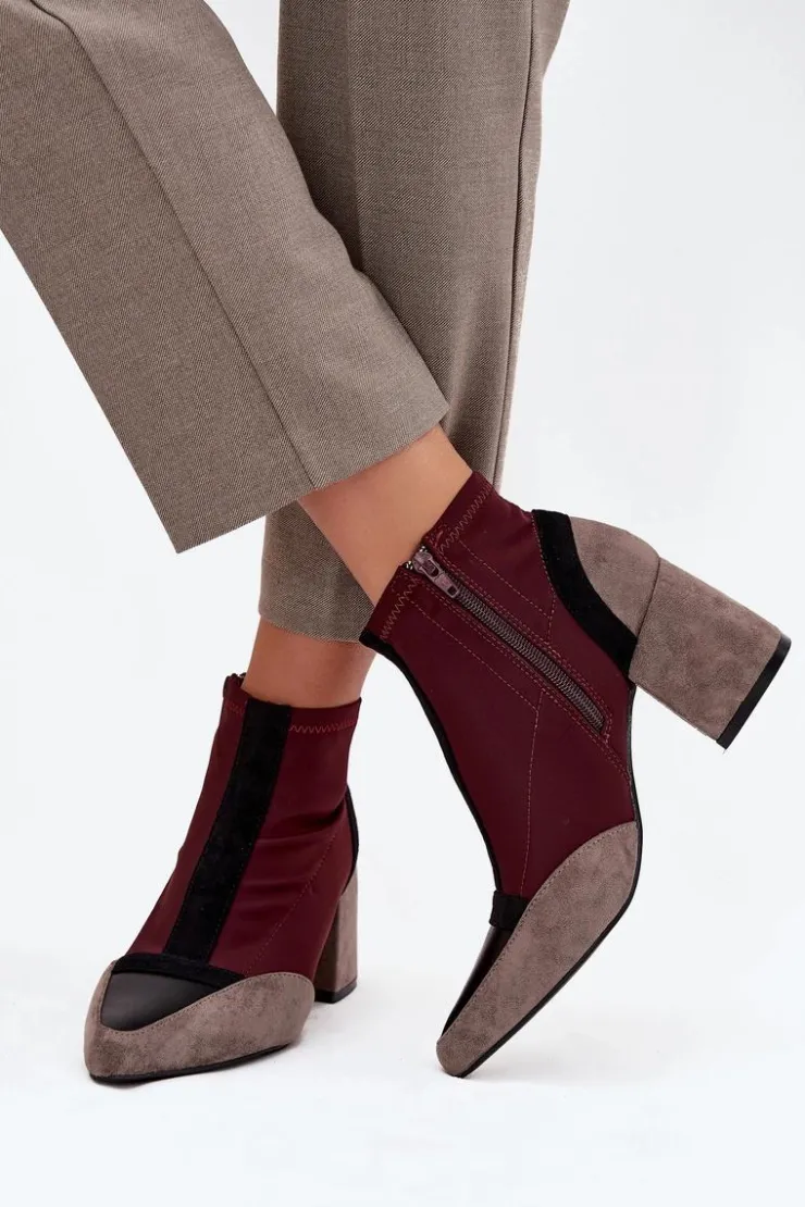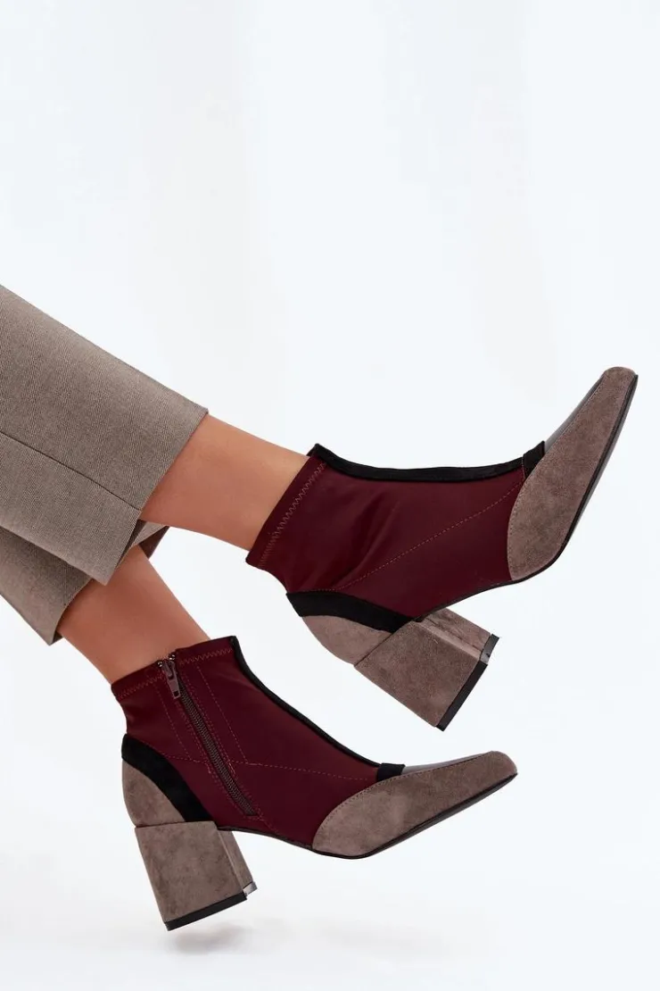 Botki damskie wykonane z połączenia materiału tekstylnego i eko zamszu to propozycja, która łączy oryginalny design z elegancją. Kontrastowe wstawki dodają całości modnego charakteru i sprawiają, że buty prezentują się wyjątkowo stylowo. Smukłe, szpiczaste noski optycznie wysmuklają stopę, podkreślając kobiecy wygląd i nadając sylwetce lekkości. Model osadzony jest na masywnym obcasie typu słupek, który zapewnia stabilność i wygodę podczas noszenia, a jednocześnie pięknie podkreśla linię nóg. Botki zapinane są na praktyczny zamek, co ułatwia zakładanie i zdejmowanie obuwia. To idealny wybór dla kobiet, które chcą połączyć komfort z nowoczesnym stylem – świetnie sprawdzą się zarówno w eleganckich stylizacjach, jak i w codziennych zestawach. Przy wyborze rozmiaru prosimy sugerować się tabelą rozmiarów.
