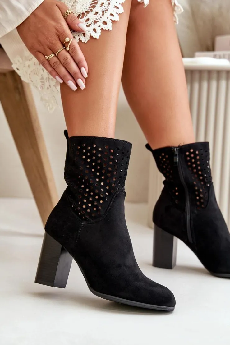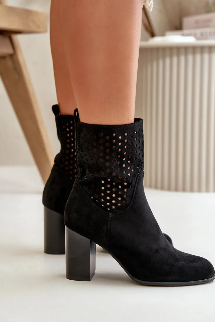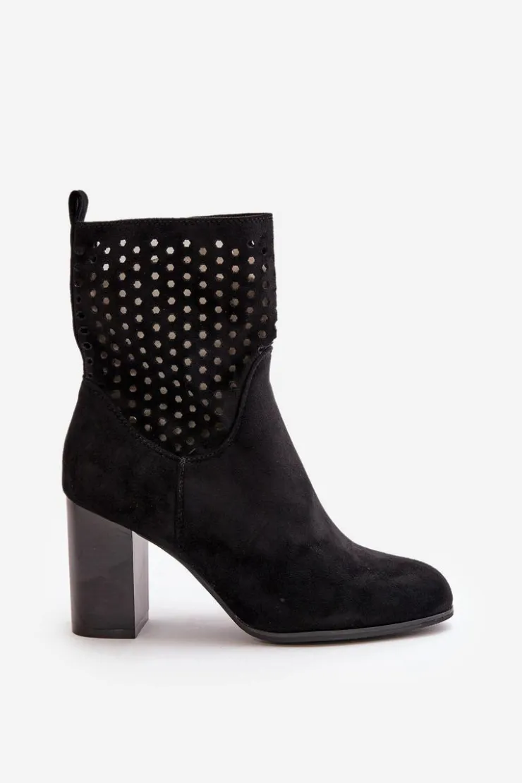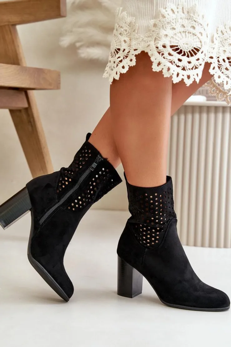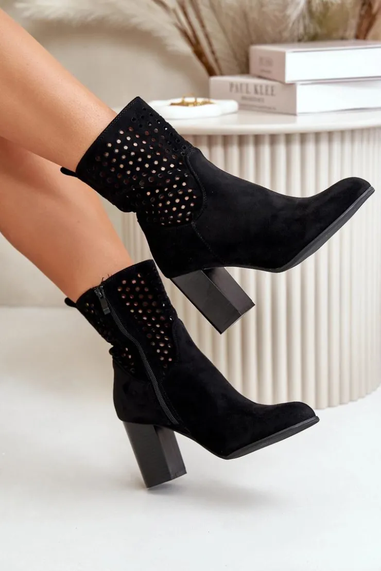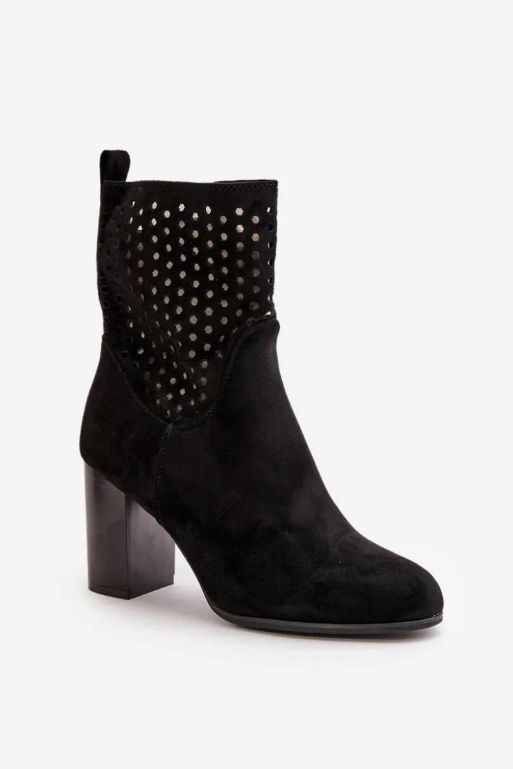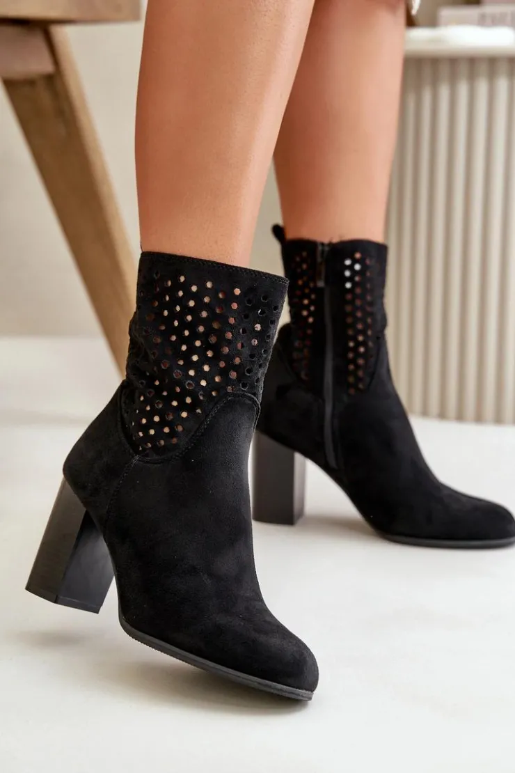 Botki damskie z ażurową cholewką. Wykonane z eko zamszu. Zapinane na zamek, co ułatwia zakładanie i zdejmowanie, oraz zapewnia dobre dopasowanie do stopy. Botki osadzone są na stabilnym obcasie typu słupek, który podkreśla kobiecy wygląd, dodaje kilku centymetrów wzrostu i zapewnia wygodę noszenia. Te stylowe botki świetnie komponują się z różnorodnymi stylizacjami, od casualowych po bardziej eleganckie, będąc doskonałym wyborem na każdą okazję. Przy wyborze rozmiaru prosimy sugerować się tabelą rozmiarów.