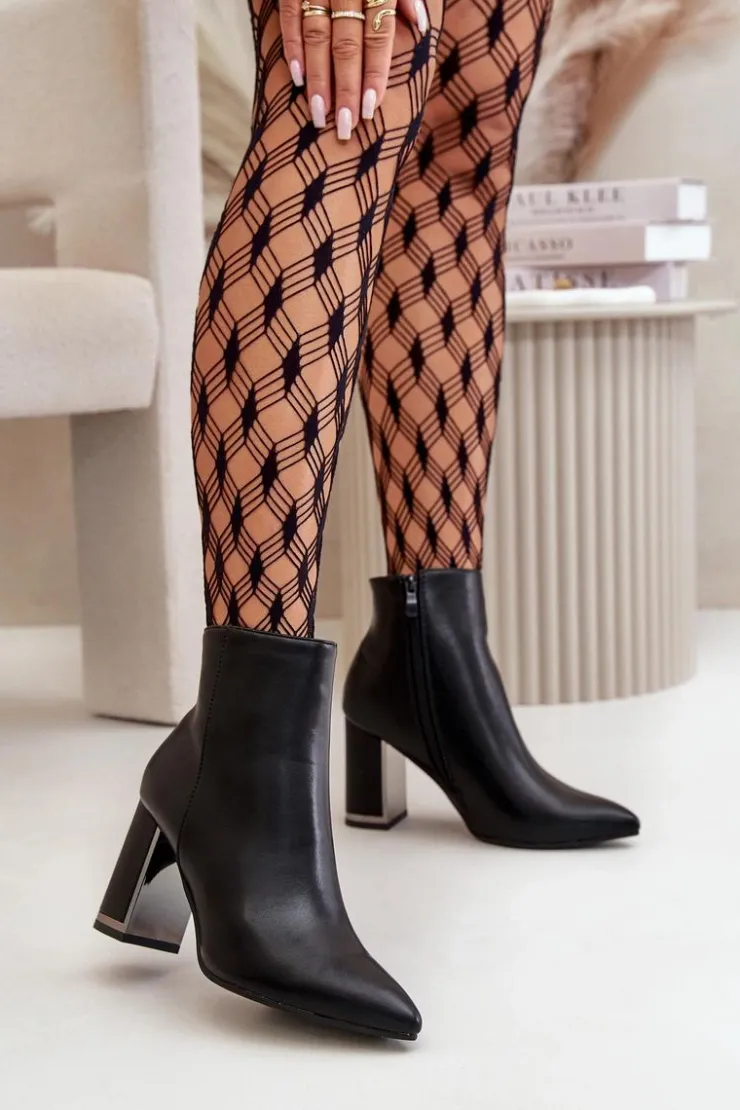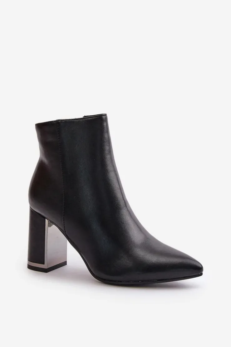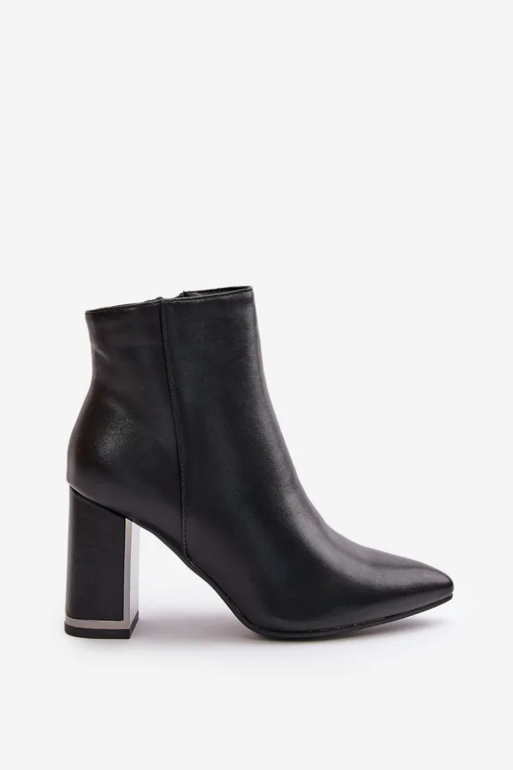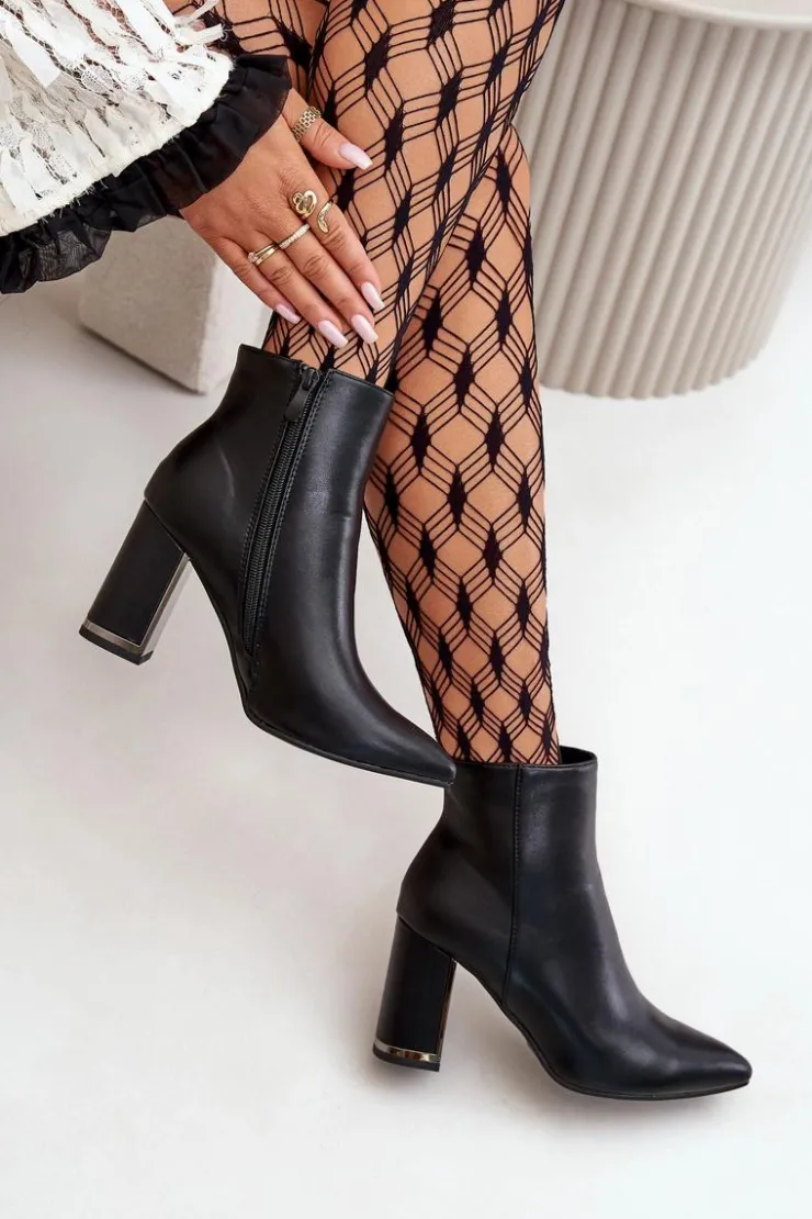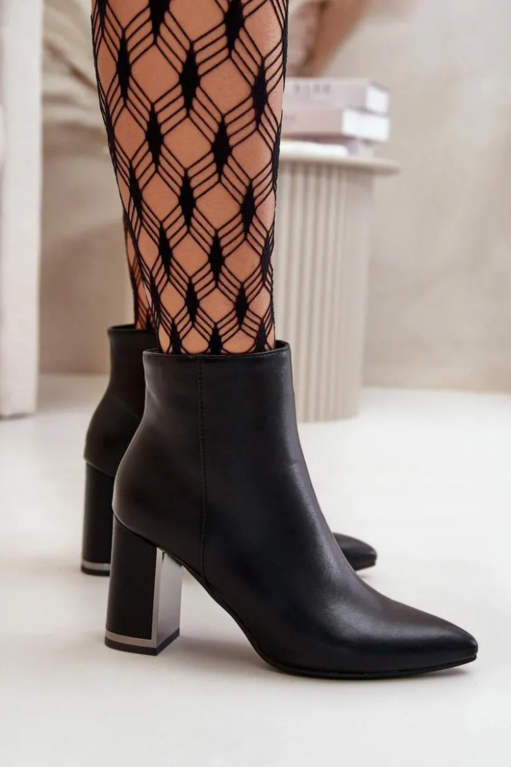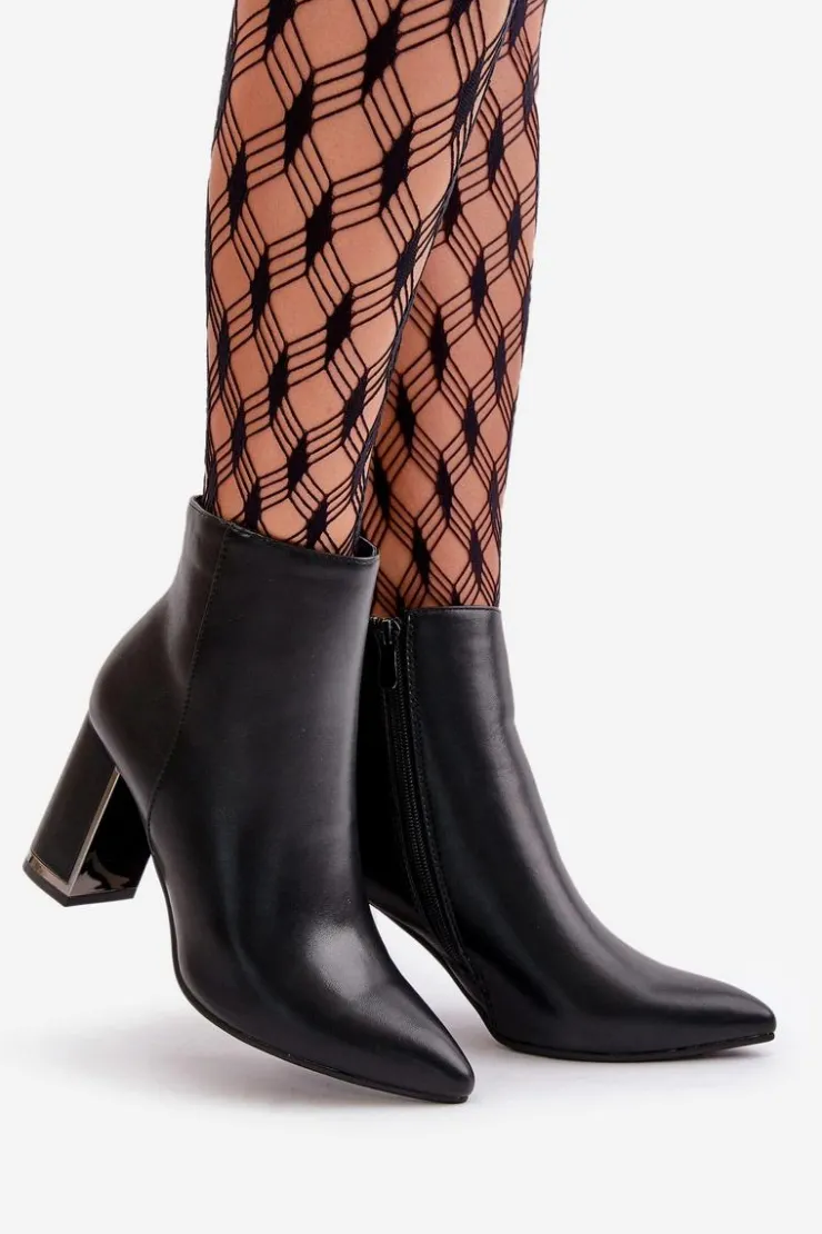 Damskie botki wykonane z eko skóry. Wnętrze jest ocieplane, co zapewnia ciepło i komfort w chłodniejsze dni. Noski w szpic nadają im stylowego charakteru, a obcas w formie stabilnego słupka jest dodatkowo ozdobiony lustrzanym elementem, co dodaje botkom wyjątkowego blasku i modnego akcentu. Koniecznie powinnaś je mieć w swojej jesienno-zimowej garderobie! Przy wyborze rozmiaru prosimy sugerować się tabelą rozmiarów.