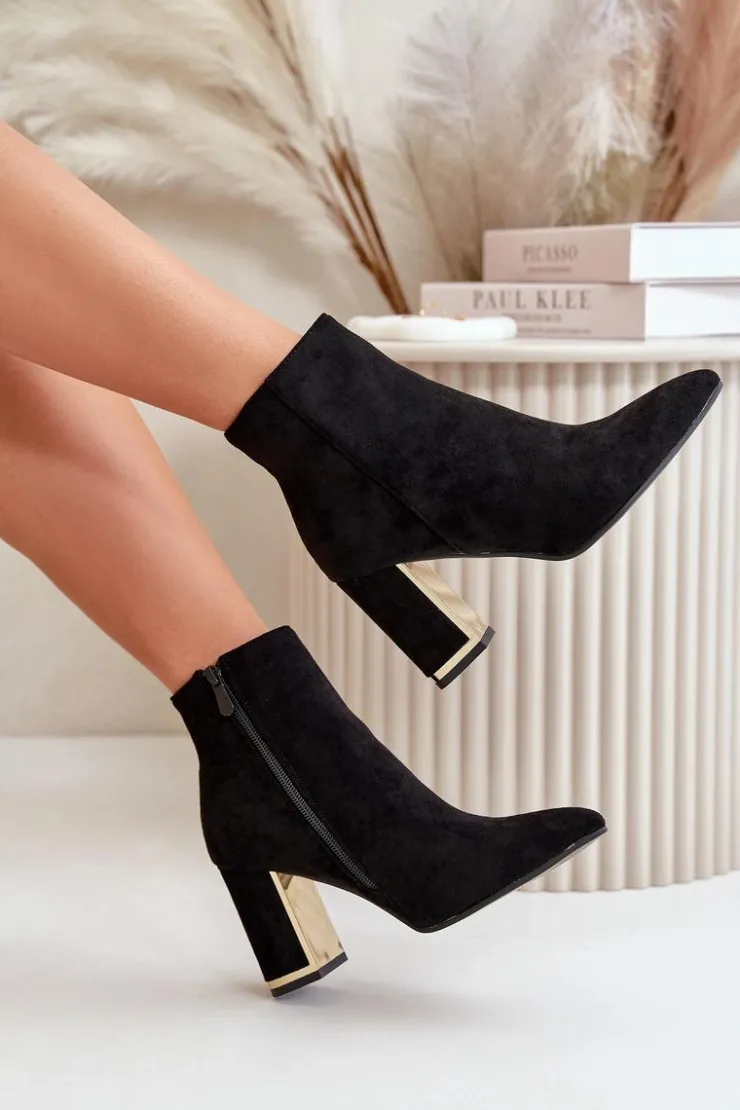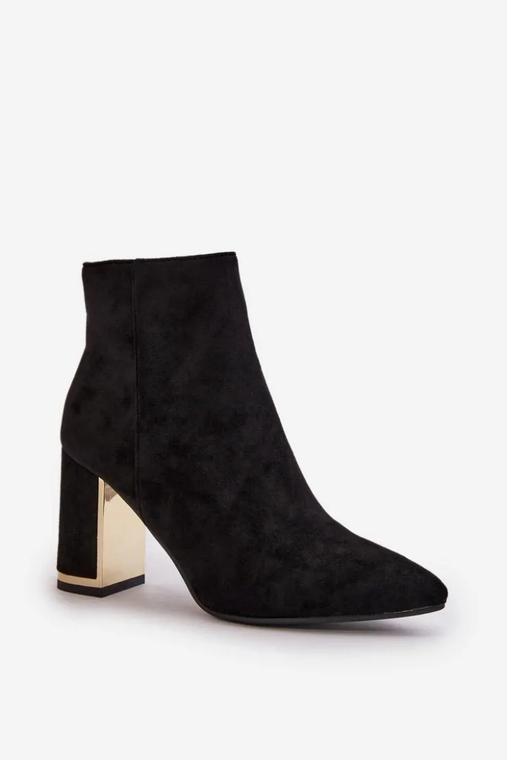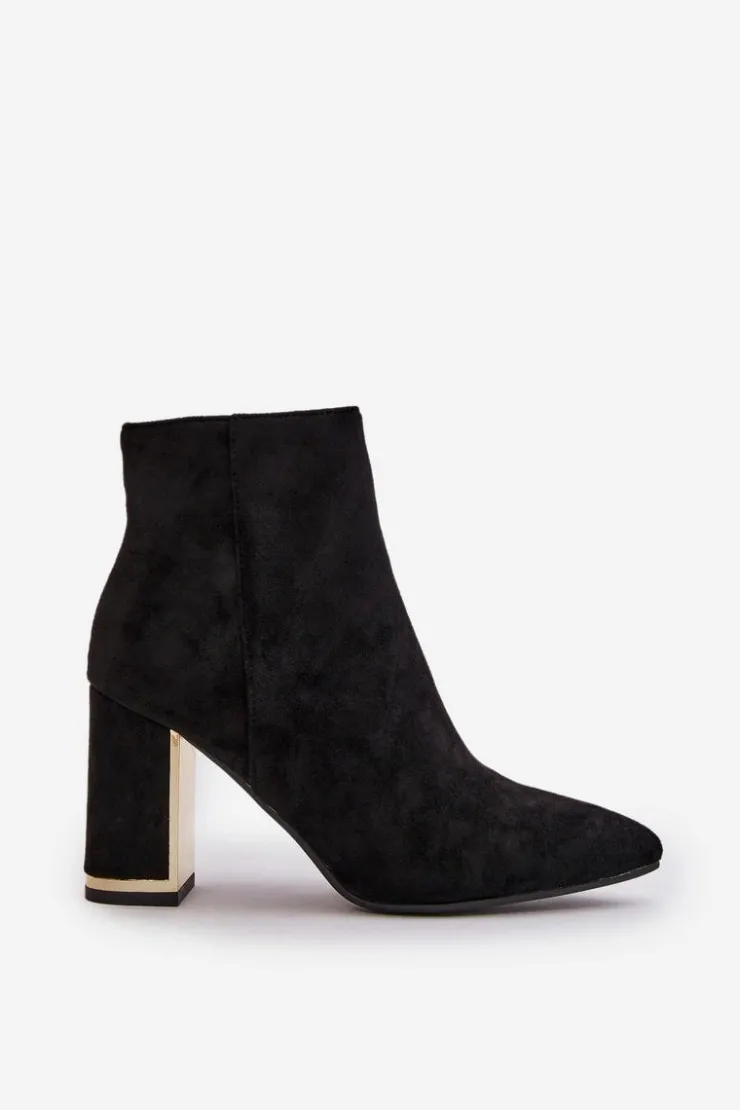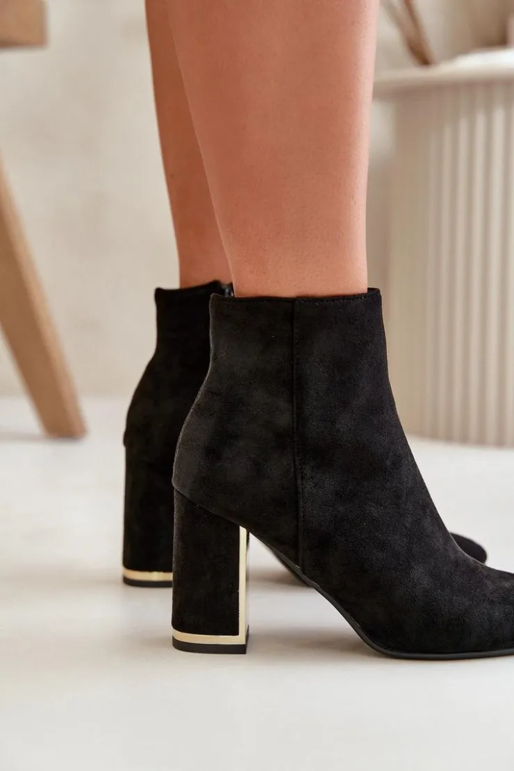 Damskie botki wykonane z eko zamszu, który jest przyjemny w dotyku i dodaje im eleganckiego wyglądu. Wnętrze botków jest ocieplane, co zapewnia ciepło i komfort w chłodniejsze dni. Noski w szpic nadają im stylowego charakteru, a obcas w formie stabilnego słupka jest dodatkowo ozdobiony lustrzanym elementem, co dodaje botkom wyjątkowego blasku i modnego akcentu. Koniecznie powinnaś je mieć w swojej jesienno-zimowej garderobie! Przy wyborze rozmiaru prosimy sugerować się tabelą rozmiarów.